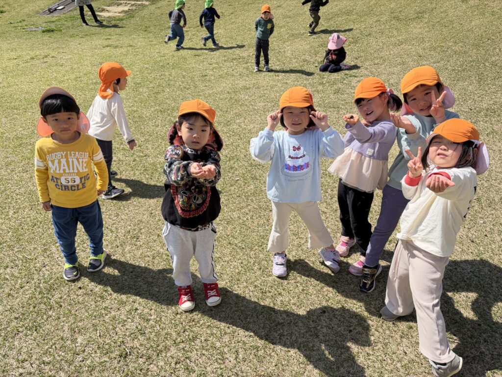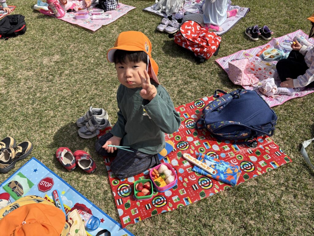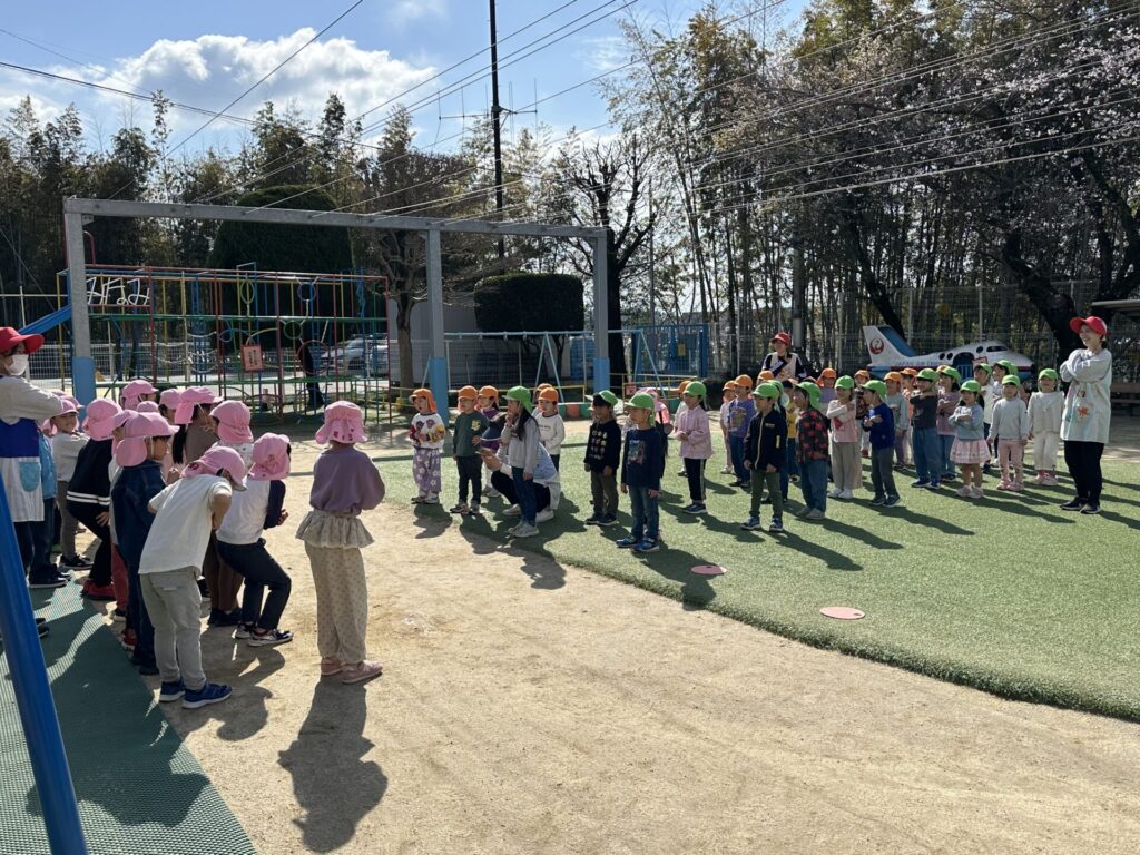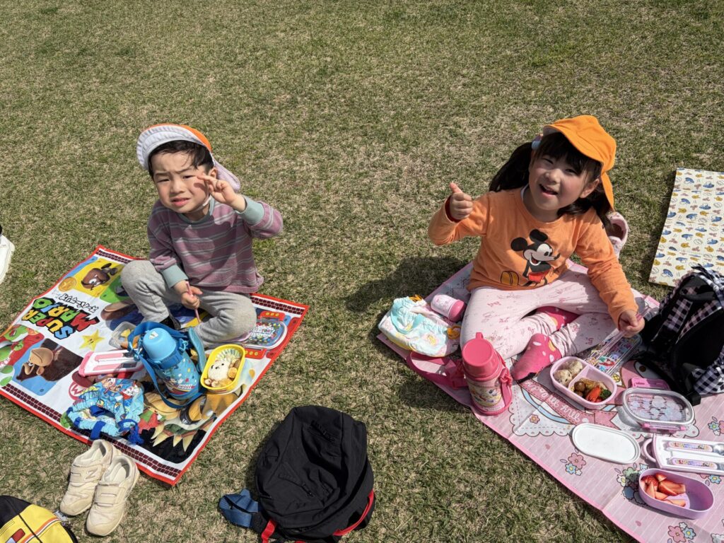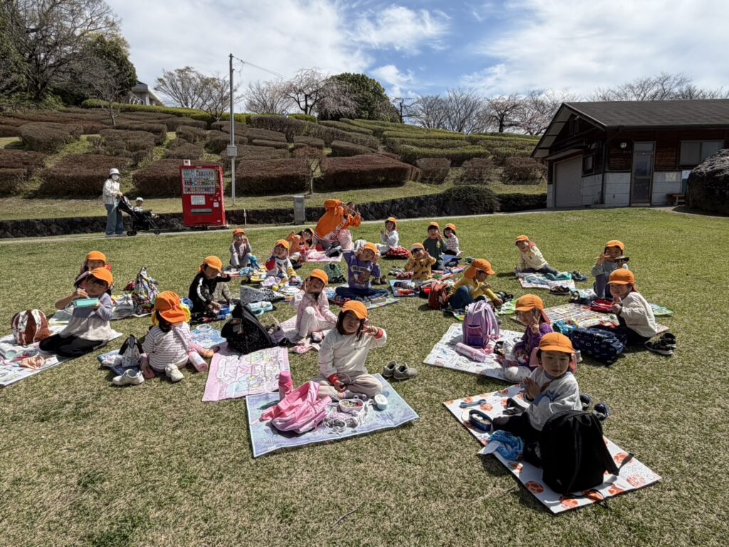 202603.26 お別れ遠足① 今日は、お別れ遠足でした! 天候に恵まれて、以上児クラスは園庭でレクレーションをした後、妙泉寺公園にいって沢山遊びました! みんな大好きお弁当の時間は、ハイテンションで大盛り上がりでしたよ✨ ●園庭でのレクレーション ●さくら組