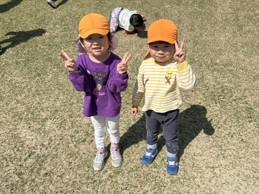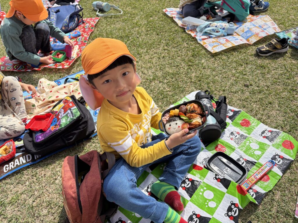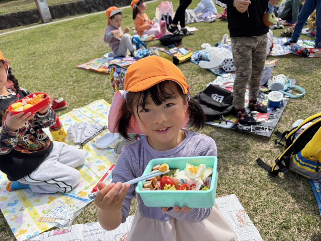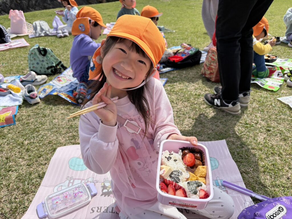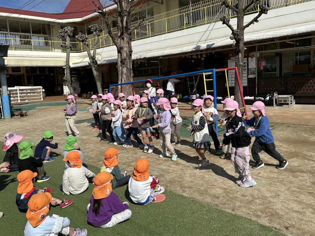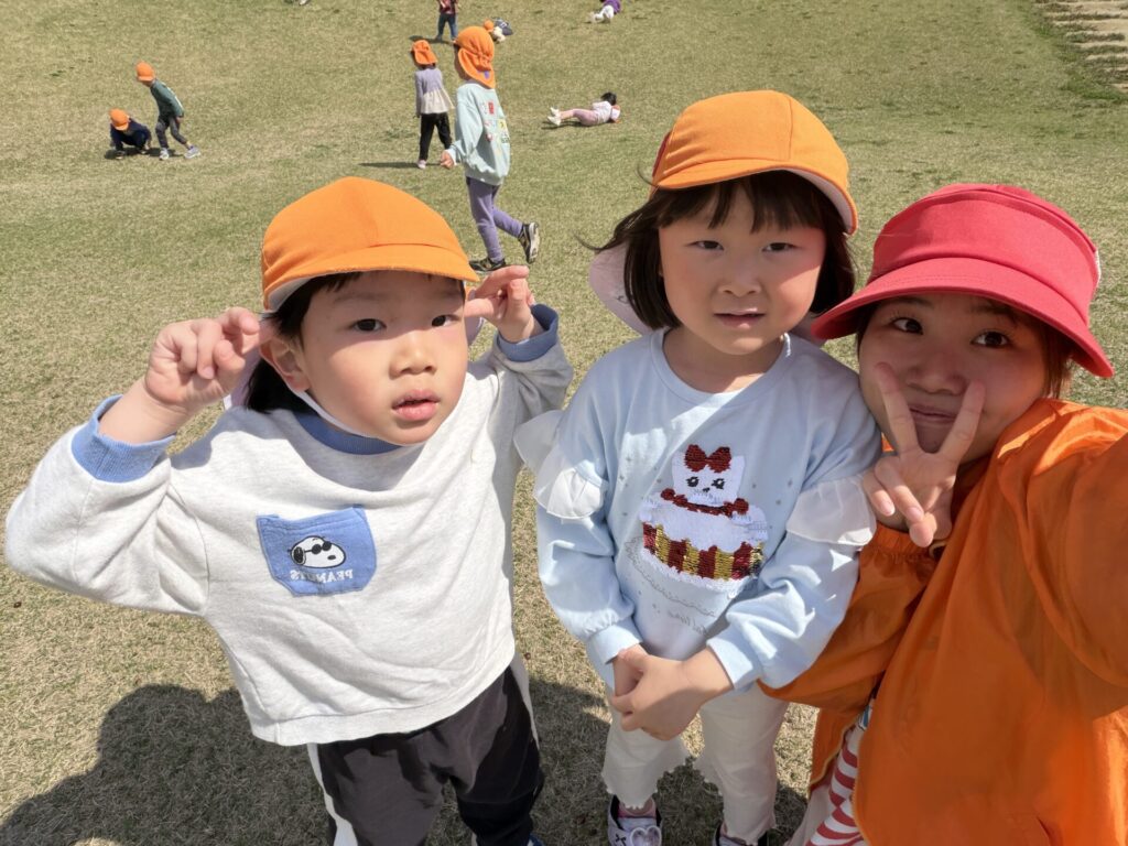 202603.26 お別れ遠足① 今日は、お別れ遠足でした! 天候に恵まれて、以上児クラスは園庭でレクレーションをした後、妙泉寺公園にいって沢山遊びました! みんな大好きお弁当の時間は、ハイテンションで大盛り上がりでしたよ✨ ●園庭でのレクレーション ●さくら組