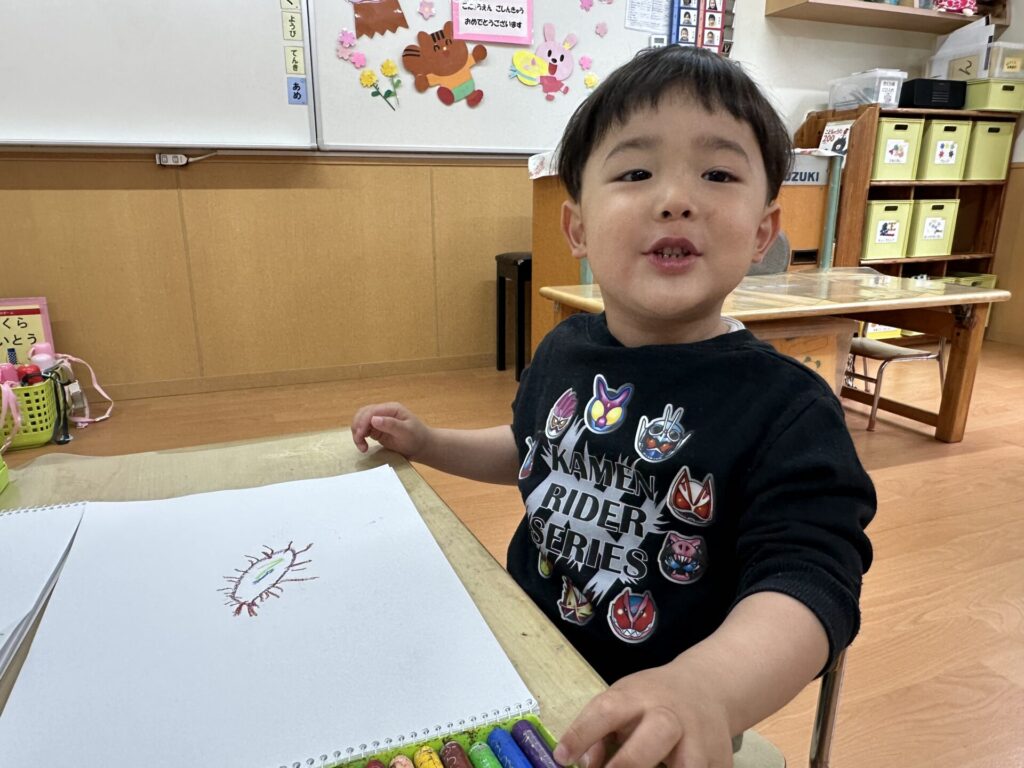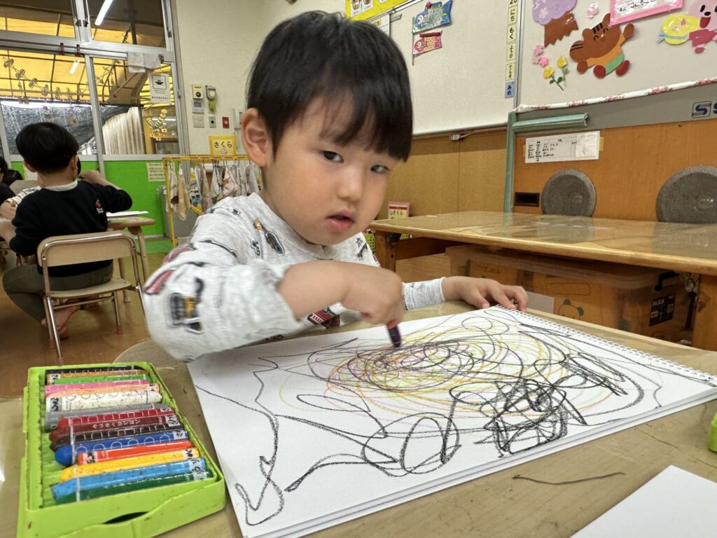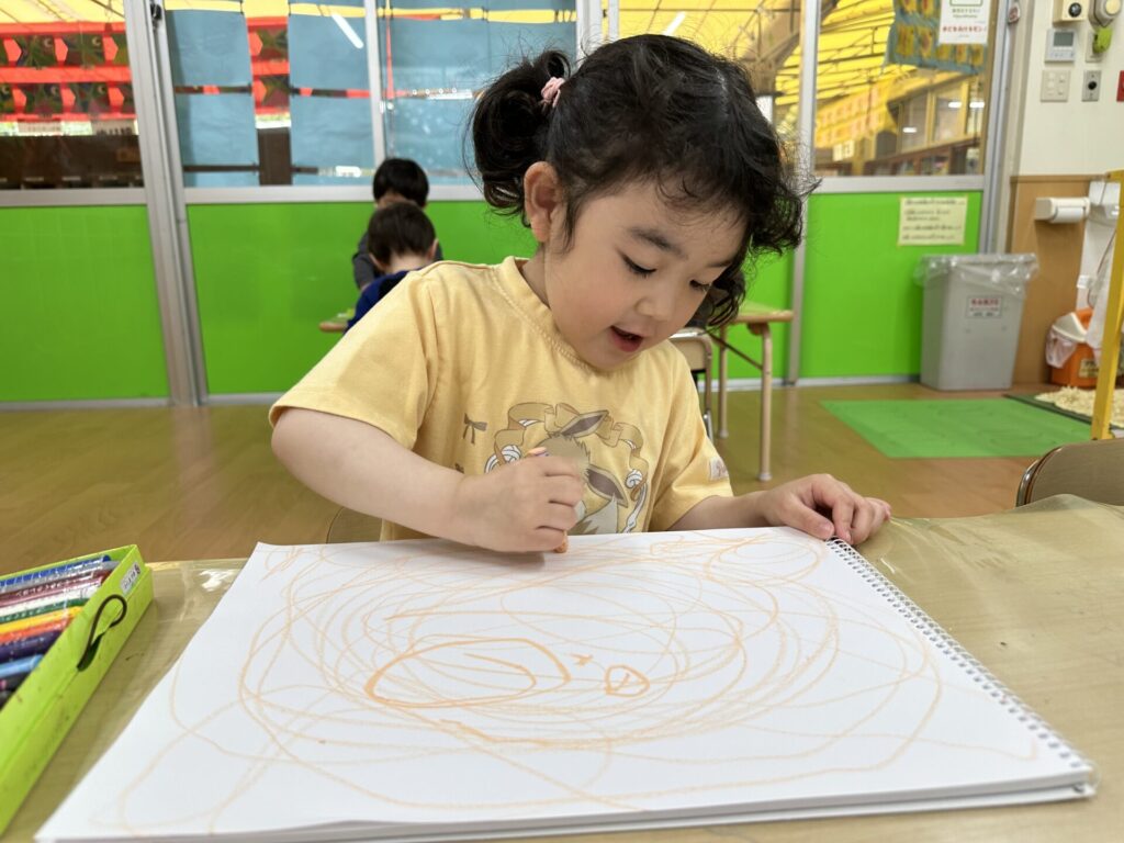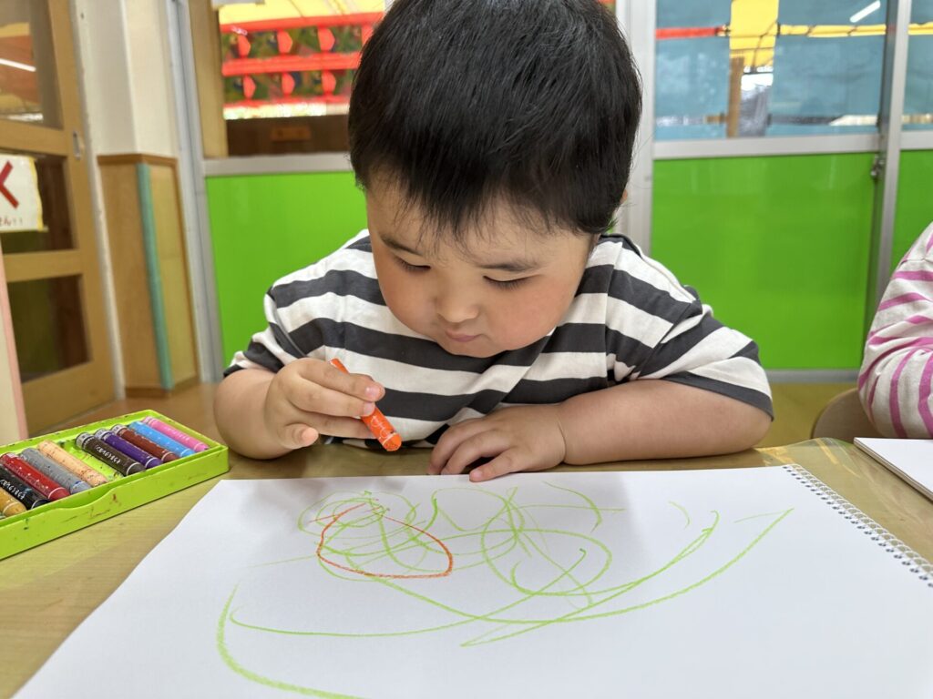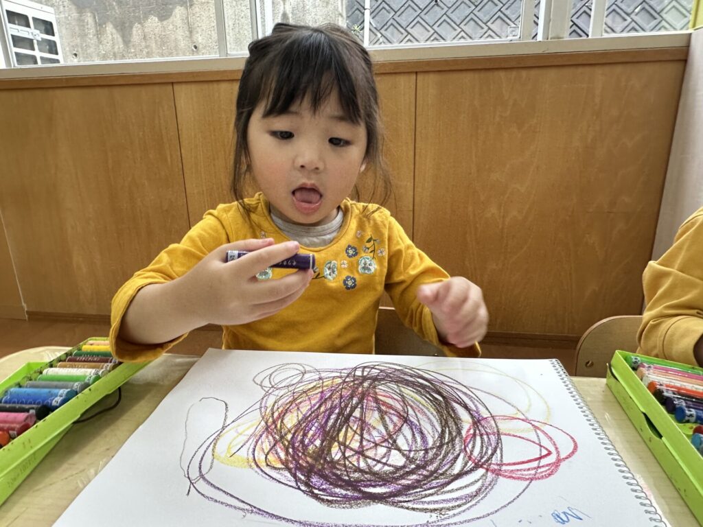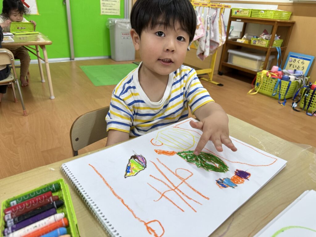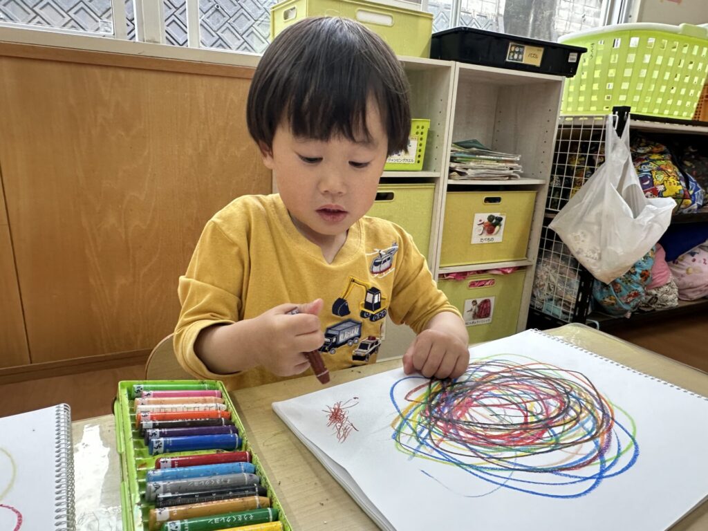 202604.24 さくら組(クレヨンでお絵描きしたよ!) ●4/23(木)クレヨンでお絵描きをしました! 1人1冊ある自由が帳を嬉しそうに手に取り、お絵描きを楽しみました✨ 「これ、ママ!!」「これ、アイス!!」と描いたものを教えてくれました💖
