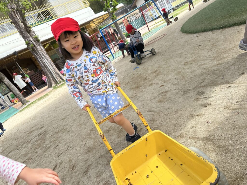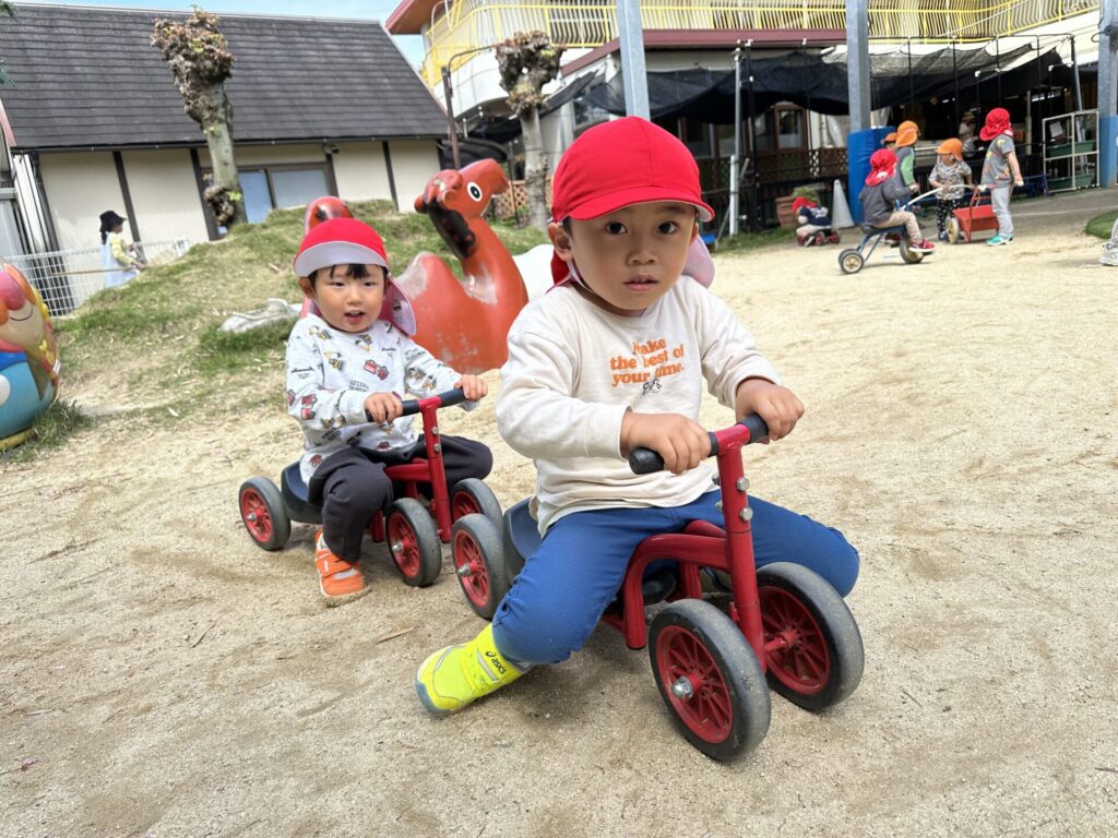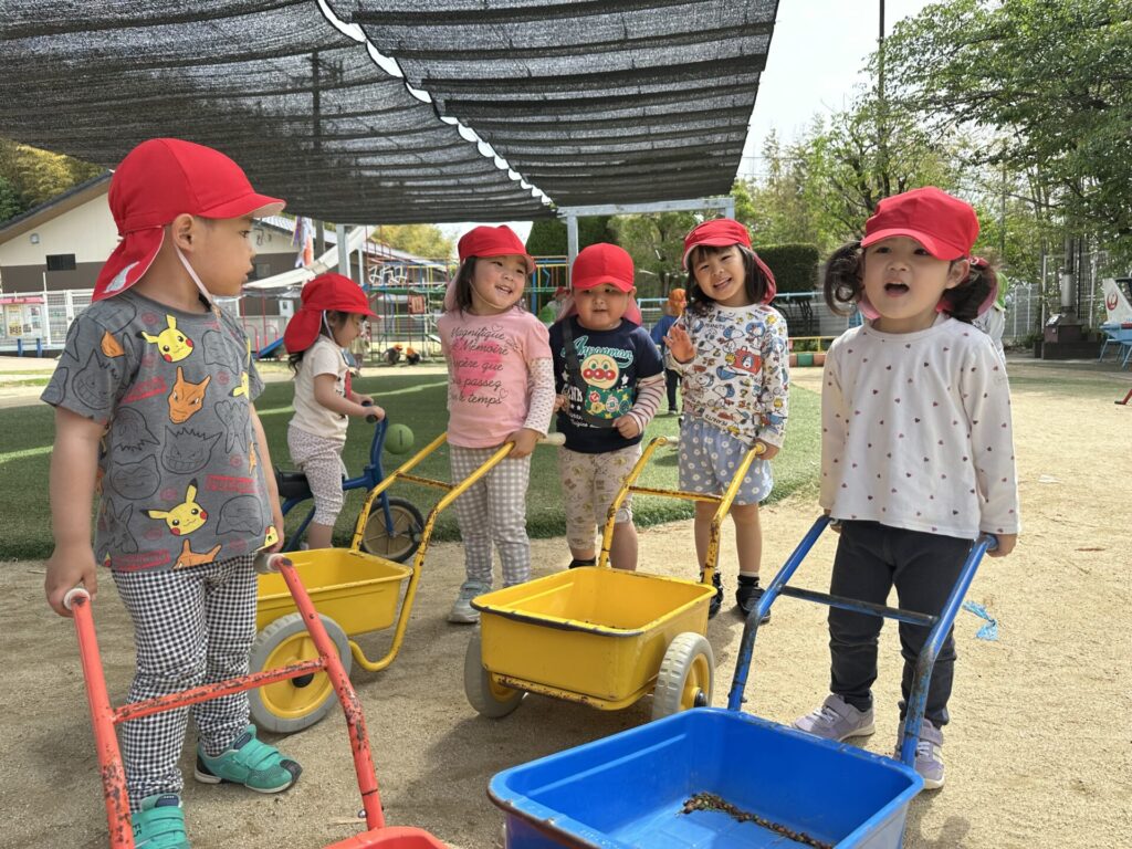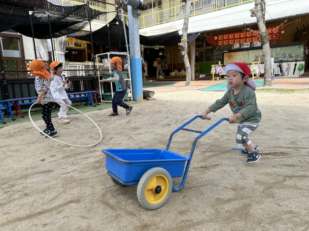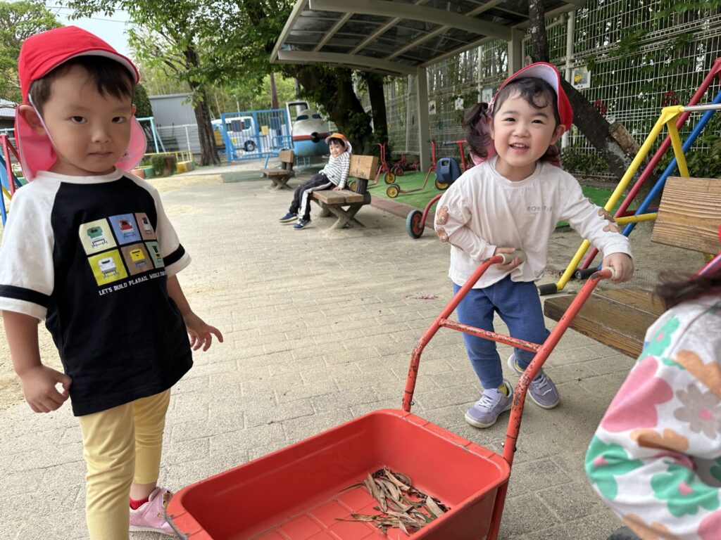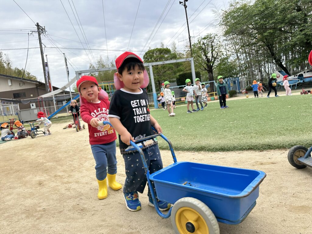 202604.22 さくら組(戸外遊び) 朝から5月のこども祭りの練習をしています。エビカニ音頭を踊ったり、 2列に並んで「わっしょい!わっしょい!」と掛け声を出しながら歩いたり、 子ども達も頑張っています✨ 戸外遊びでは昨日から押し車を出しています。 押し車、三輪車、バギー遊びが盛り上がっています🎶