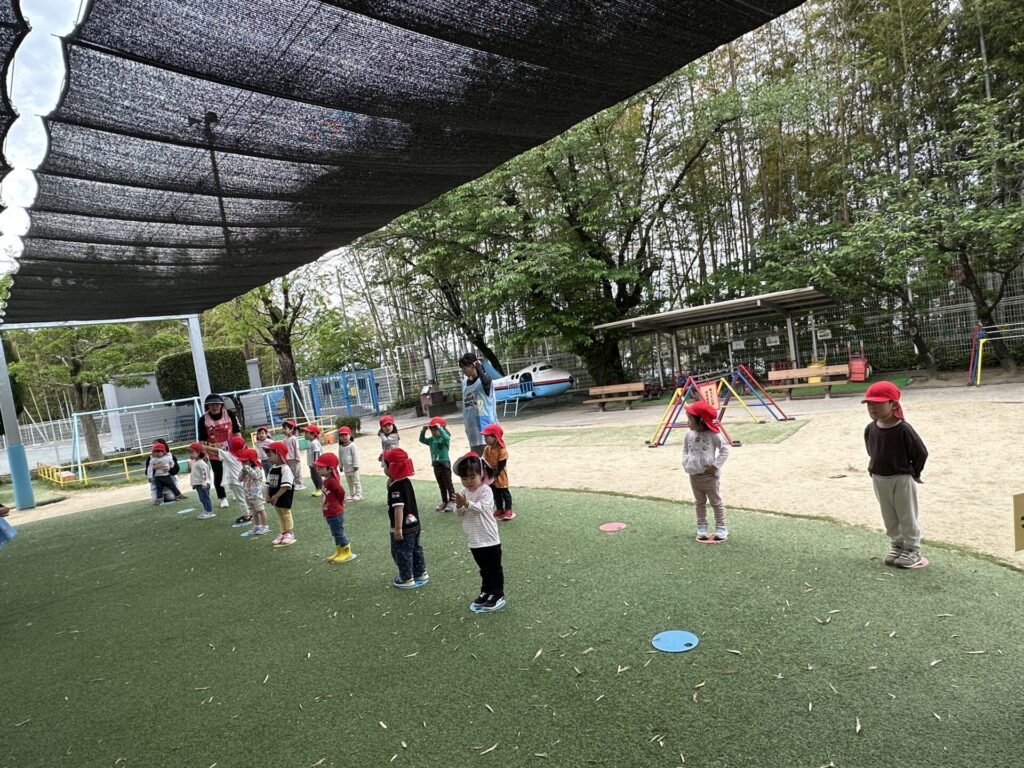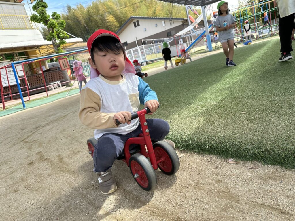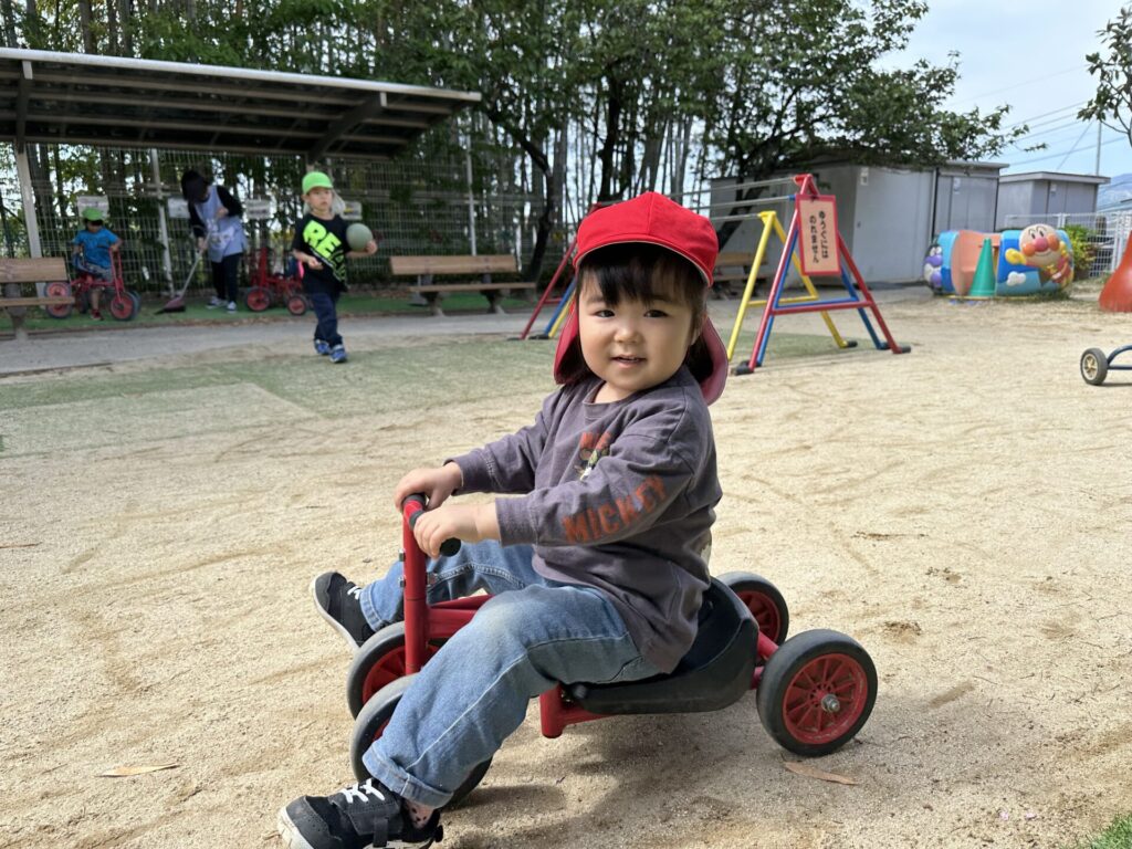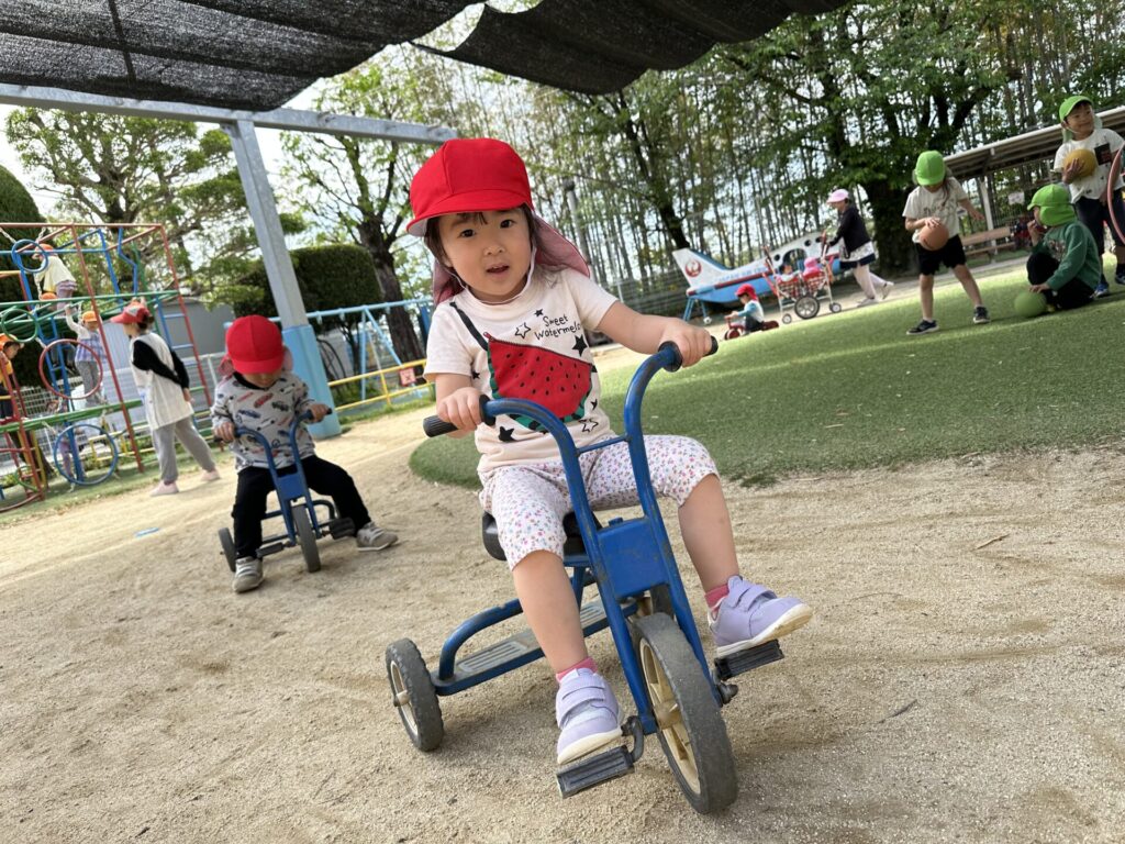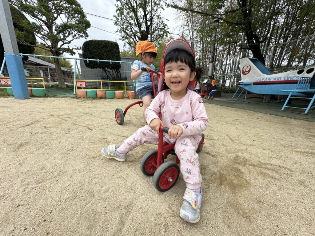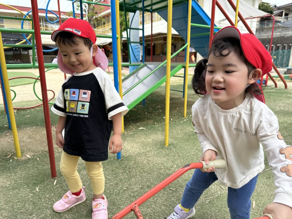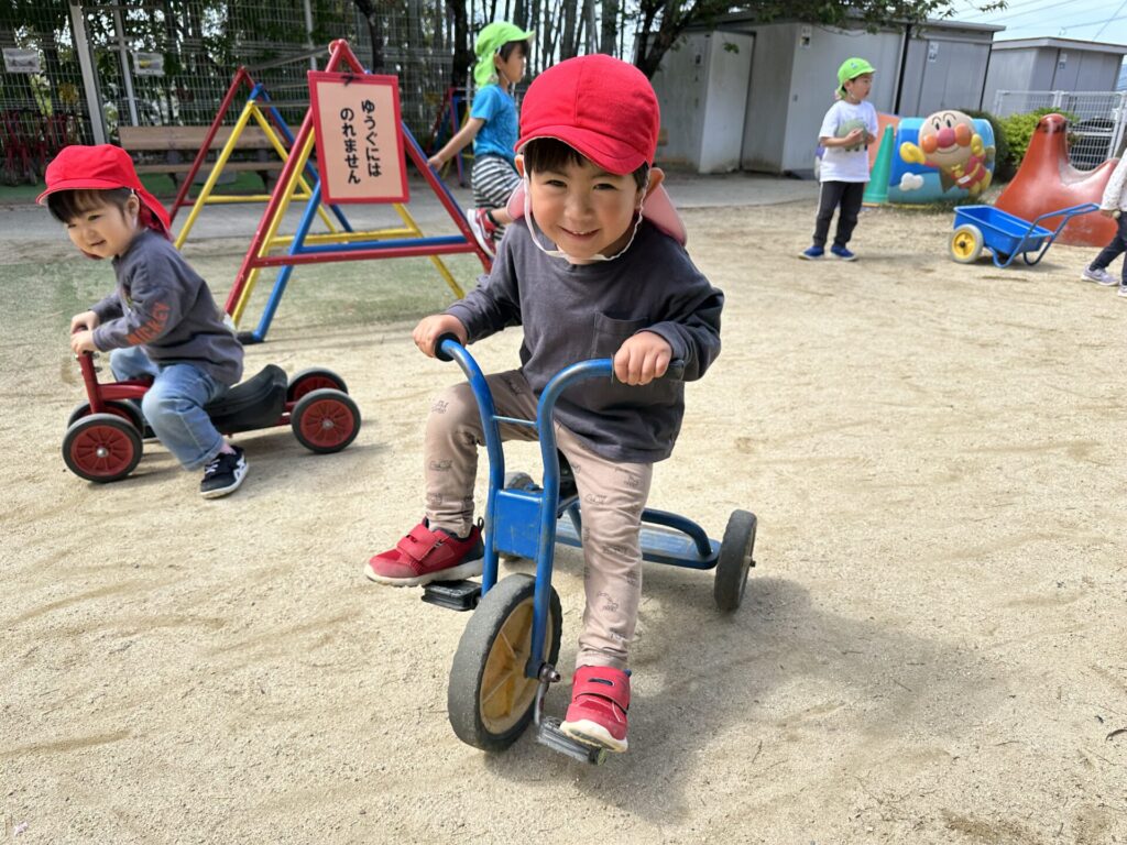 202604.22 さくら組(戸外遊び) 朝から5月のこども祭りの練習をしています。エビカニ音頭を踊ったり、 2列に並んで「わっしょい!わっしょい!」と掛け声を出しながら歩いたり、 子ども達も頑張っています✨ 戸外遊びでは昨日から押し車を出しています。 押し車、三輪車、バギー遊びが盛り上がっています🎶