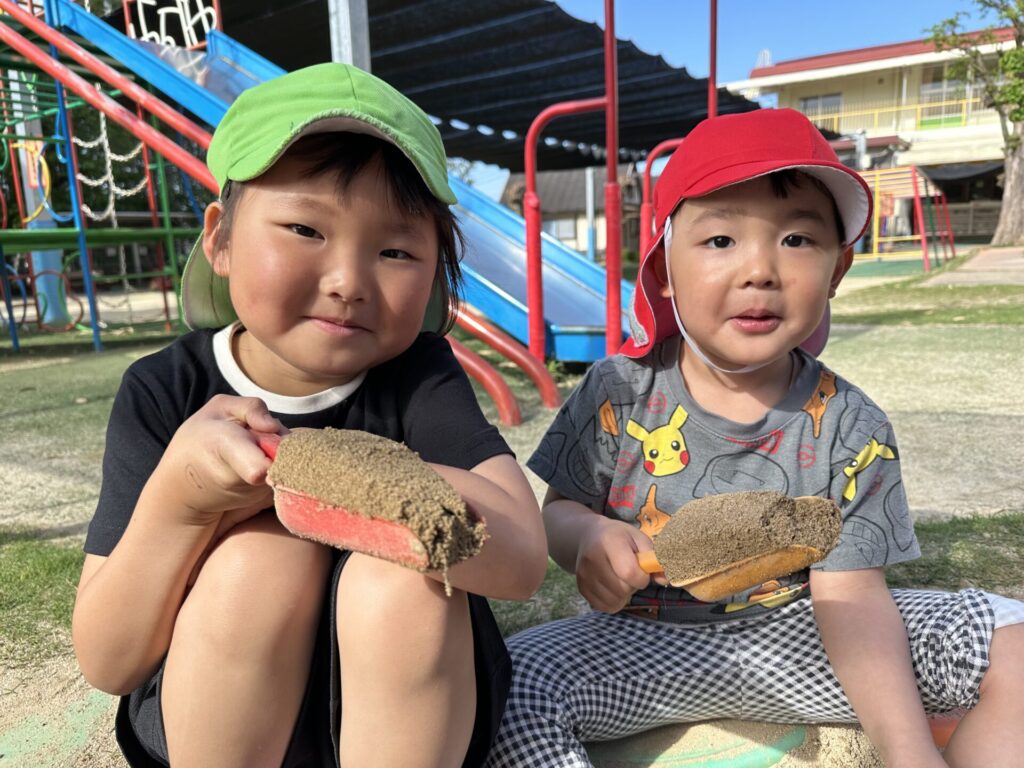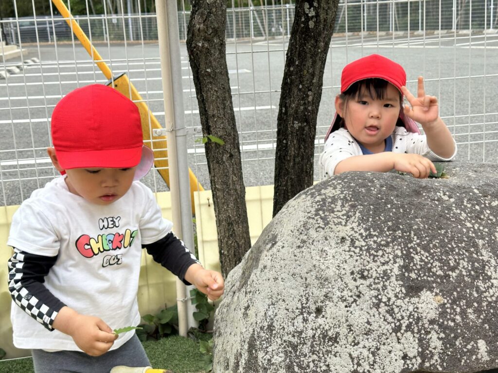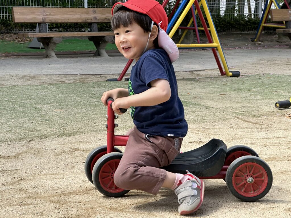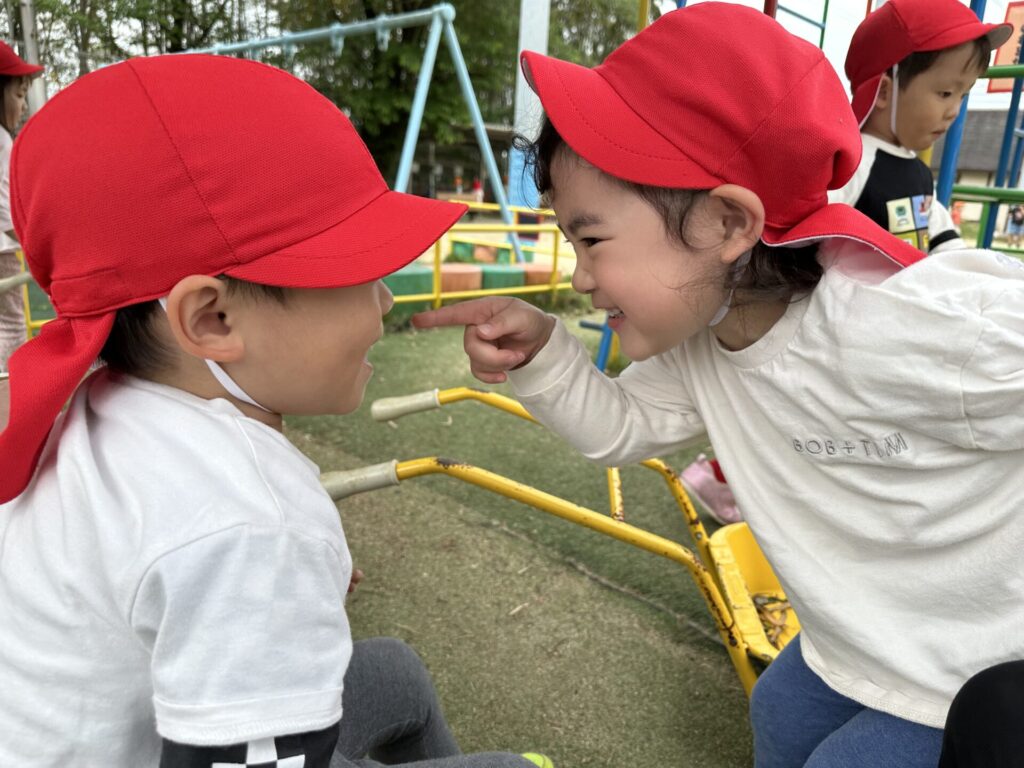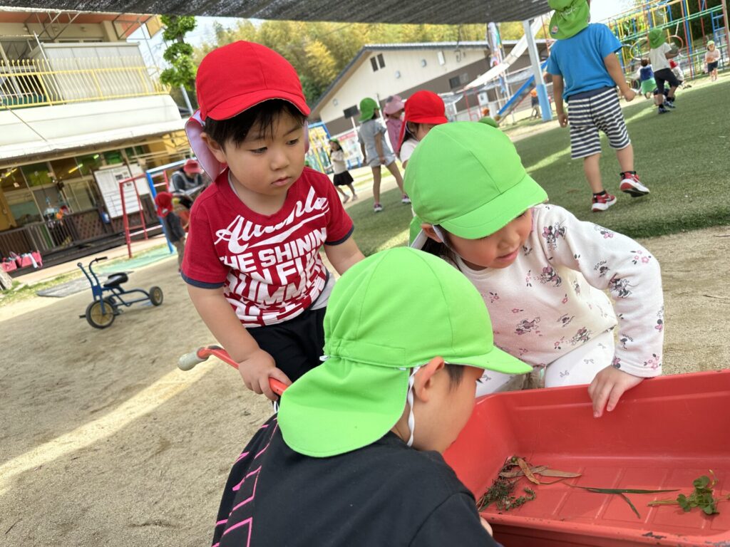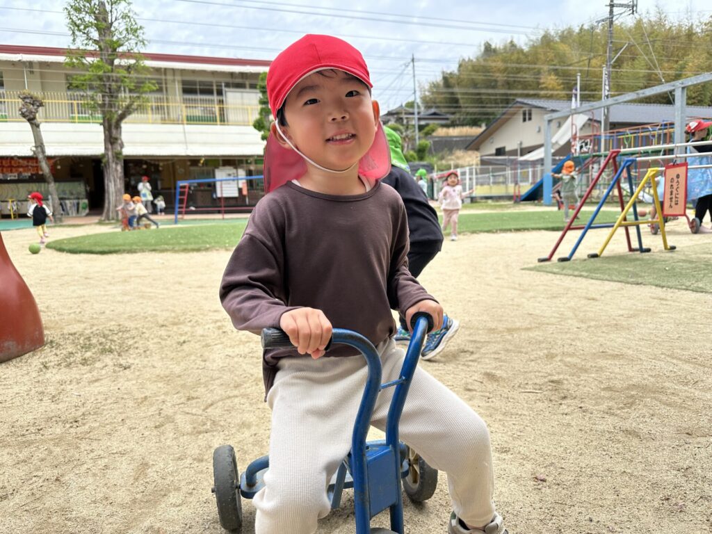 202604.22 さくら組(戸外遊び) 朝から5月のこども祭りの練習をしています。エビカニ音頭を踊ったり、 2列に並んで「わっしょい!わっしょい!」と掛け声を出しながら歩いたり、 子ども達も頑張っています✨ 戸外遊びでは昨日から押し車を出しています。 押し車、三輪車、バギー遊びが盛り上がっています🎶