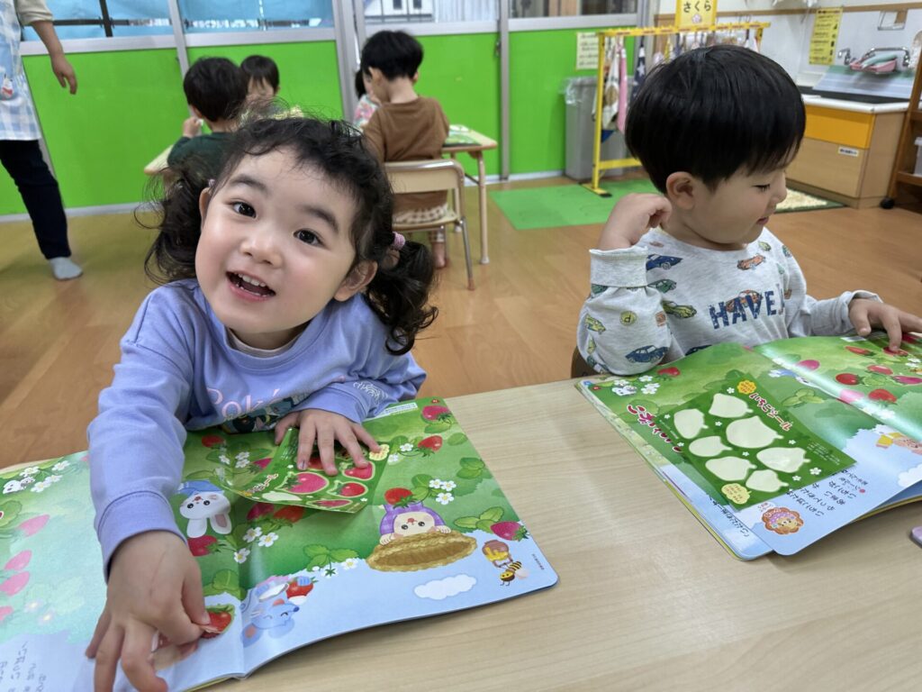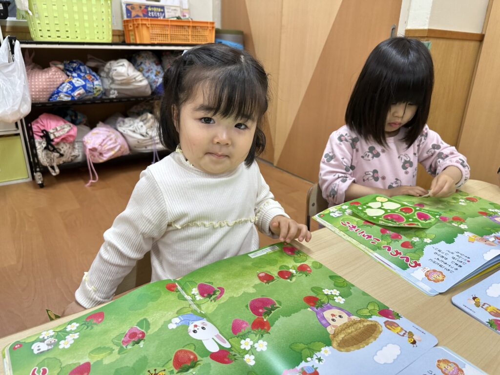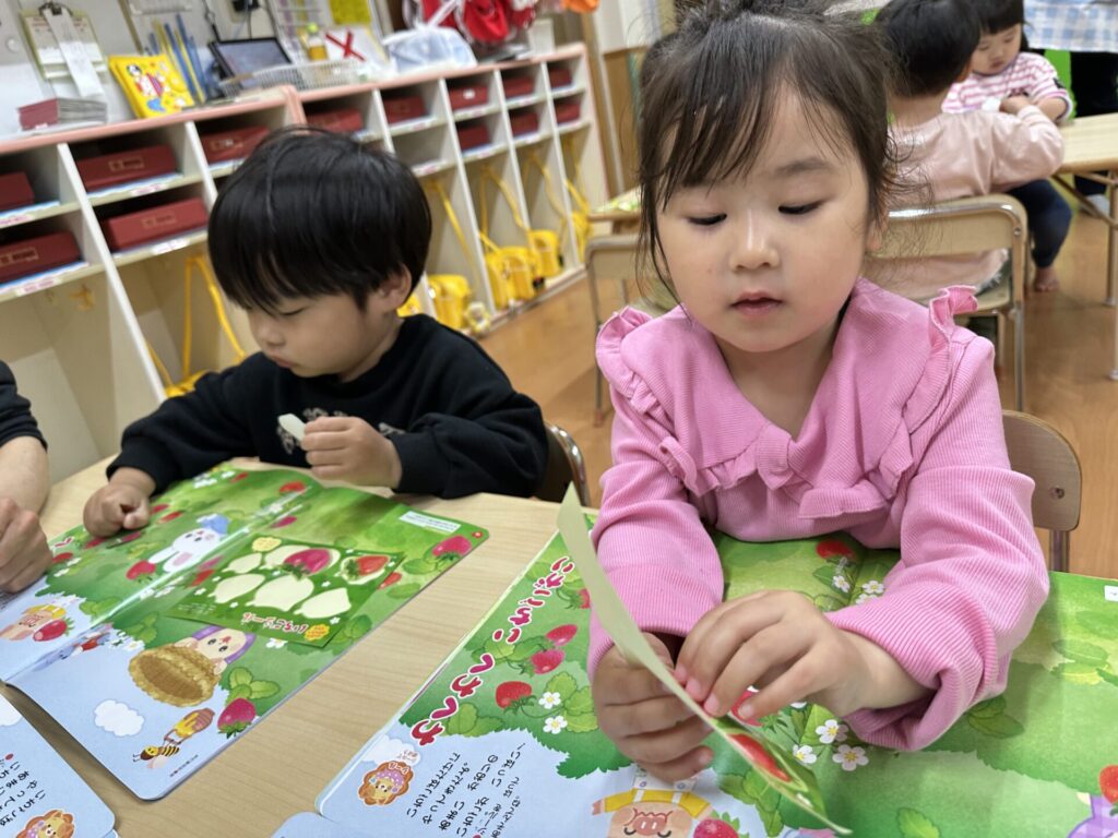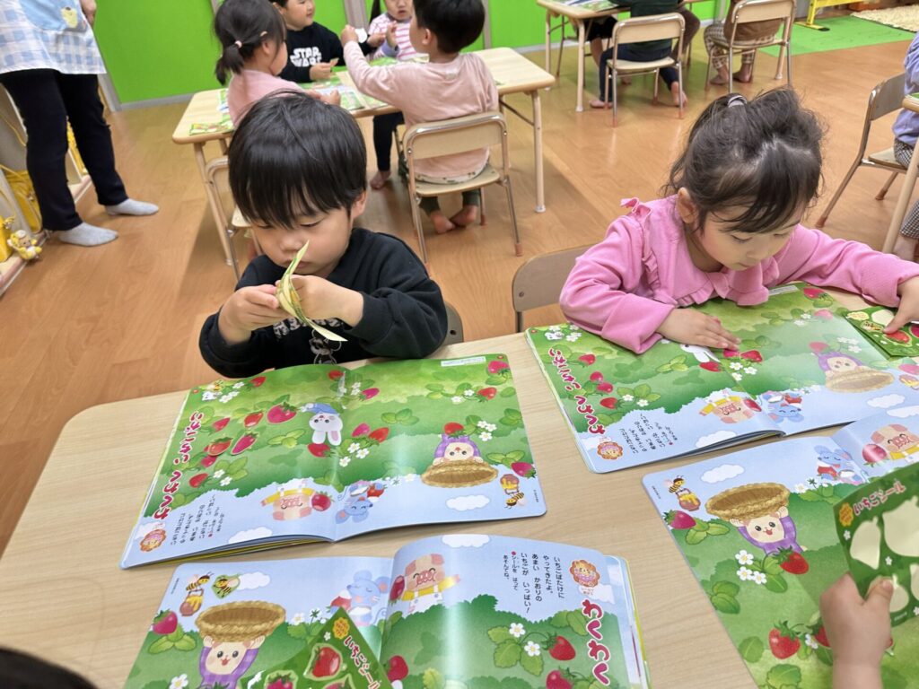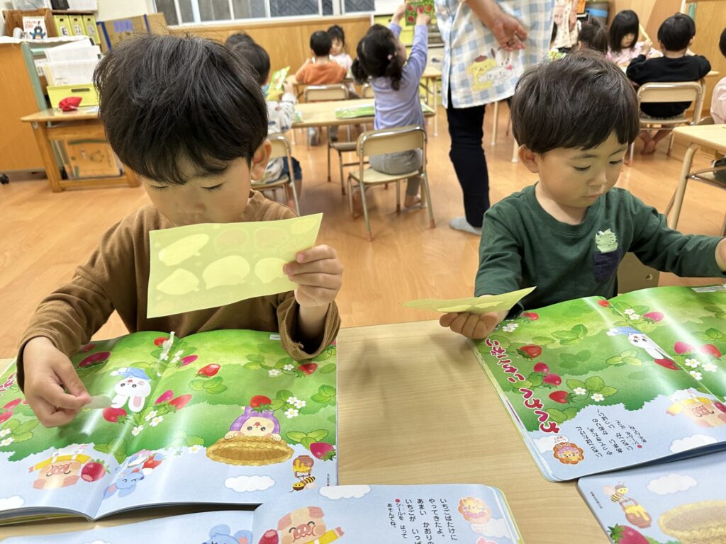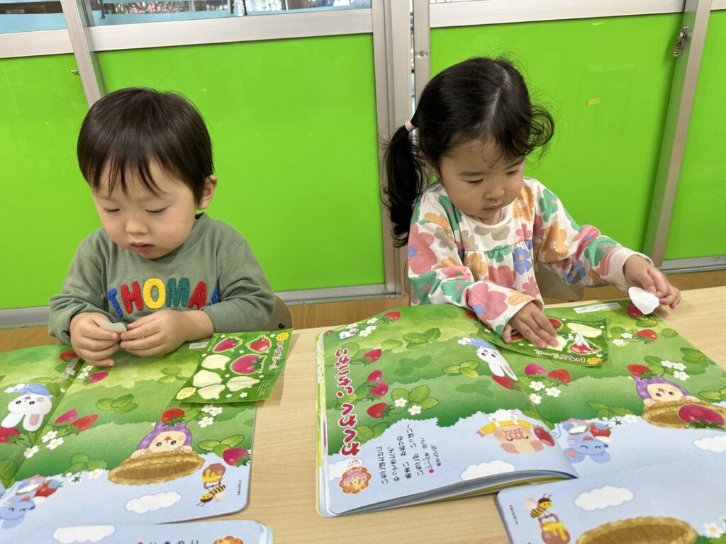 202604.10 さくら組(月間絵本の活動) 初めての月刊絵本の活動を行いました! 「ドキドキワクワクする~😆」と楽しみにしていたさくら組さん✨ 季節の生き物についてのお話を見たり、イチゴのシール貼りをしました! みんな、よくお話を聞いて活動に参加できましたよ👌