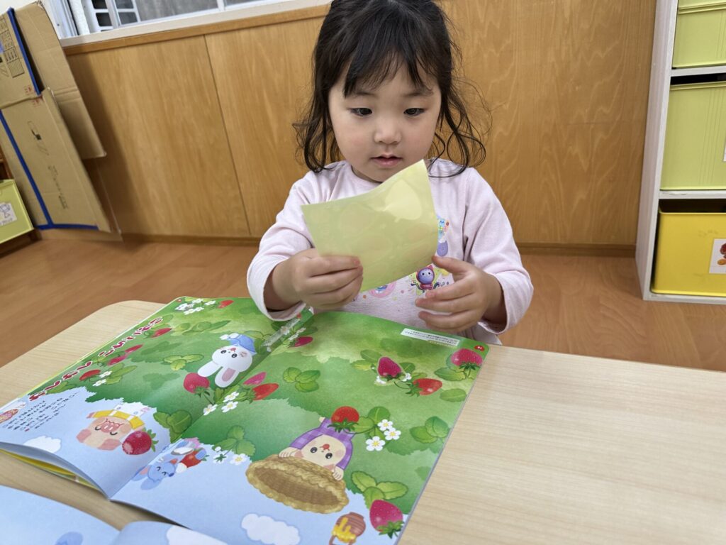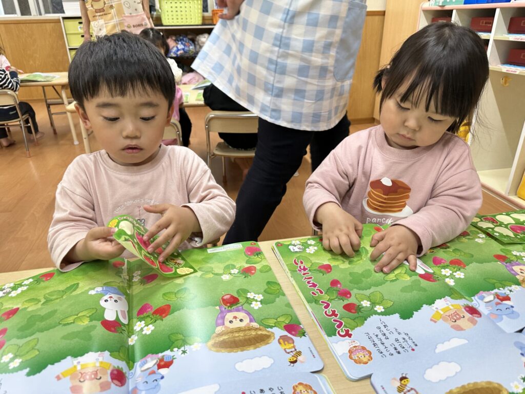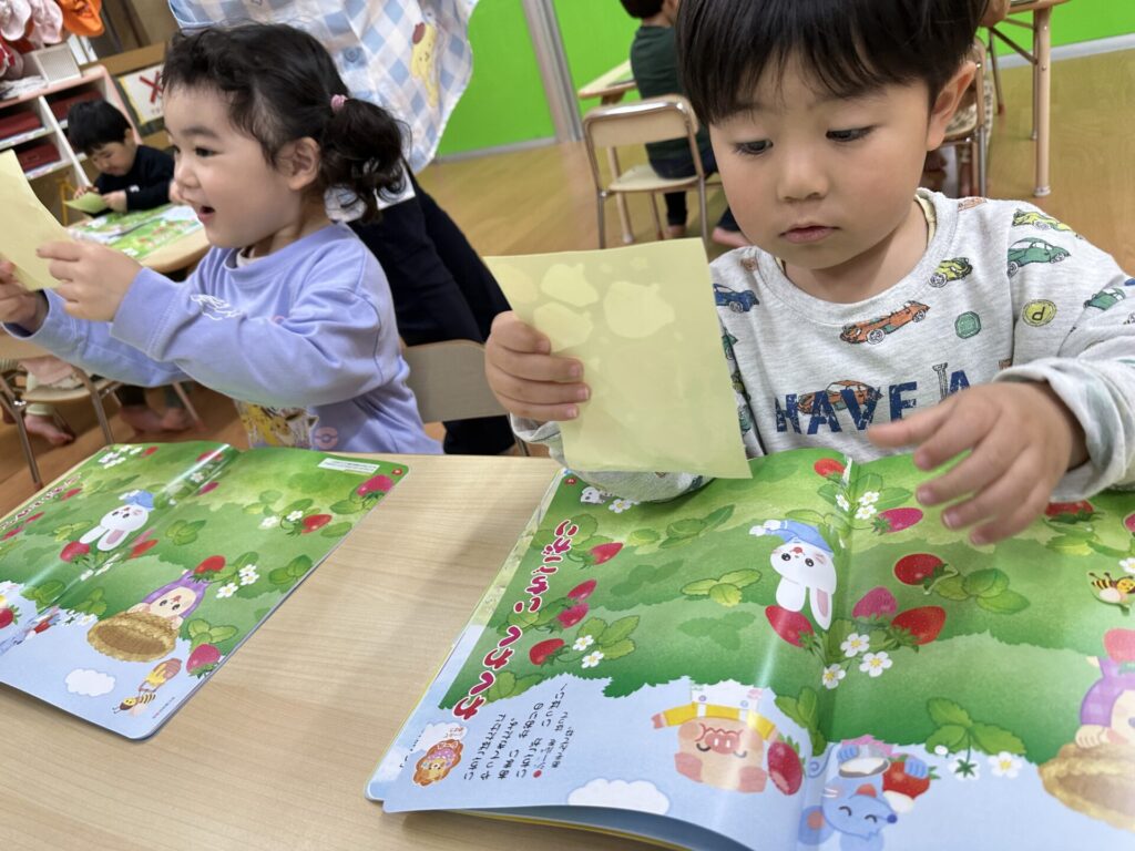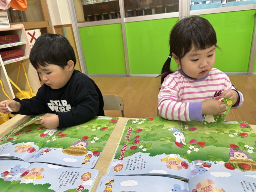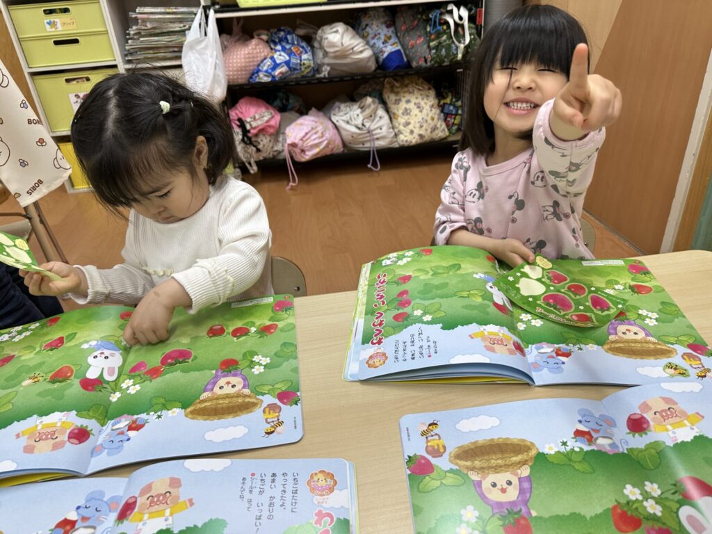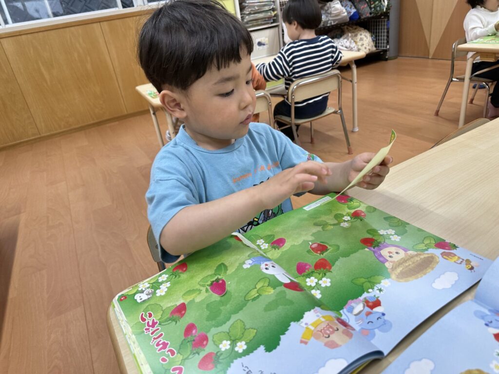202604.10 さくら組(月間絵本の活動) 初めての月刊絵本の活動を行いました! 「ドキドキワクワクする~😆」と楽しみにしていたさくら組さん✨ 季節の生き物についてのお話を見たり、イチゴのシール貼りをしました! みんな、よくお話を聞いて活動に参加できましたよ👌