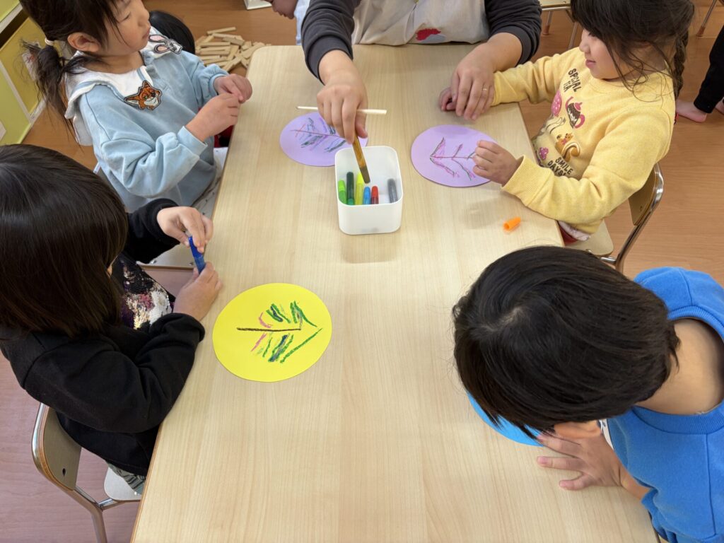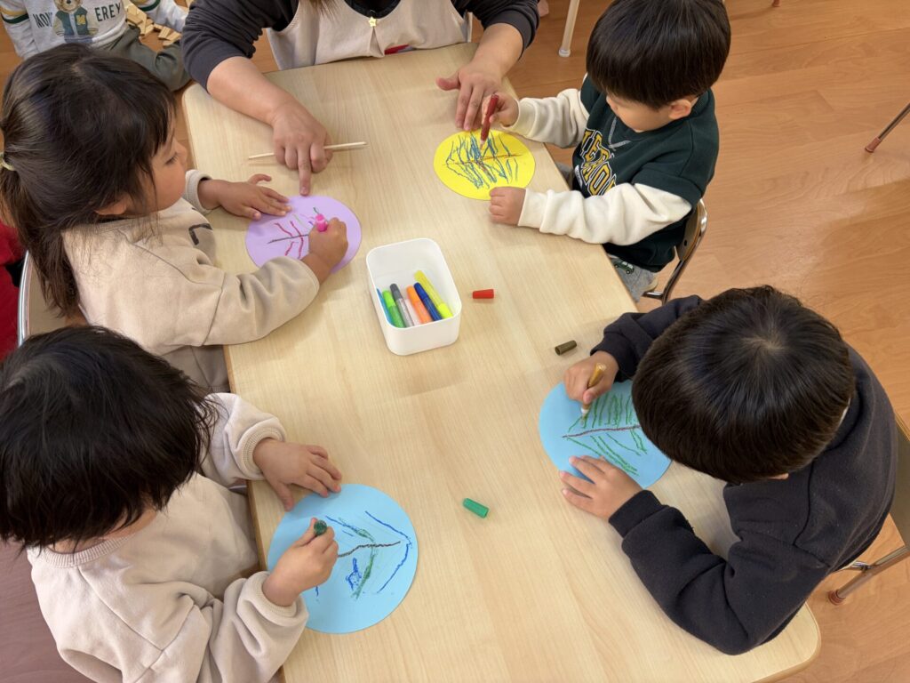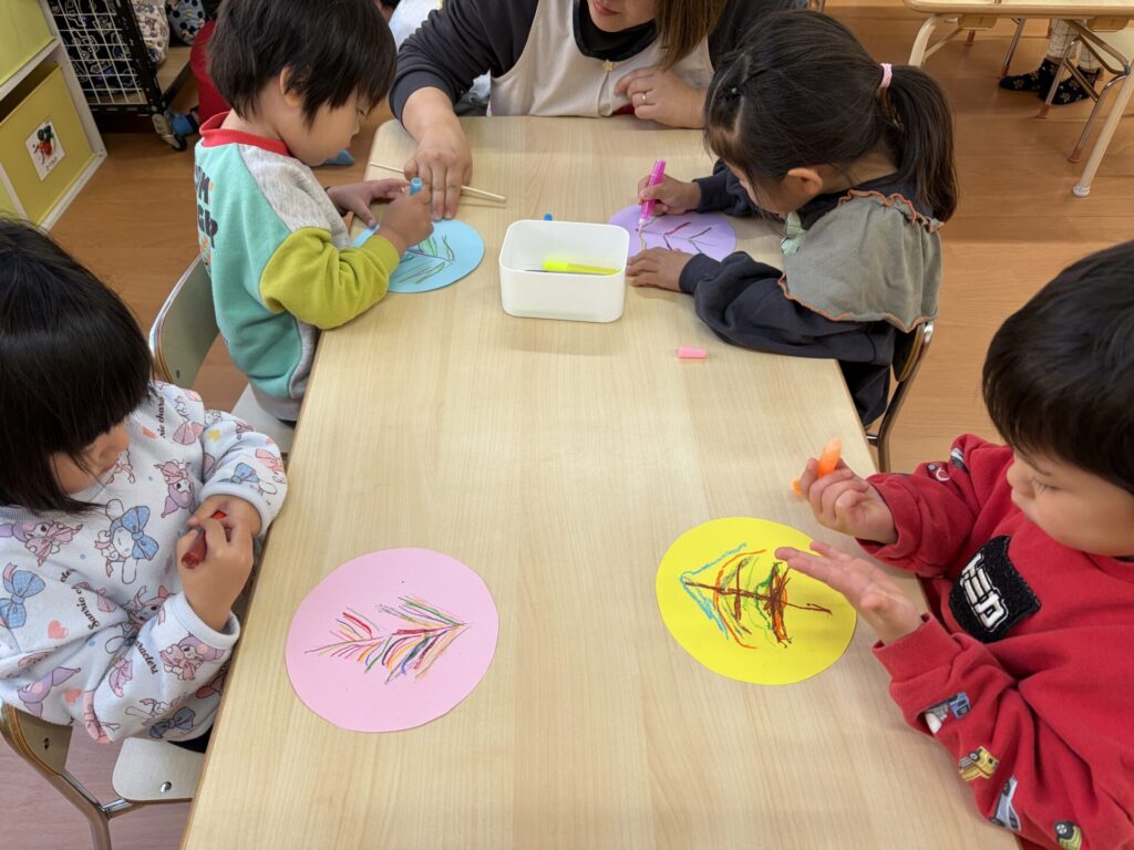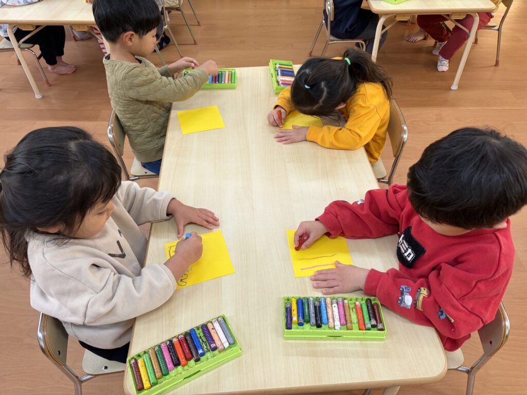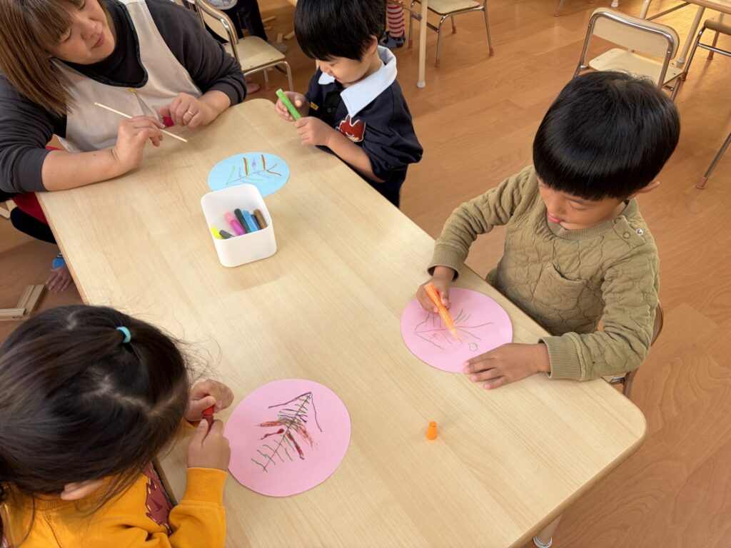プレゼント箱の模様をクレヨンで描き、スノードームをキラキラペンで