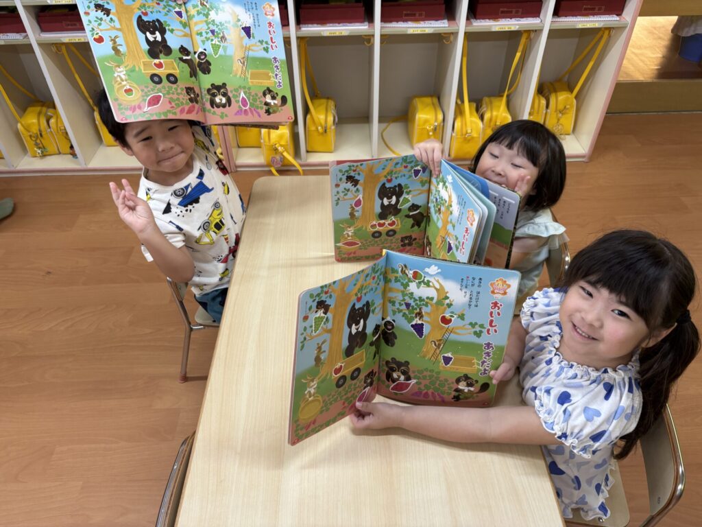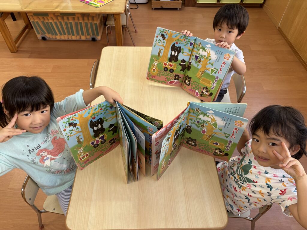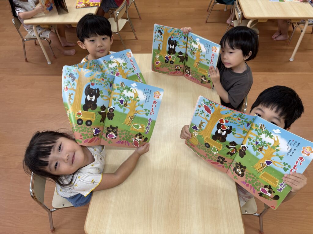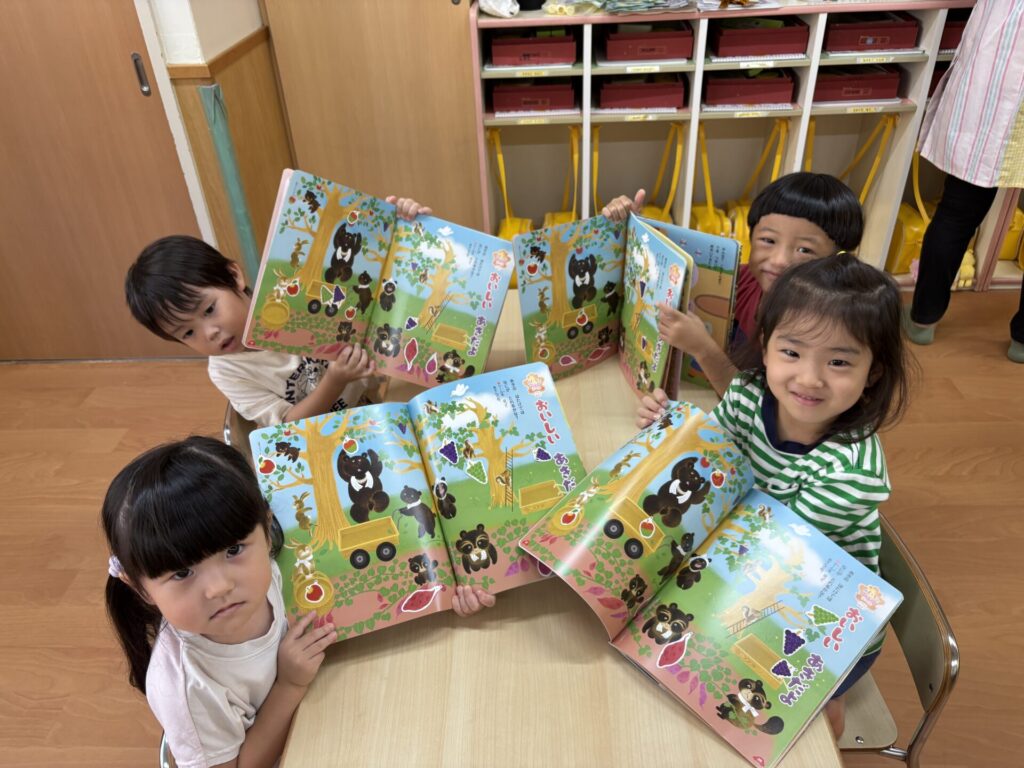 202510.21 さくら組(R7/10/17) ●10/17(金)10月の月間絵本を見ました! 秋ならではのスイーツを見て「おいしそ~💖」と皆で言ってましたよ✨ こするとスイートポテトの匂いがして大興奮でした😆