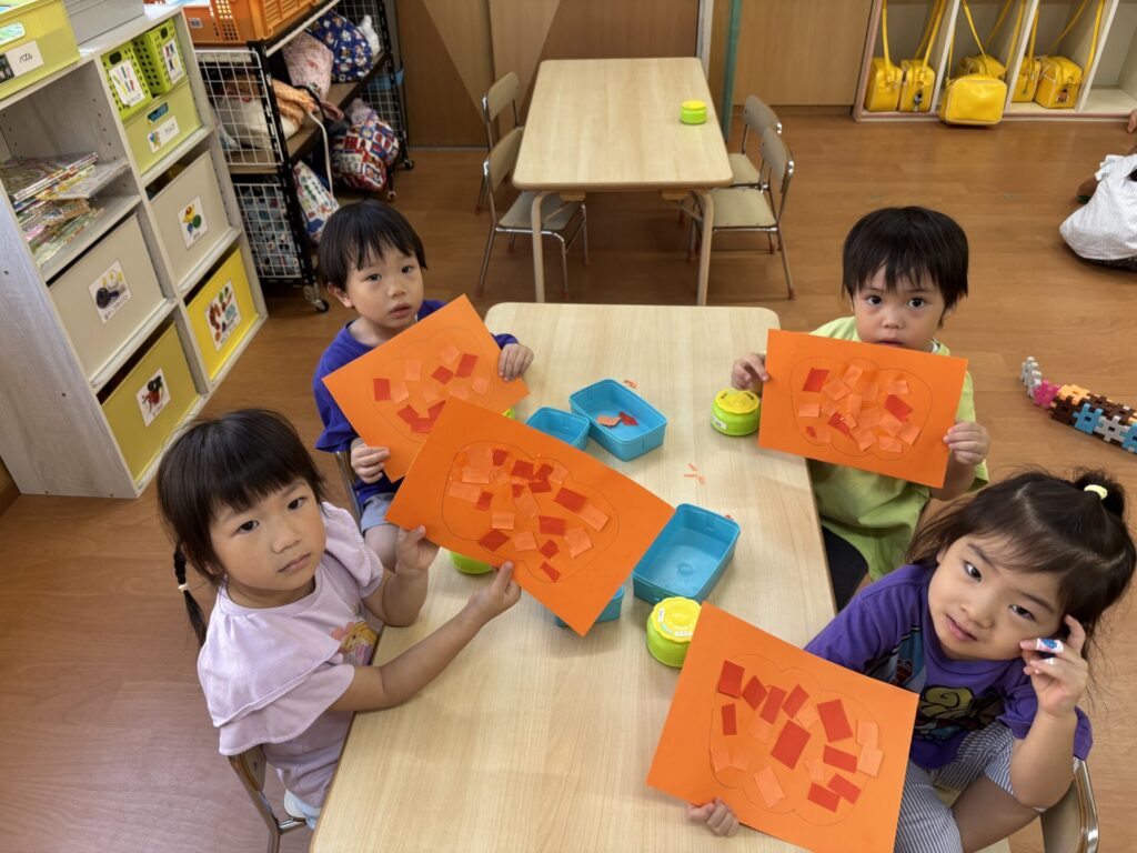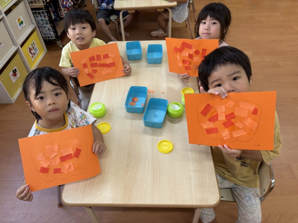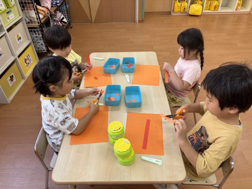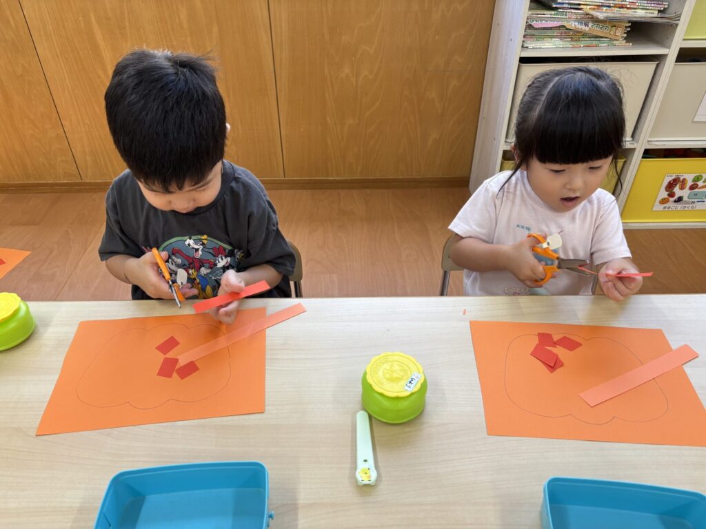 202510.03 さくら組(R7/9/30) 9/30(火)10月の壁面制作をしました! 「カボチャ作る~」と皆で張り切って、ハサミで画用紙を一本切りして作りましたよ💖 とても可愛いかぼちゃができました!