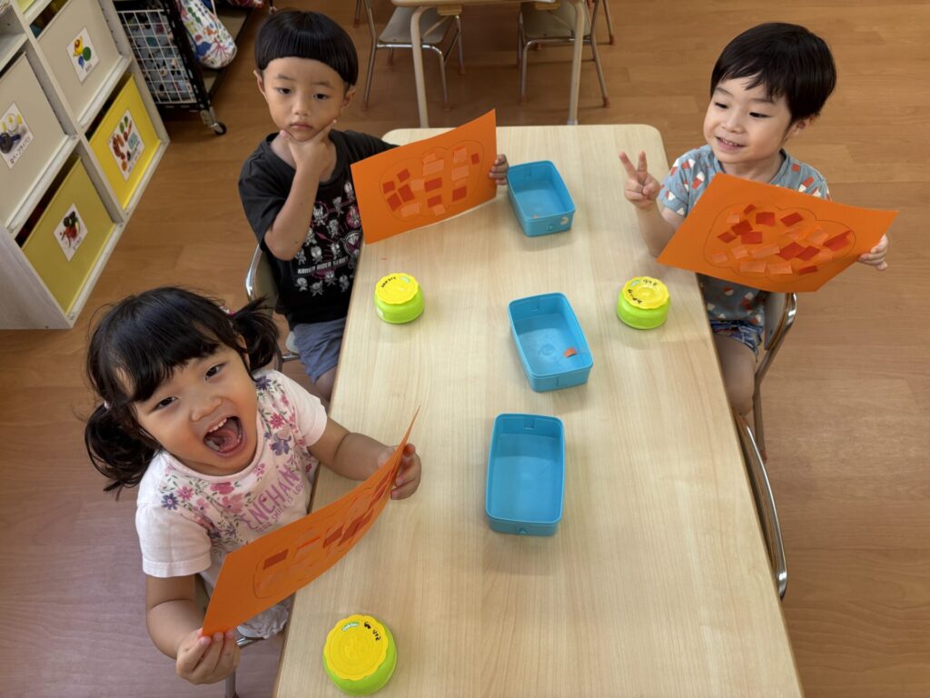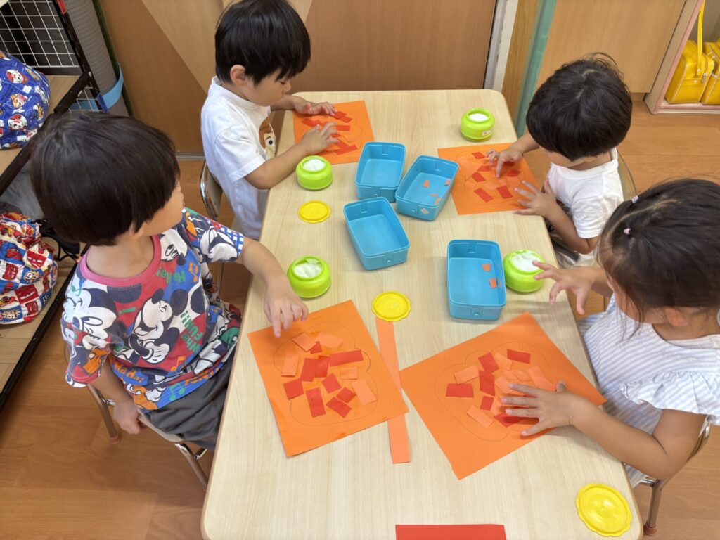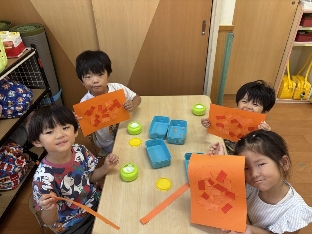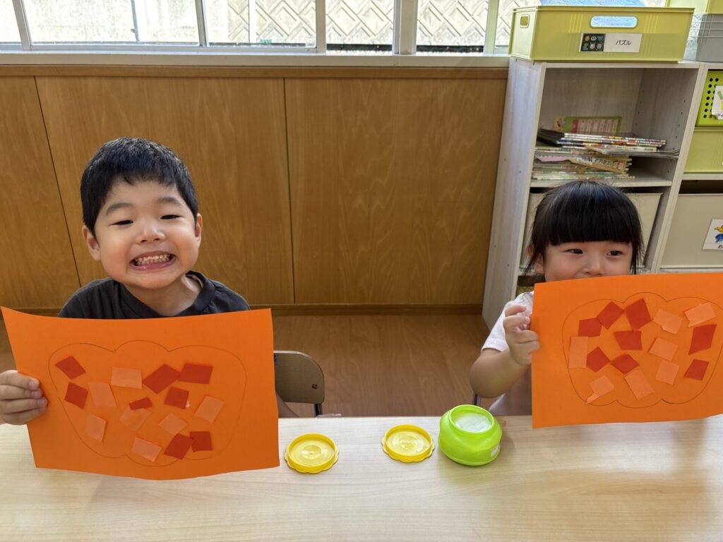 202510.03 さくら組(R7/9/30) 9/30(火)10月の壁面制作をしました! 「カボチャ作る~」と皆で張り切って、ハサミで画用紙を一本切りして作りましたよ💖 とても可愛いかぼちゃができました!