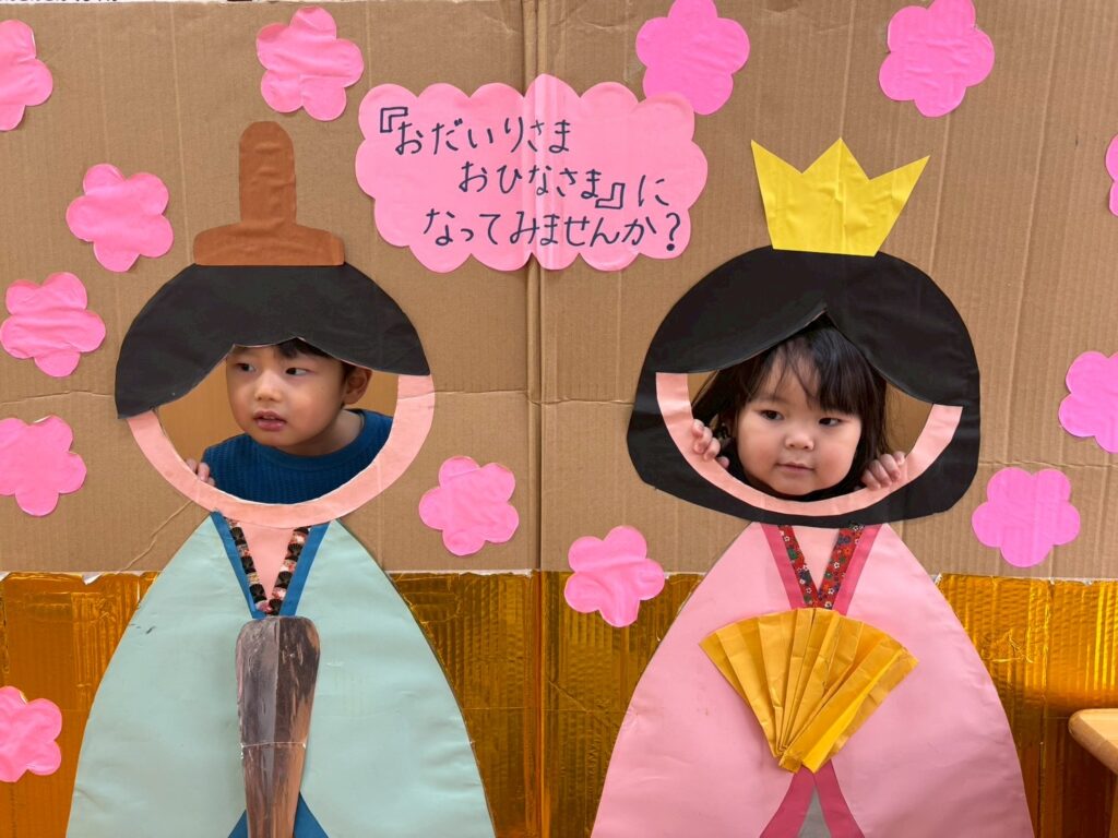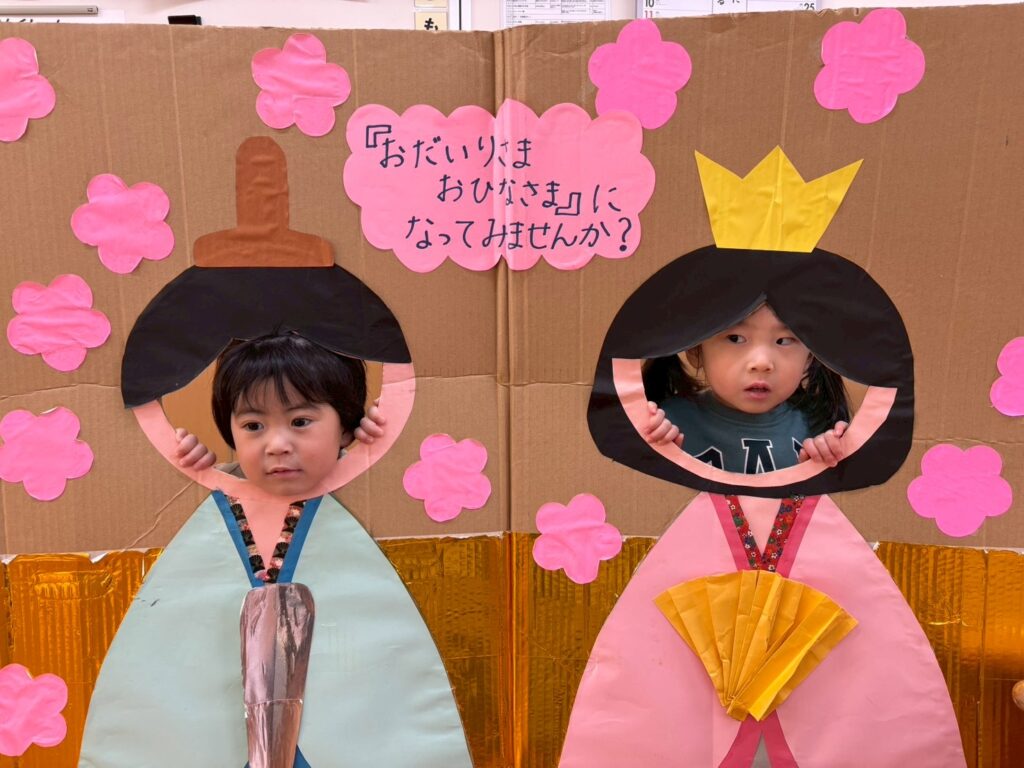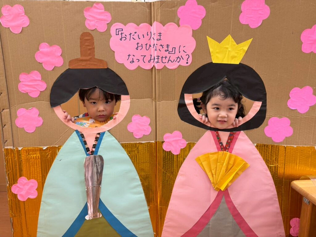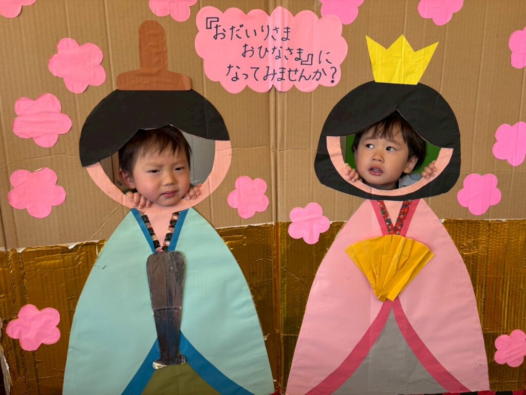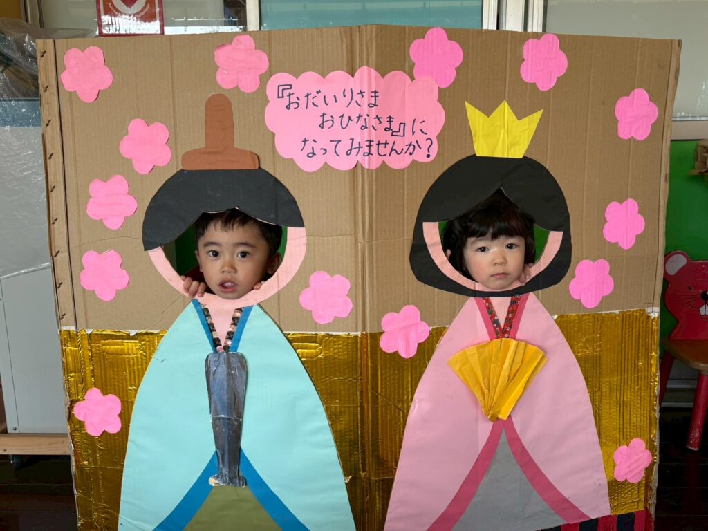 202602.21 すみれ組(ひな人形遊び&戸外遊び) ●2/20(金)戸外遊び お外でたくさん遊びました!気の合うお友だちと遊ぶ姿も増えてきました💖 それぞれに好きな遊びを楽しんでます✨ ●ひな人形パネルに入りみんなでお内裏様・おひな様になって、写真を撮りましたよ!