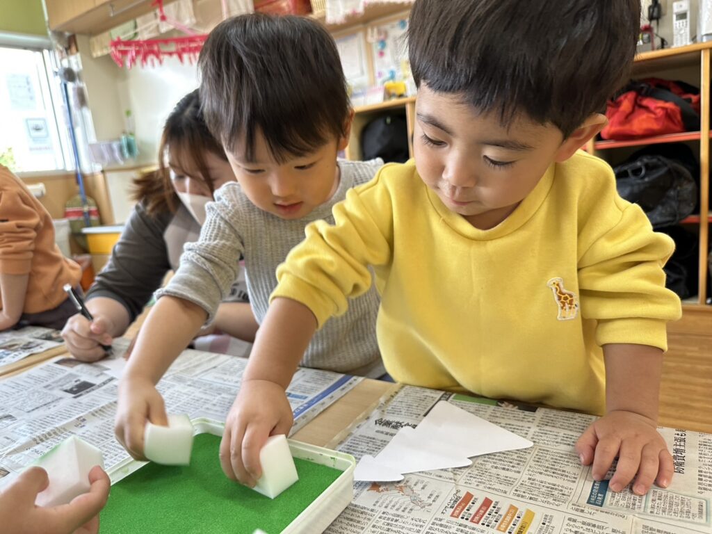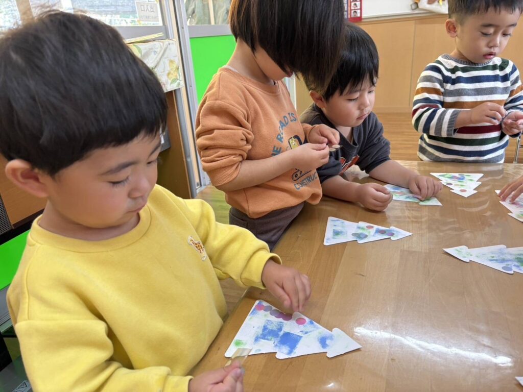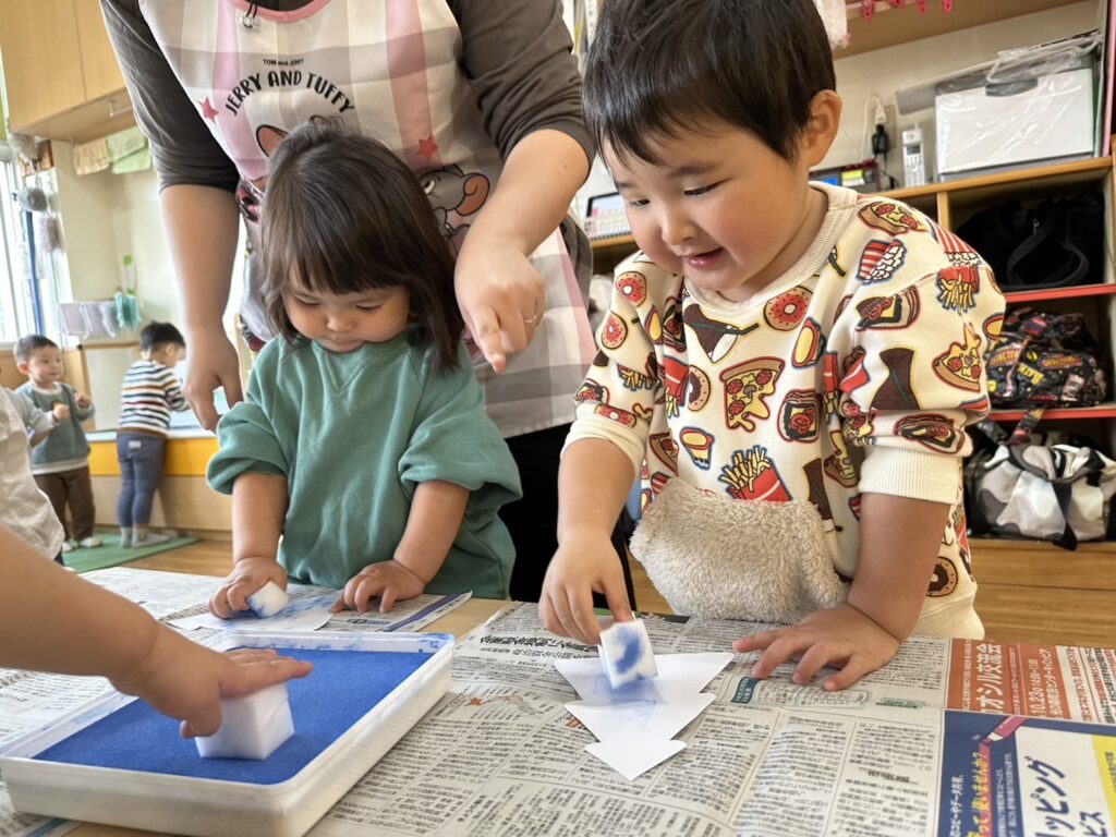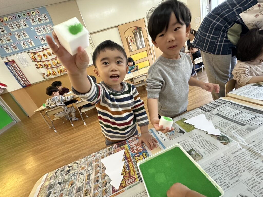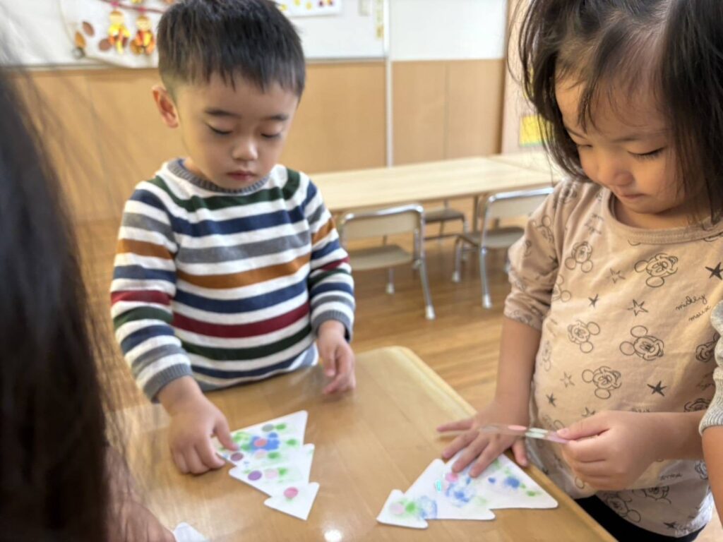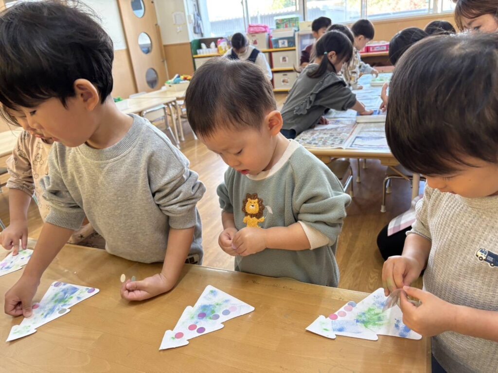 202511.28 すみれ組(クリスマス制作) みんなでクリスマスツリーを作りました!素敵なツリーができましたよ✨ 園でしばらく飾ったら、持ち帰りにしますのでお楽しみに😆 そして、みさき先生が保育園に遊びに来てくれました🎶 久しぶりに会えて嬉しそうな子ども達です💖