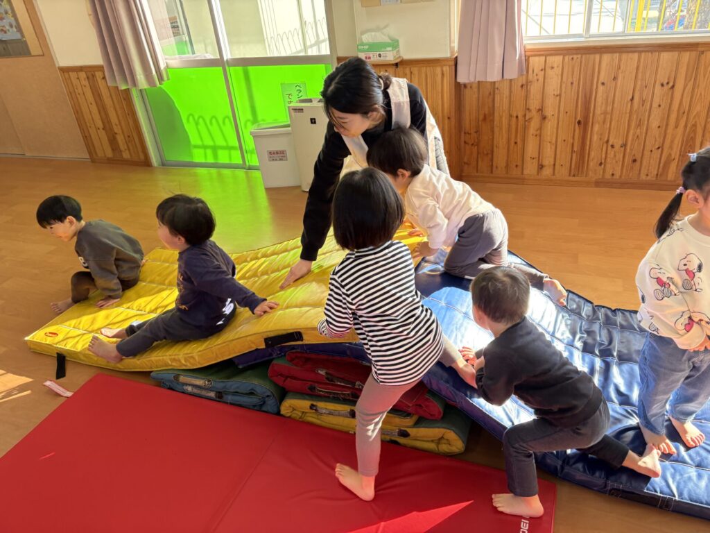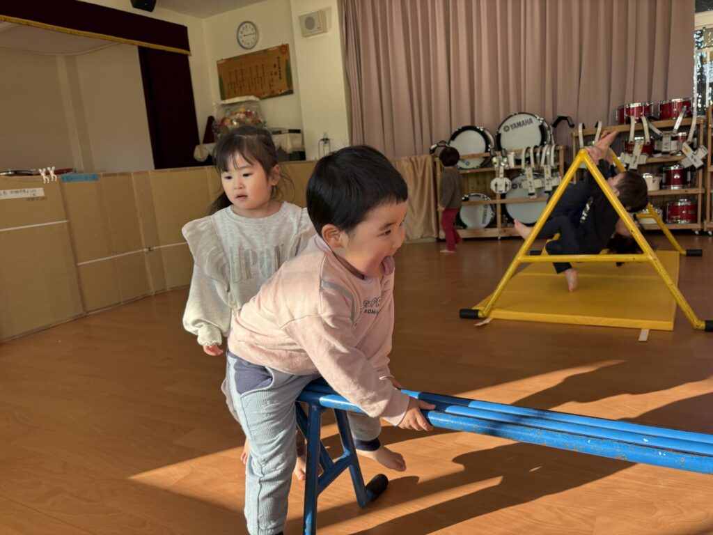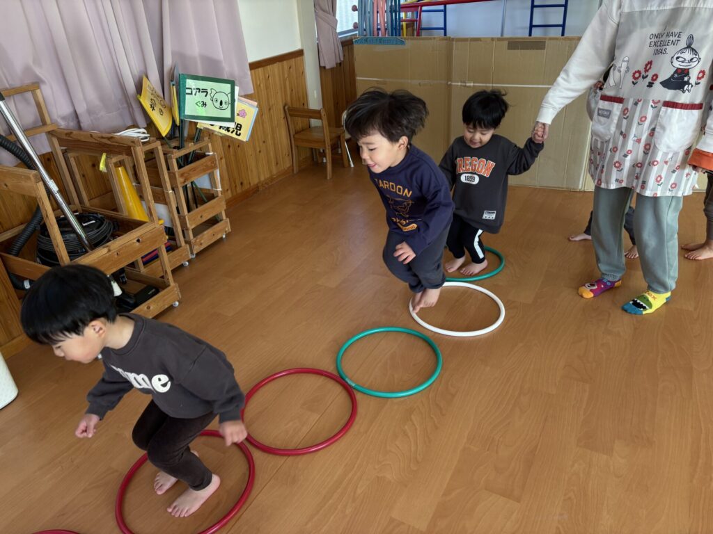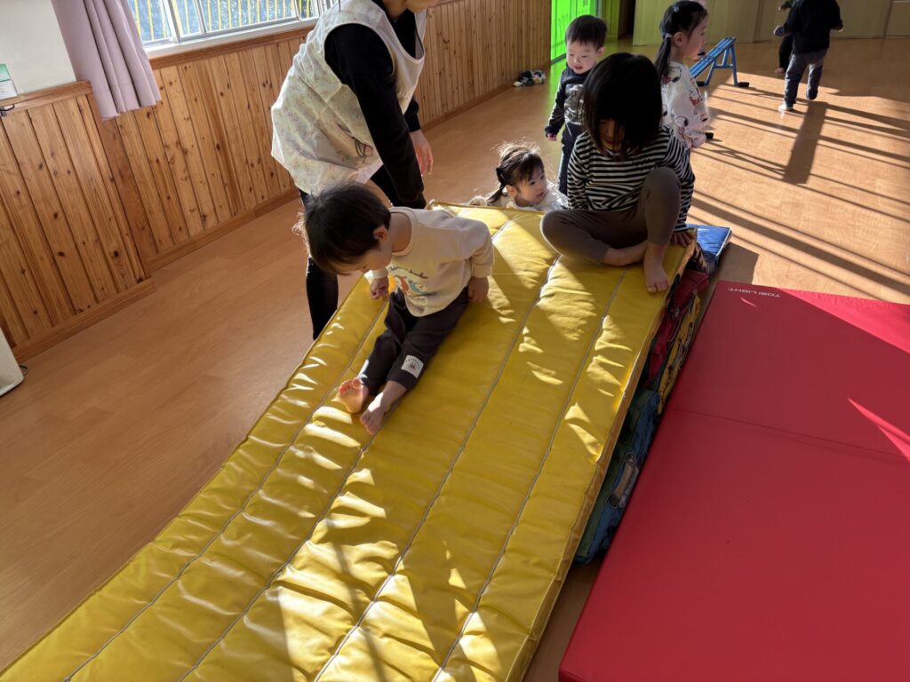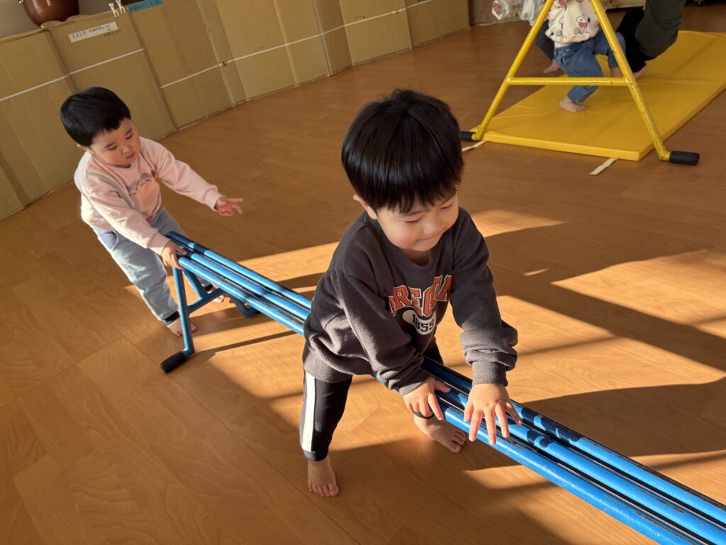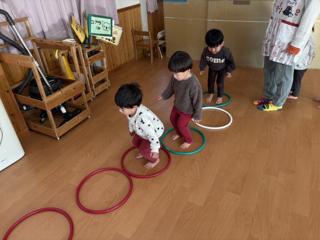 202601.07 すみれ組(サーキット遊び) 朝からホールでサーキット遊びをして、活動では戸外遊びを行い、体をいっぱい動かして遊びました! 戸外遊びでは、初めて「だるまさんが転んだ」をして遊びましたよ✨みんなで笑い合いながら楽しみました😁 ●戸外遊び ●初めてだるまさんが転んだをしました!みんな止まるのが上手です