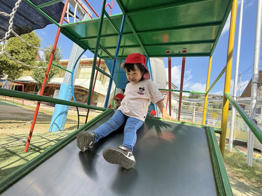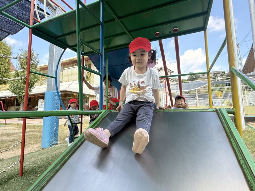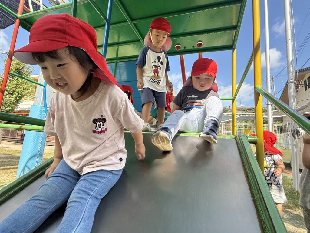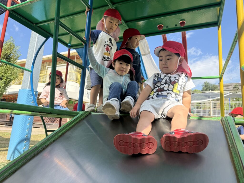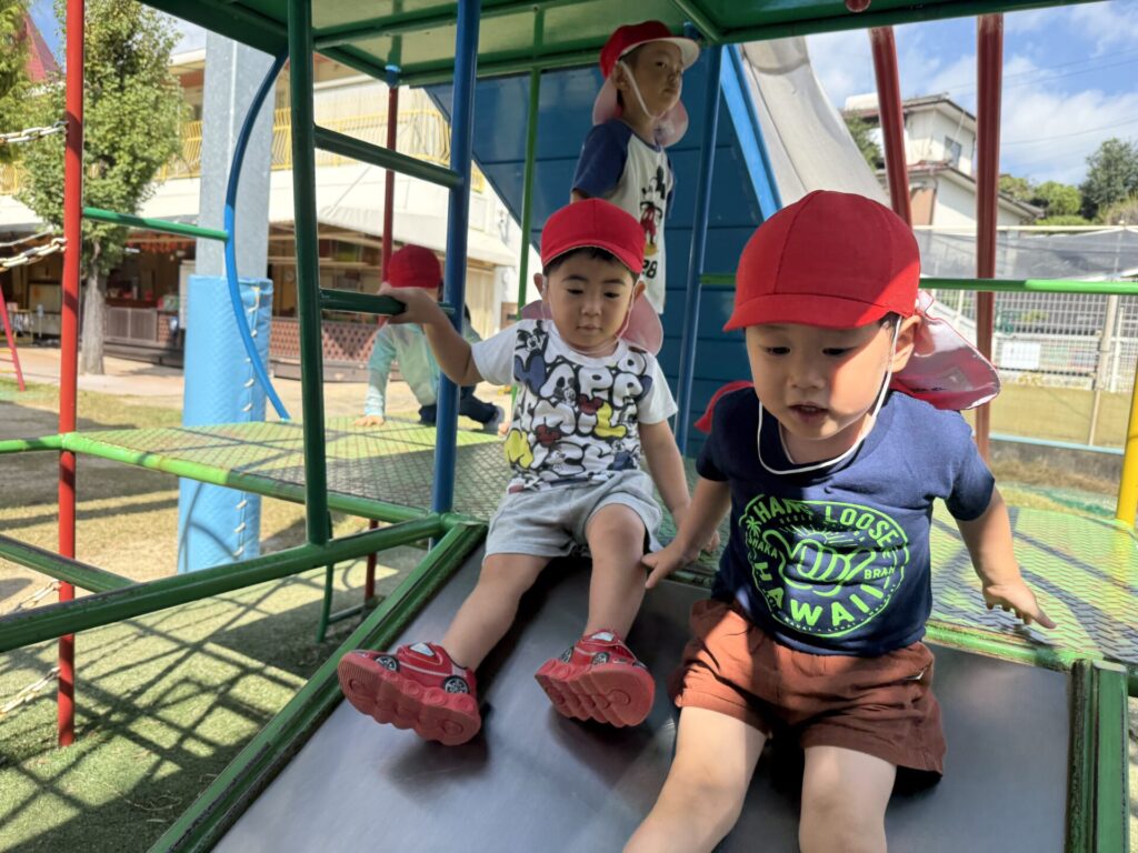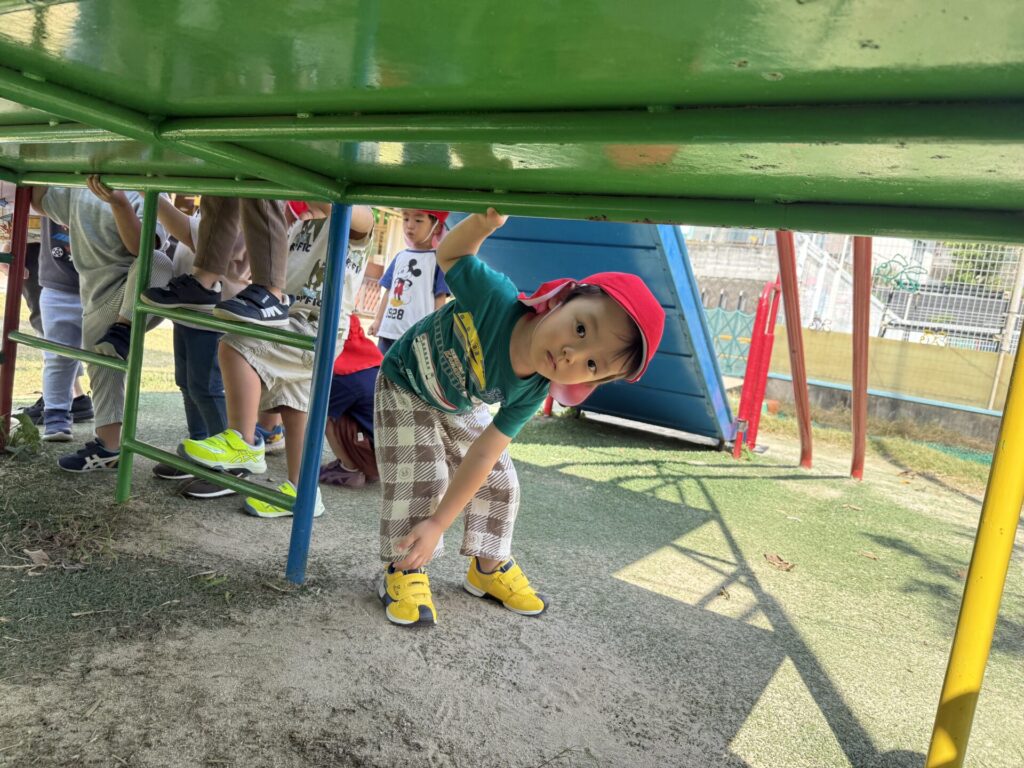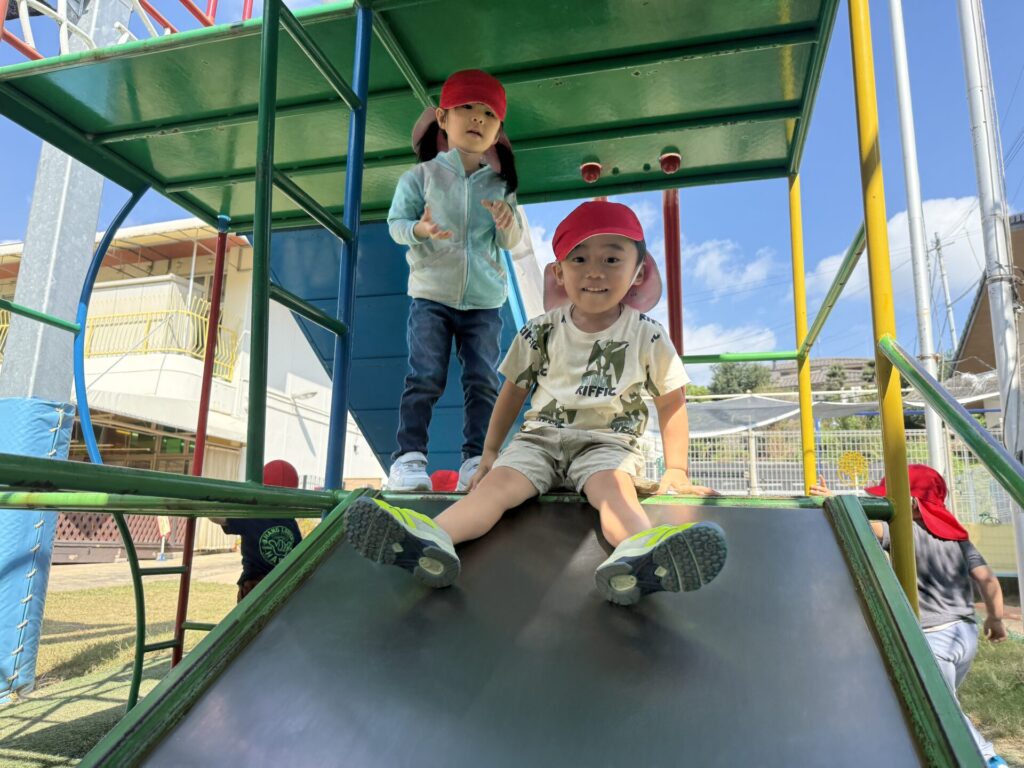 202510.14 すみれ組(外遊び) 今日は、園庭で鬼ごっこ&ジャングラミング2階の滑り台の練習をしました! 鬼ごっこは、少しずつルールを覚えてきて、一生懸命走って逃げるすみれ組さんでした💪 ジャングラミング2階の滑り台は初めて練習しましたが、お約束を守って楽しみました✨