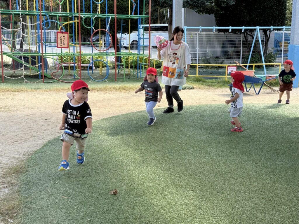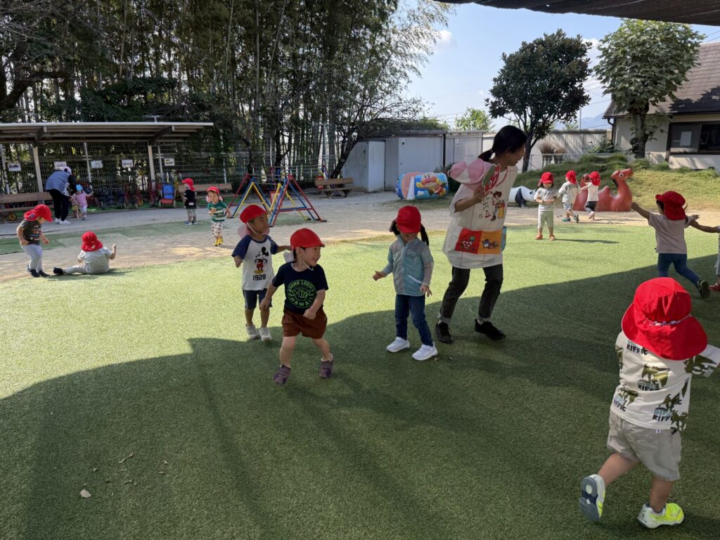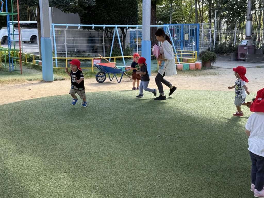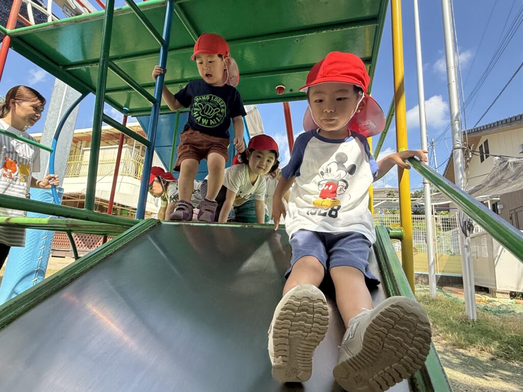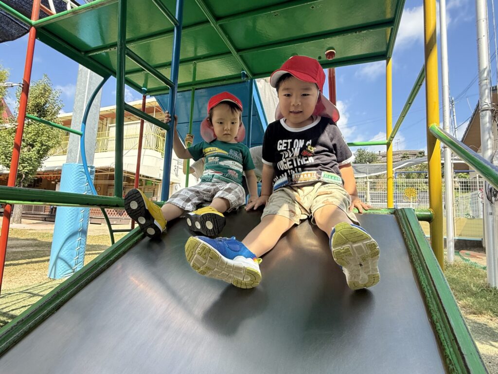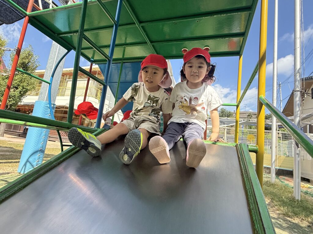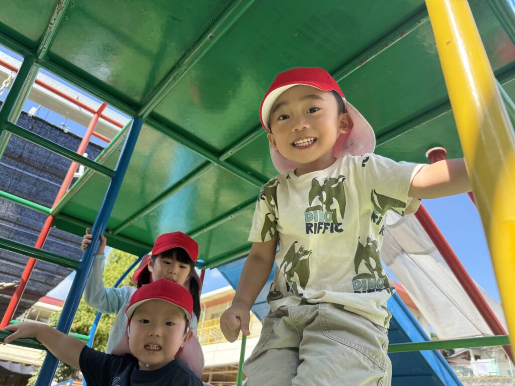 202510.14 すみれ組(外遊び) 今日は、園庭で鬼ごっこ&ジャングラミング2階の滑り台の練習をしました! 鬼ごっこは、少しずつルールを覚えてきて、一生懸命走って逃げるすみれ組さんでした💪 ジャングラミング2階の滑り台は初めて練習しましたが、お約束を守って楽しみました✨