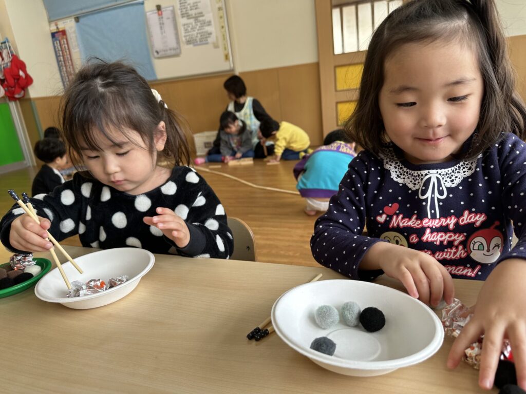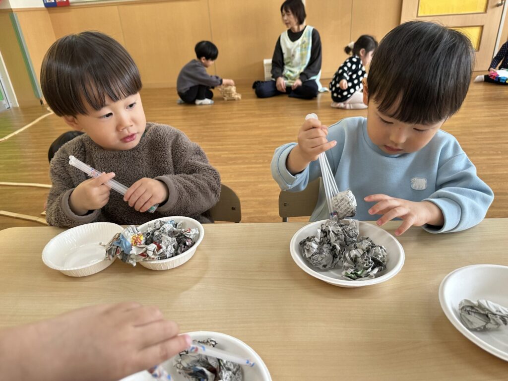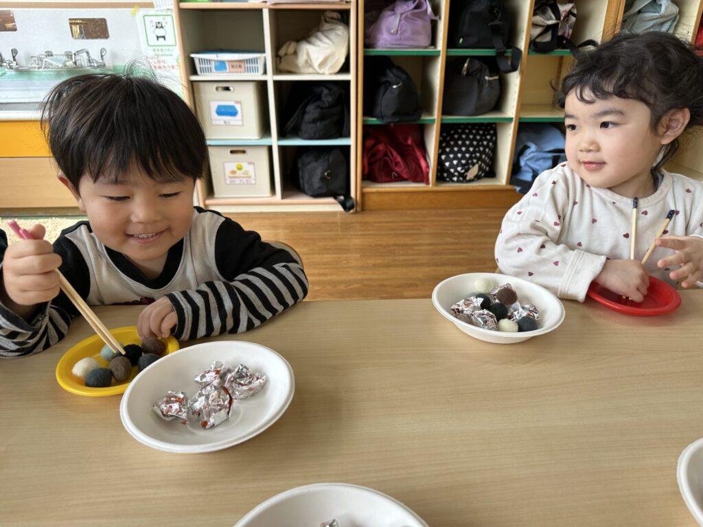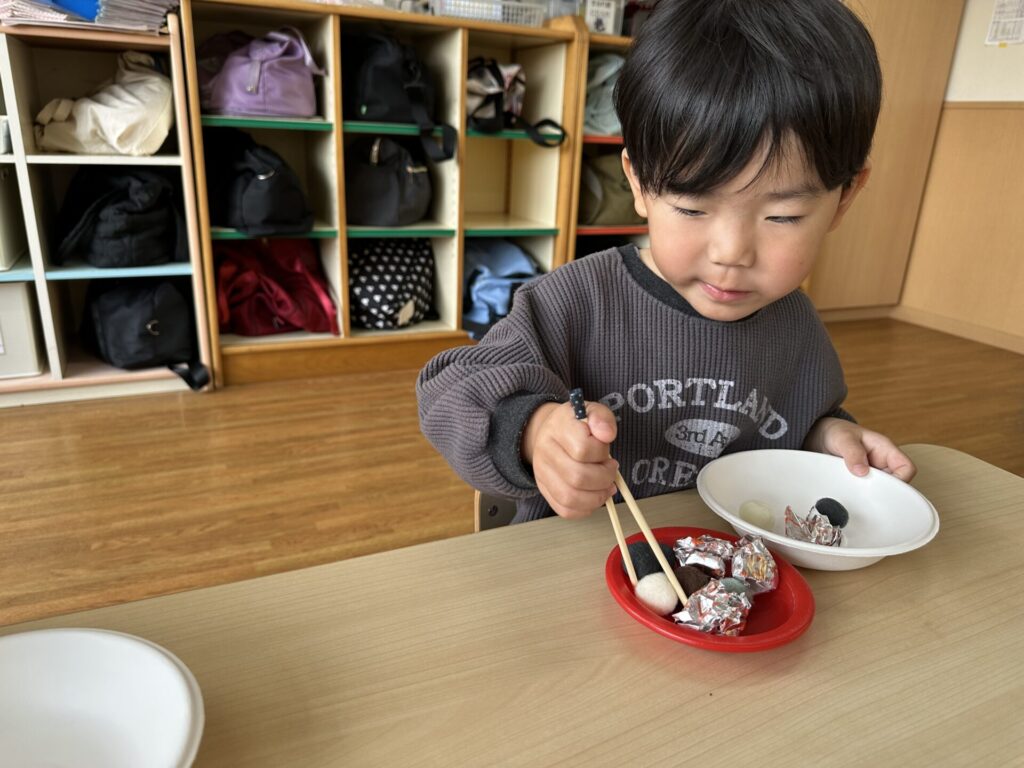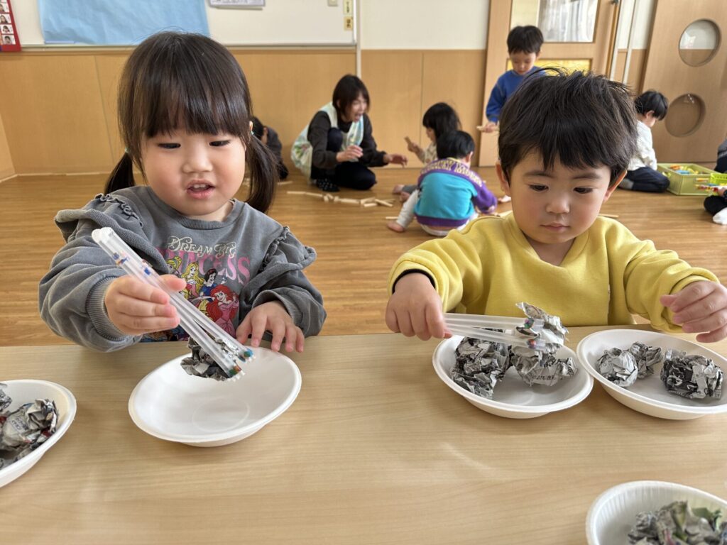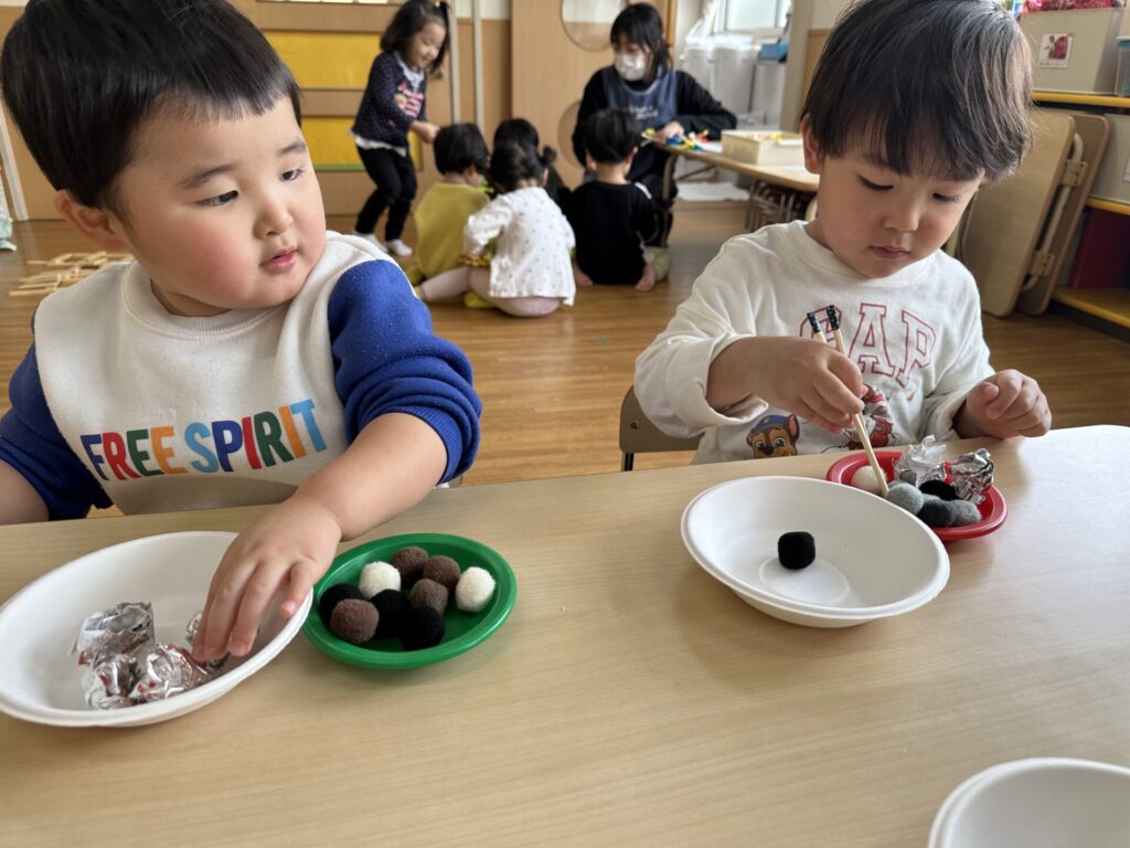 202601.20 すみれ組(室内遊び) 今日は、お箸やトングを使って遊びました! 遊んでいくうちに、お箸やトングで物を挟むのことがスムーズに できるようになっていきました✨これからも楽しく取り組んでいきます💪