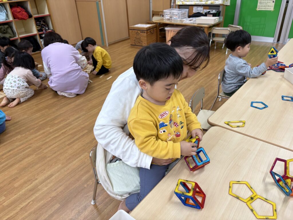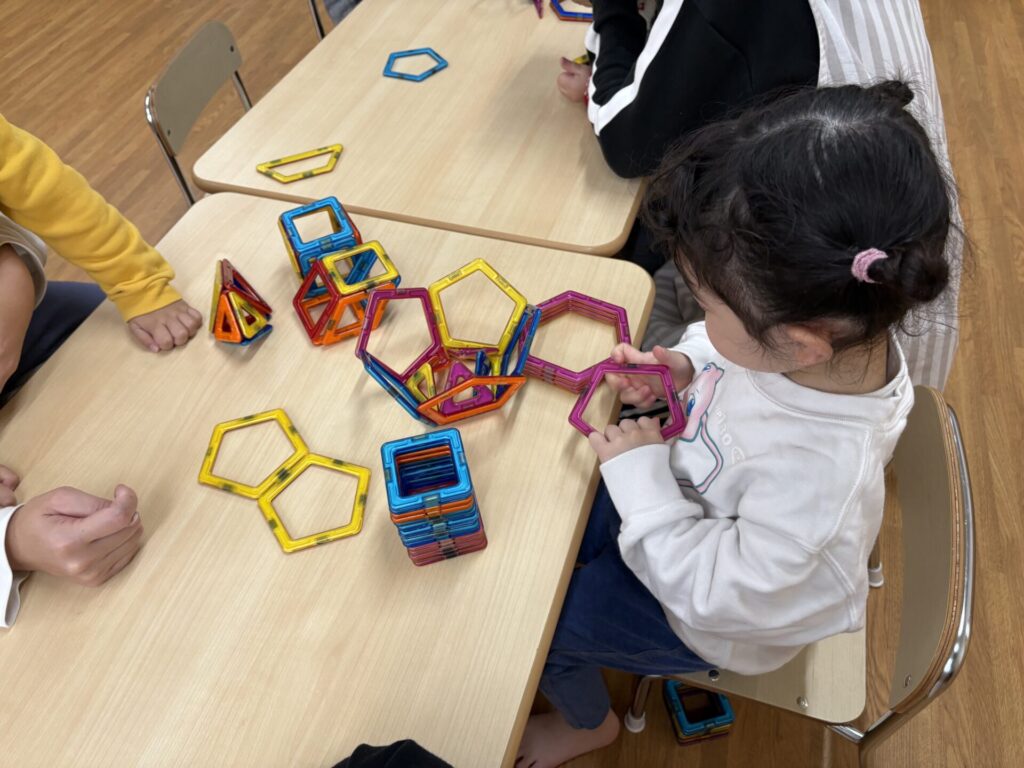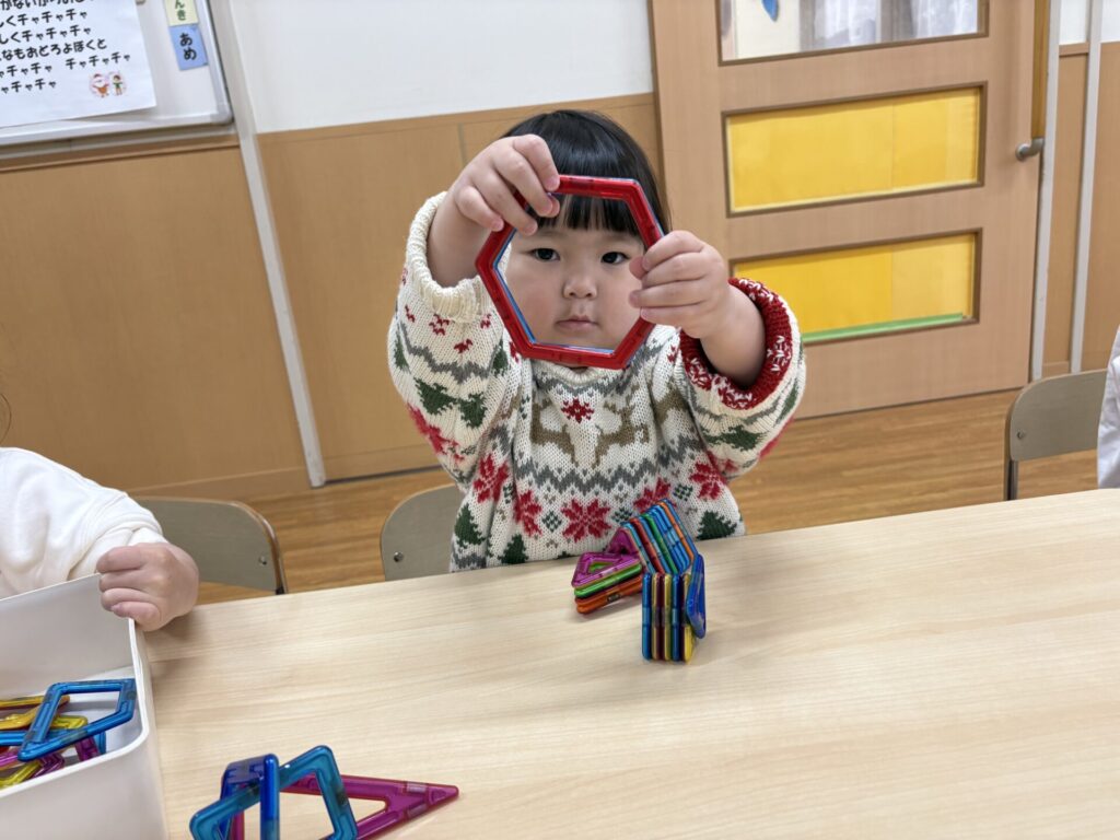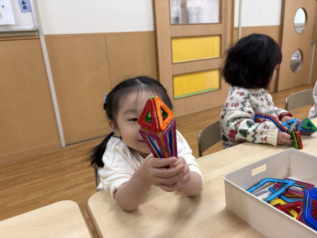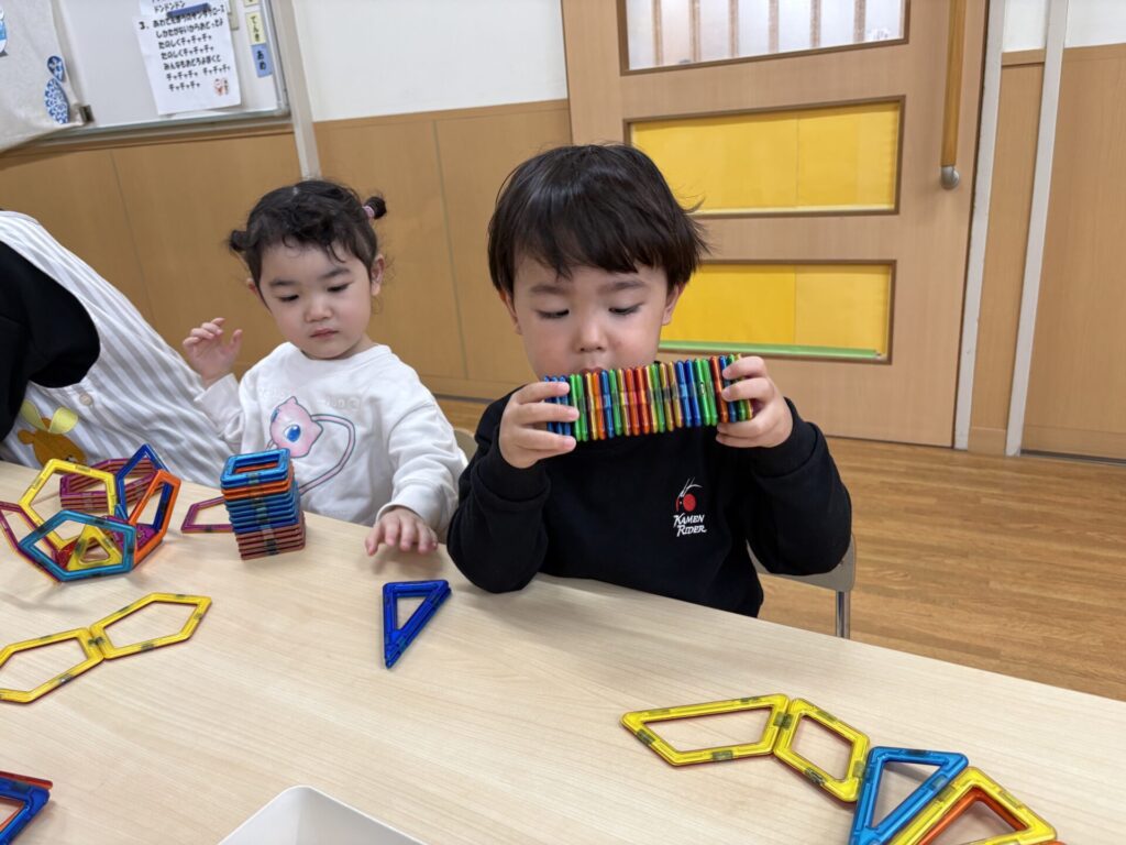 202512.25 すみれ組(室内遊び) カプラとマグフォーマーという以上児クラスの玩具を持ってきて遊びました! まだ少し難しそうでしたが、くっつけたり、つなげたり、重ねたり、 夢中になって遊ぶ子ども達でした✨