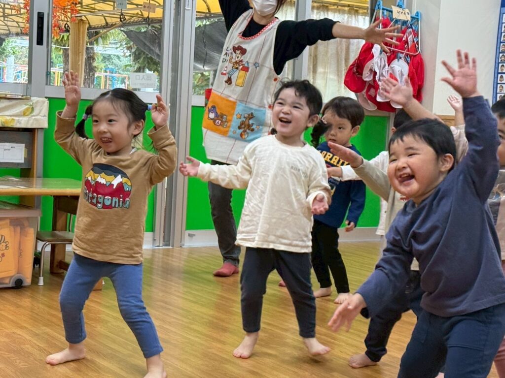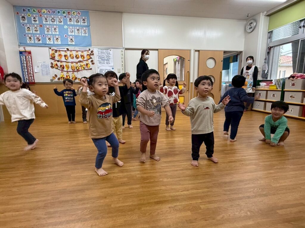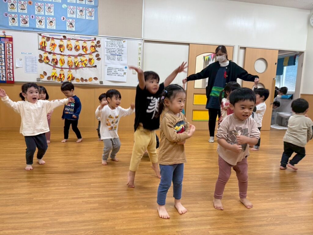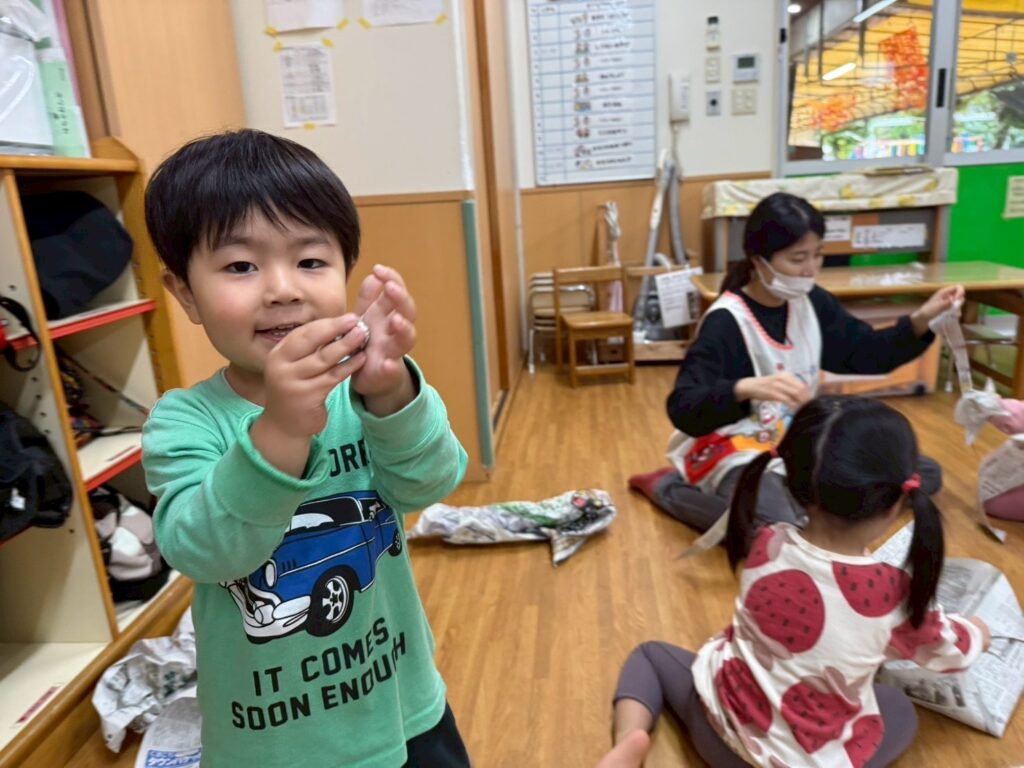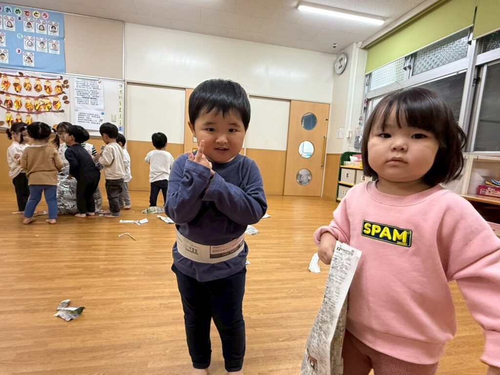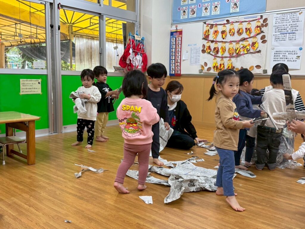 202511.01 すみれ組(R7/10/31) ●10/31(金)新聞紙遊び みんなで体操を踊ったり、新聞紙遊びを楽しみました! ★11月より、みさき先生が産休に入られます💪 「元気な赤ちゃんを産んでね💖」とみんなで伝えましたよ✨