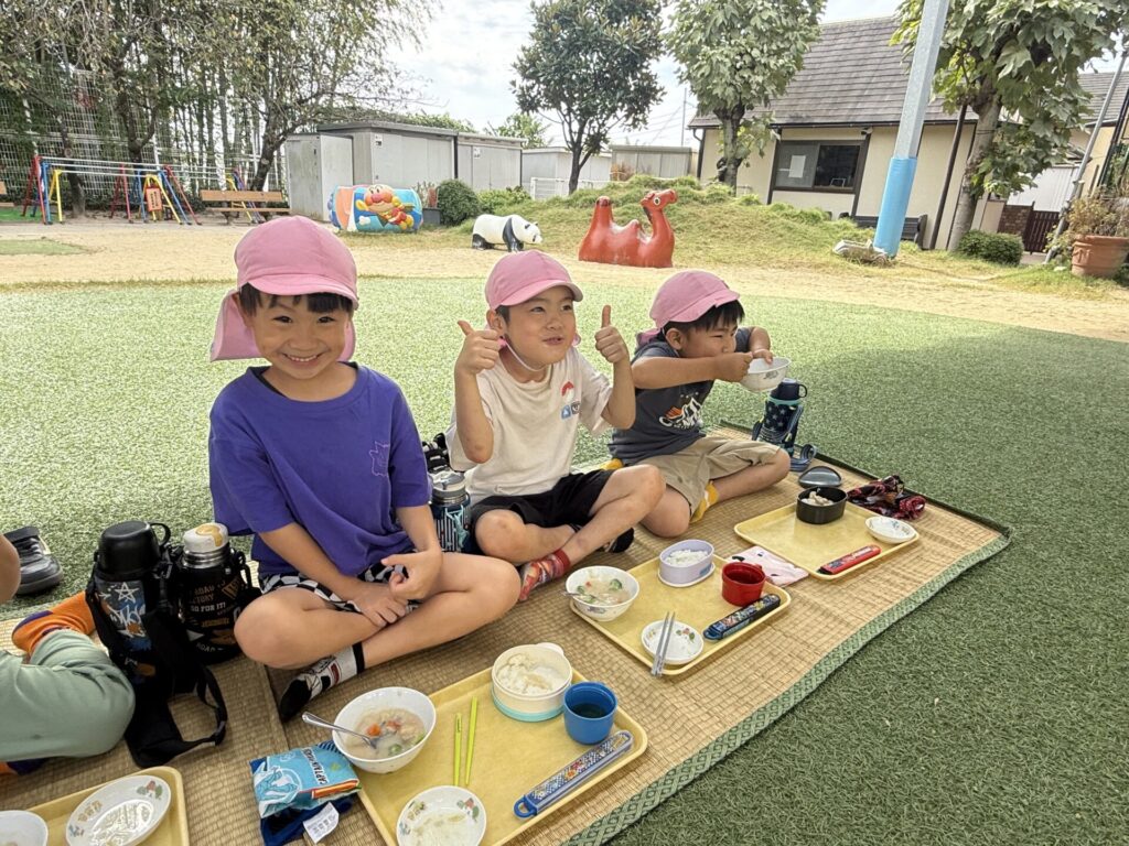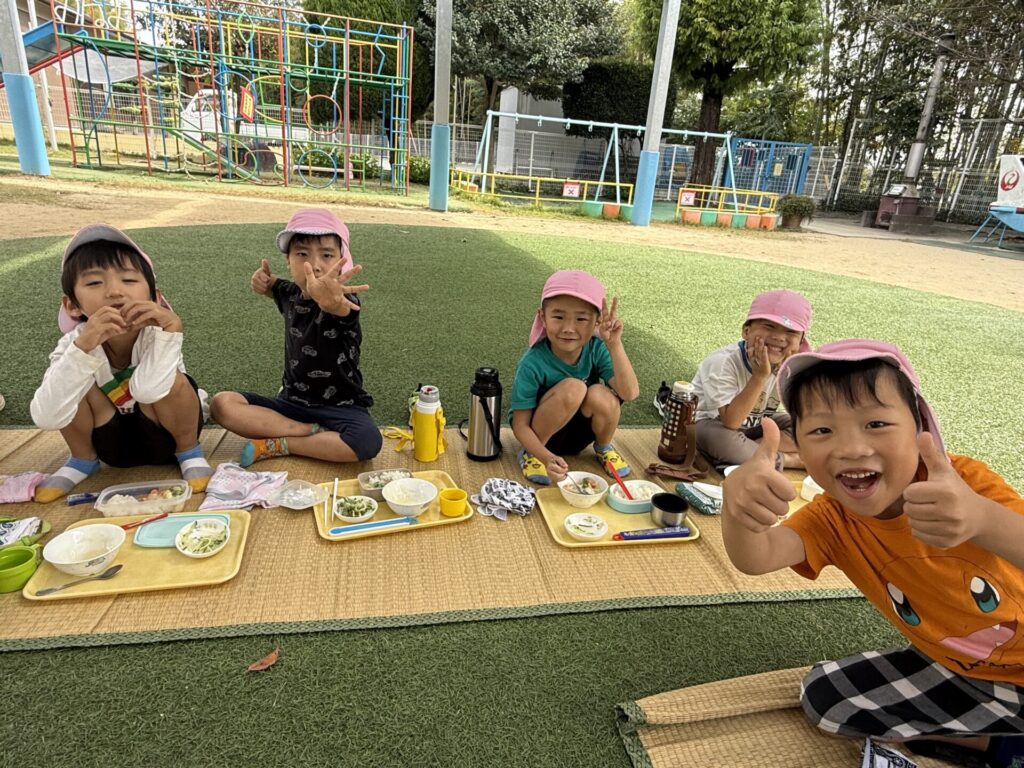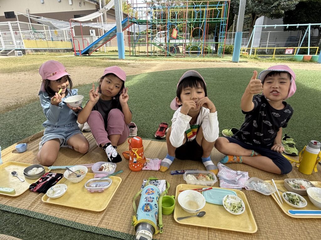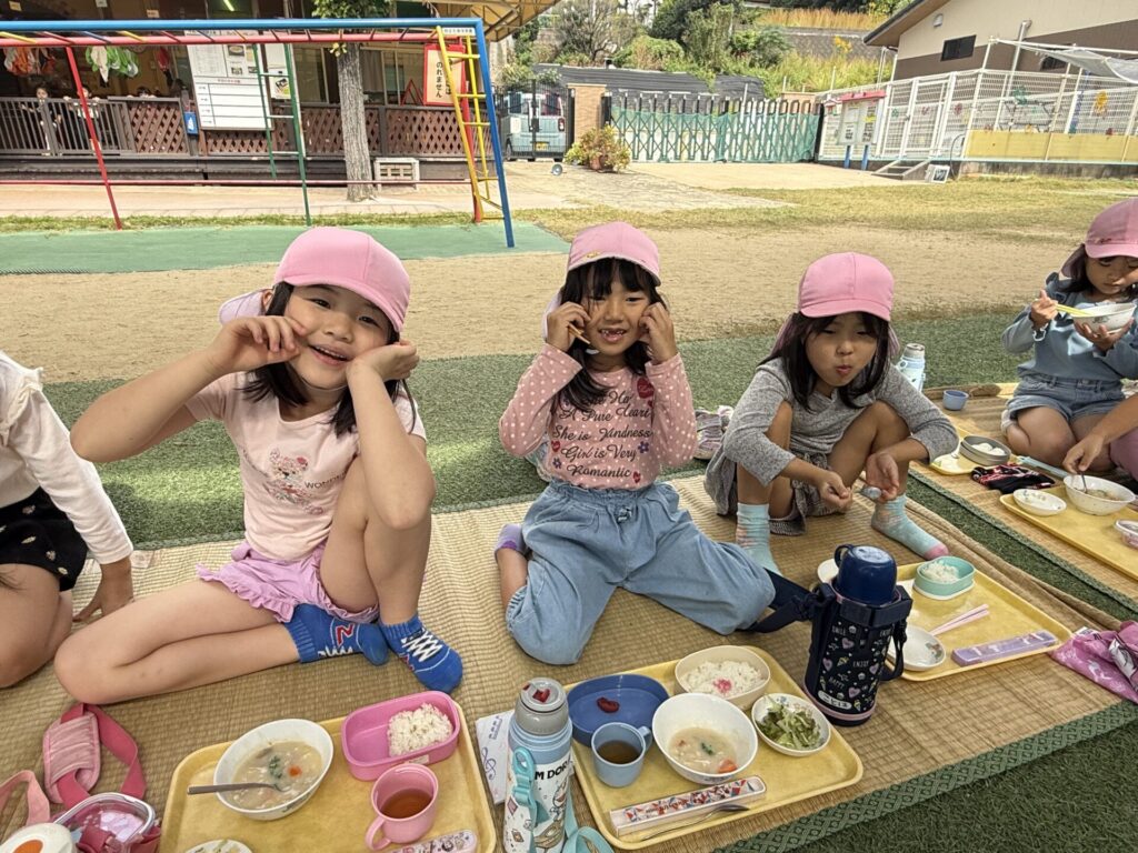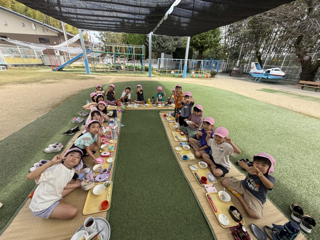 202510.21 ばら組(お外で給食食べたよ) 今日は、さくら組さんがお手伝いしてくれた献立でした! ちょうどいい気候だってので人工芝で給食を食べましたよ✨ 「楽し~!!」「お外で食べるといつもよりもっとおいし~」と モリモリ食べて大満足のばら組さんでした😆