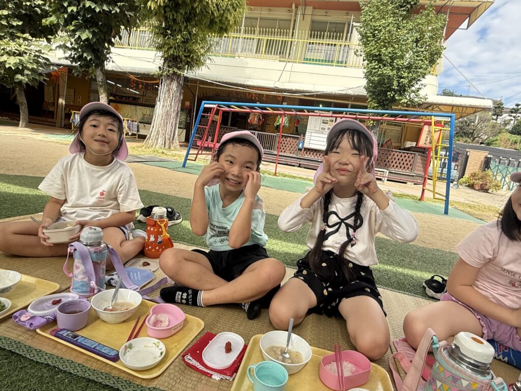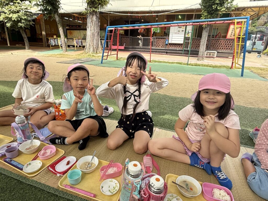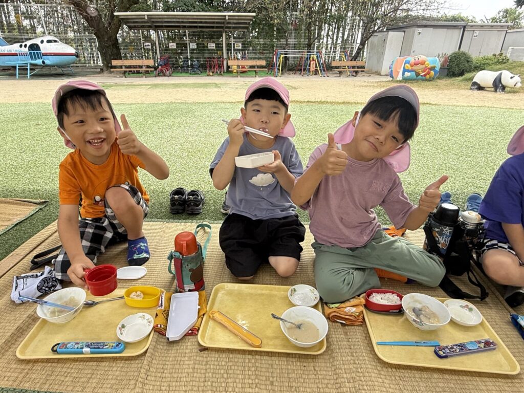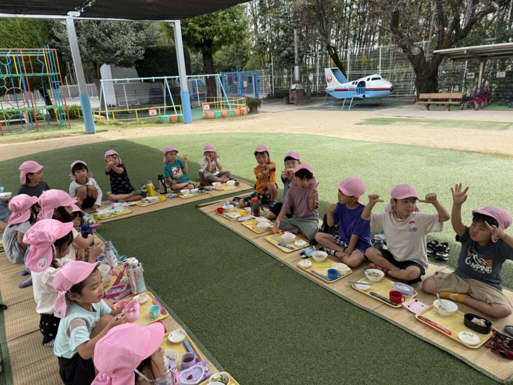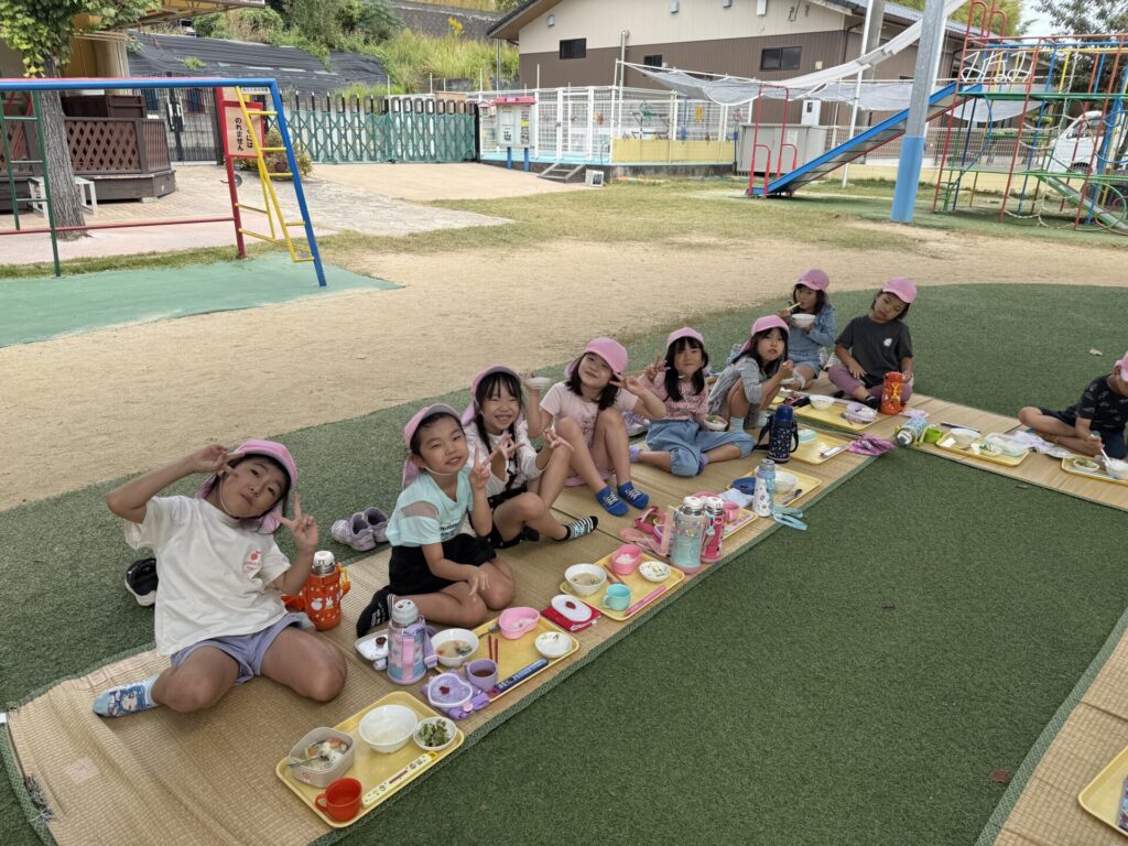 202510.21 ばら組(お外で給食食べたよ) 今日は、さくら組さんがお手伝いしてくれた献立でした! ちょうどいい気候だってので人工芝で給食を食べましたよ✨ 「楽し~!!」「お外で食べるといつもよりもっとおいし~」と モリモリ食べて大満足のばら組さんでした😆