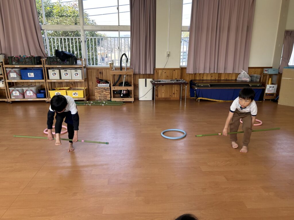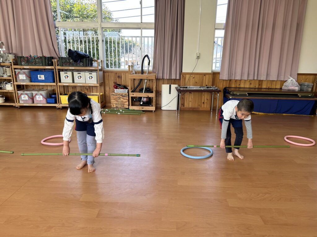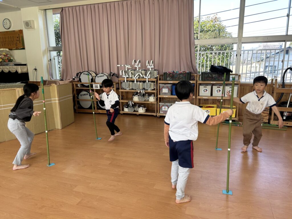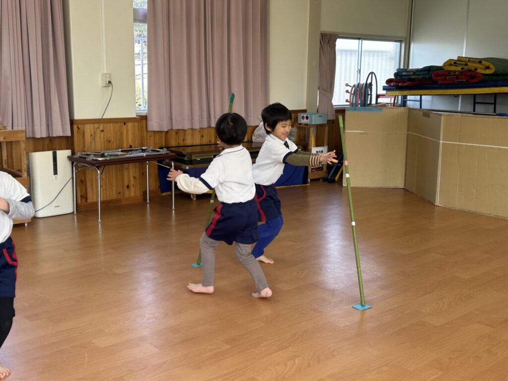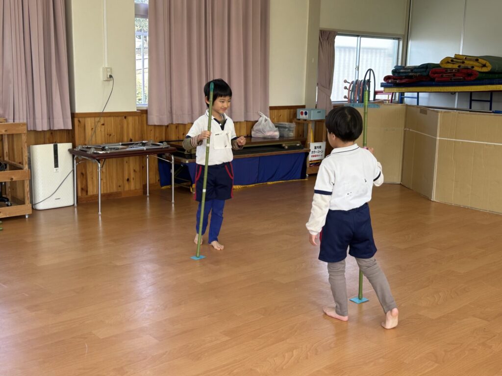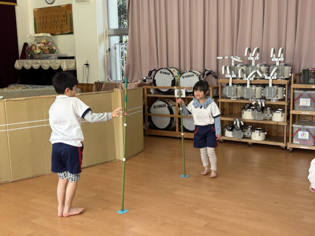 竹の棒を使って、またがったり、ペアのお友達同士で棒を落とさないようにする遊びをしました!!