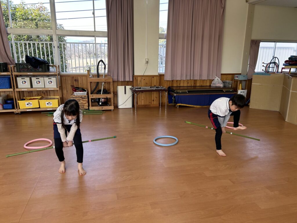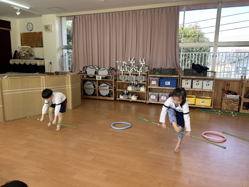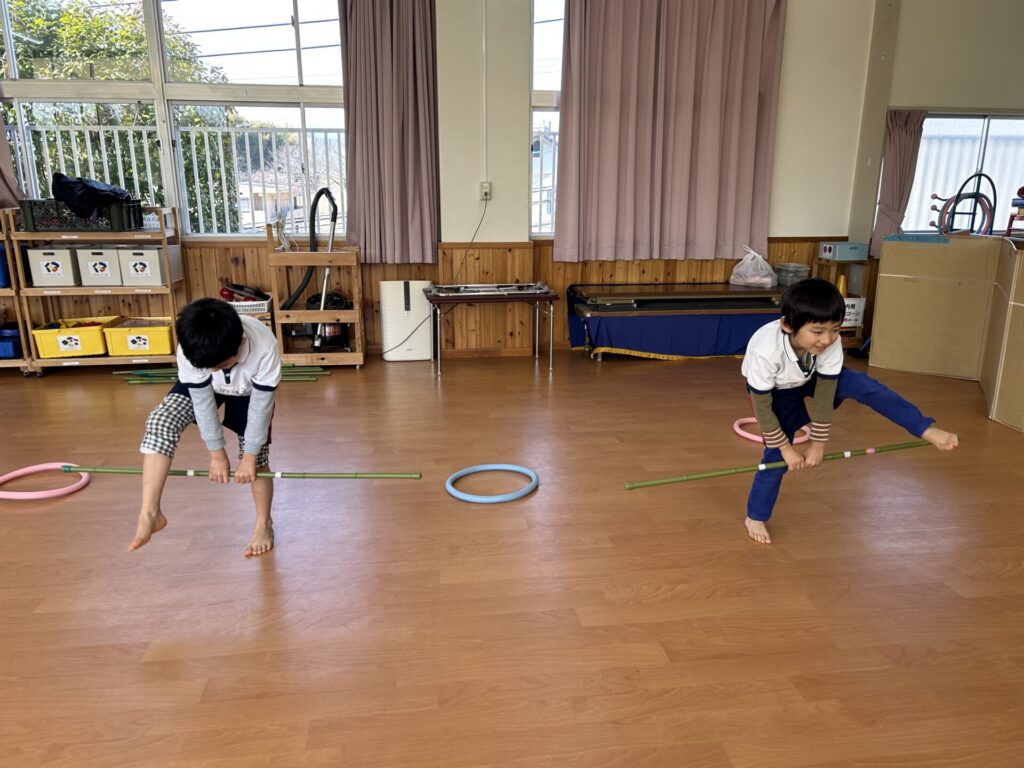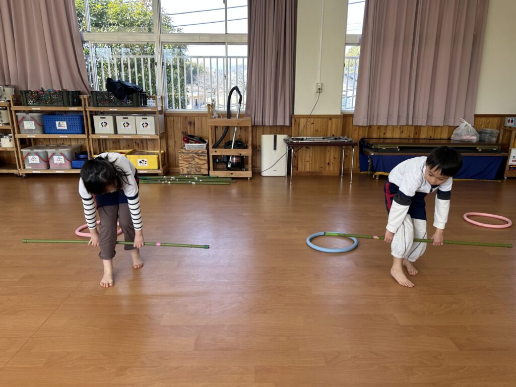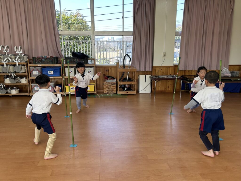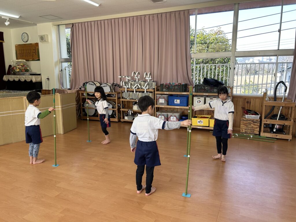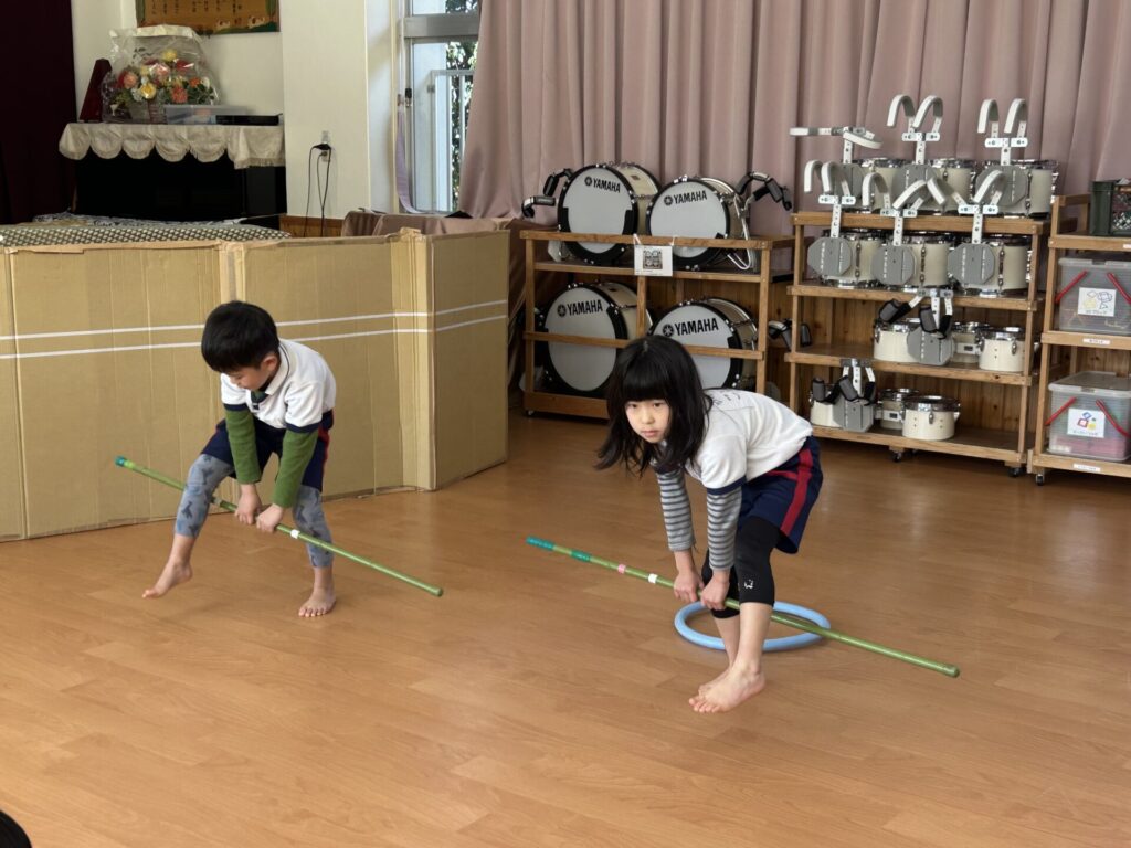竹の棒を使って、またがったり、ペアのお友達同士で棒を落とさないようにする遊びをしました!!