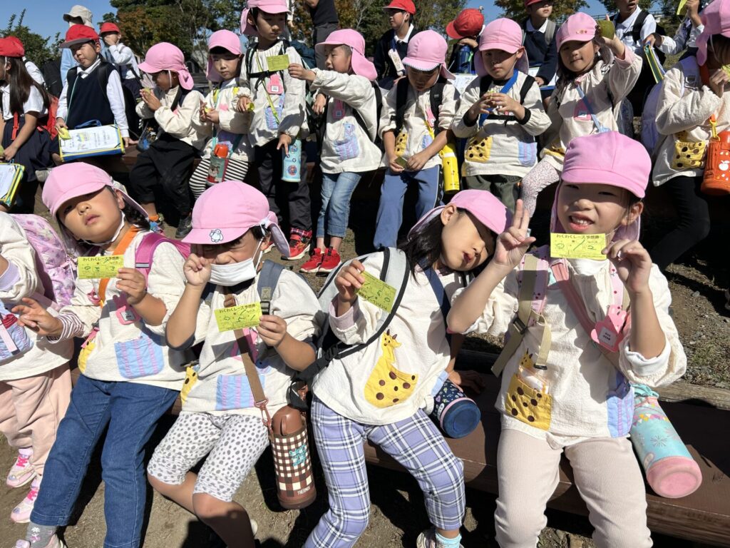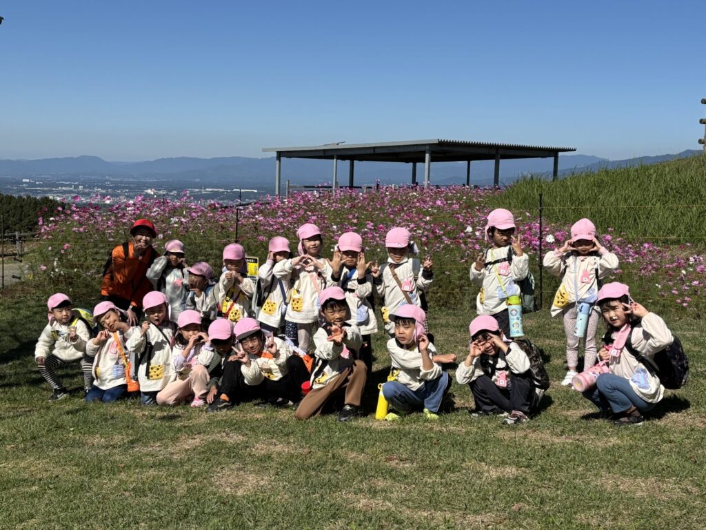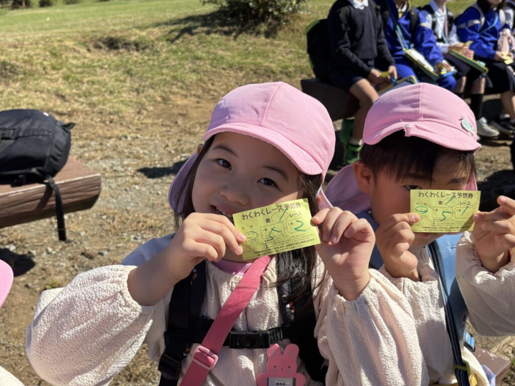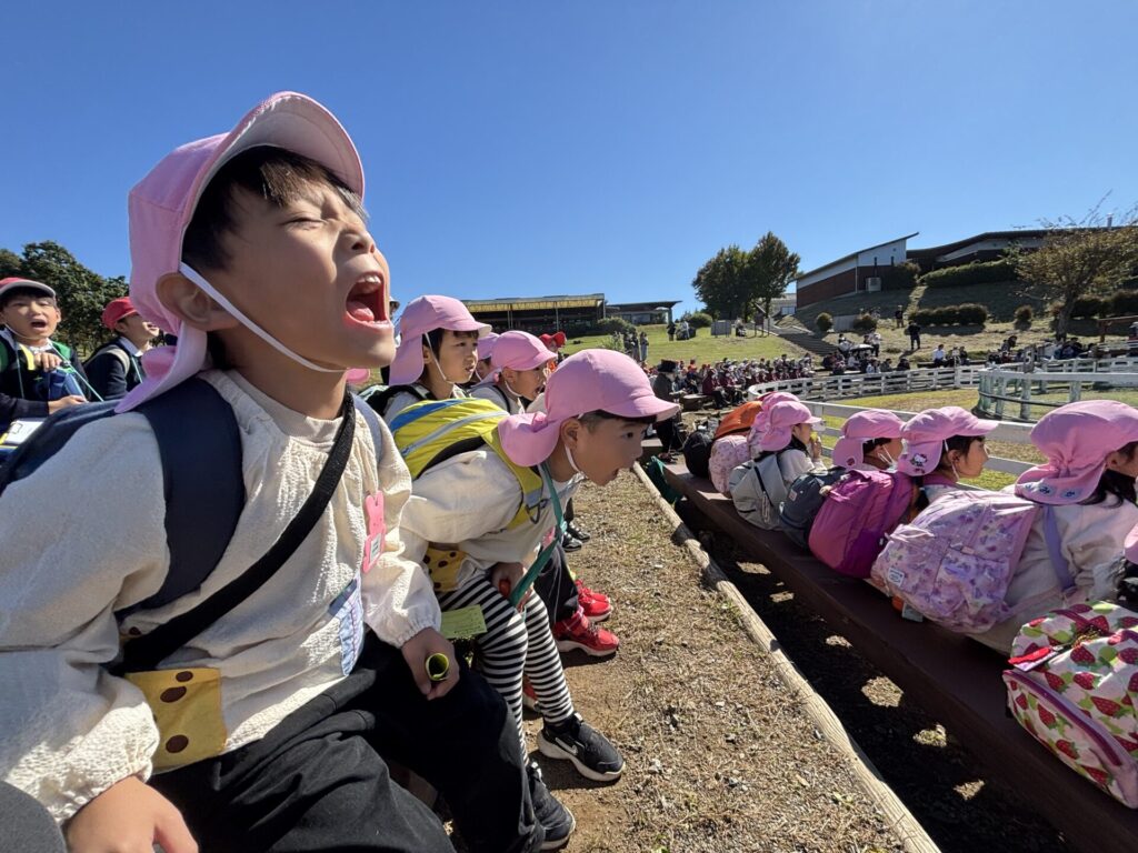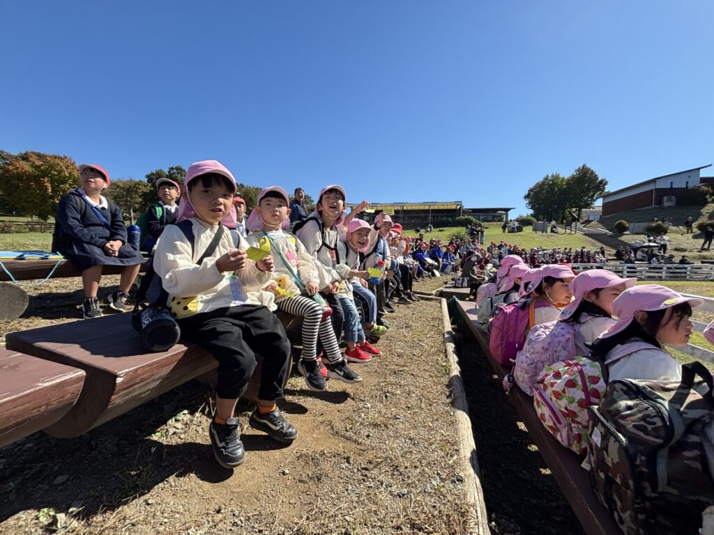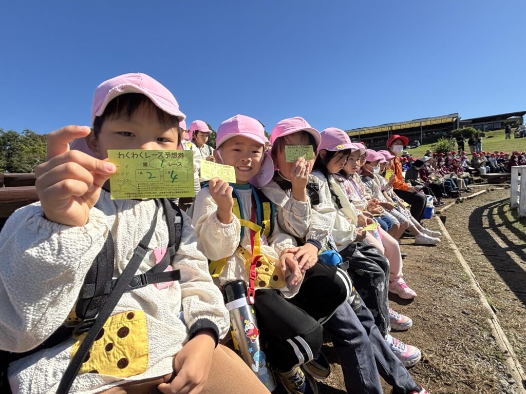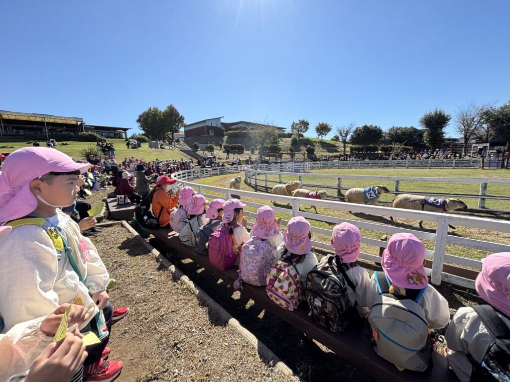 202510.29 ばら組(社会見学)② ●羊のワクワクレースを見学しました! みんなで予想して、なんと一人的中しましたよ✨ ●待ちに待ったお弁当の時間になりました! ●コスモスを背にパシャリ📸 ●最後に集合写真を撮って、ご挨拶をして帰りました😆 帰りのバスはぐっすりでした😌