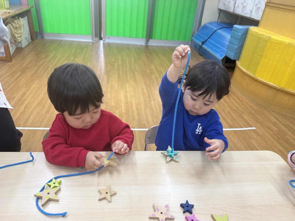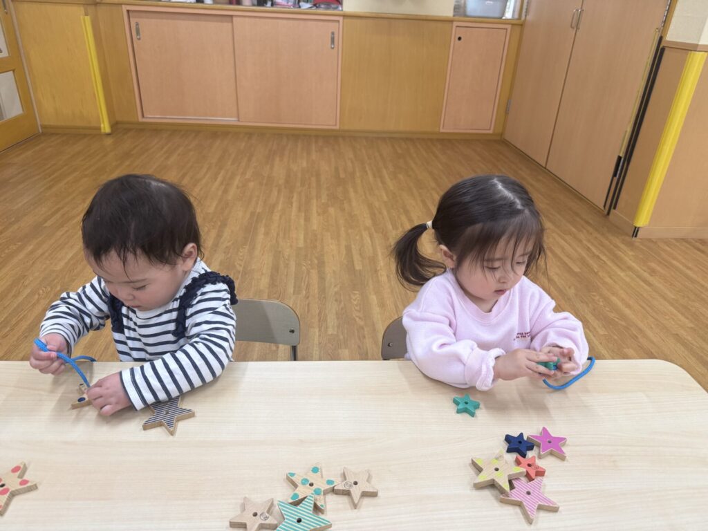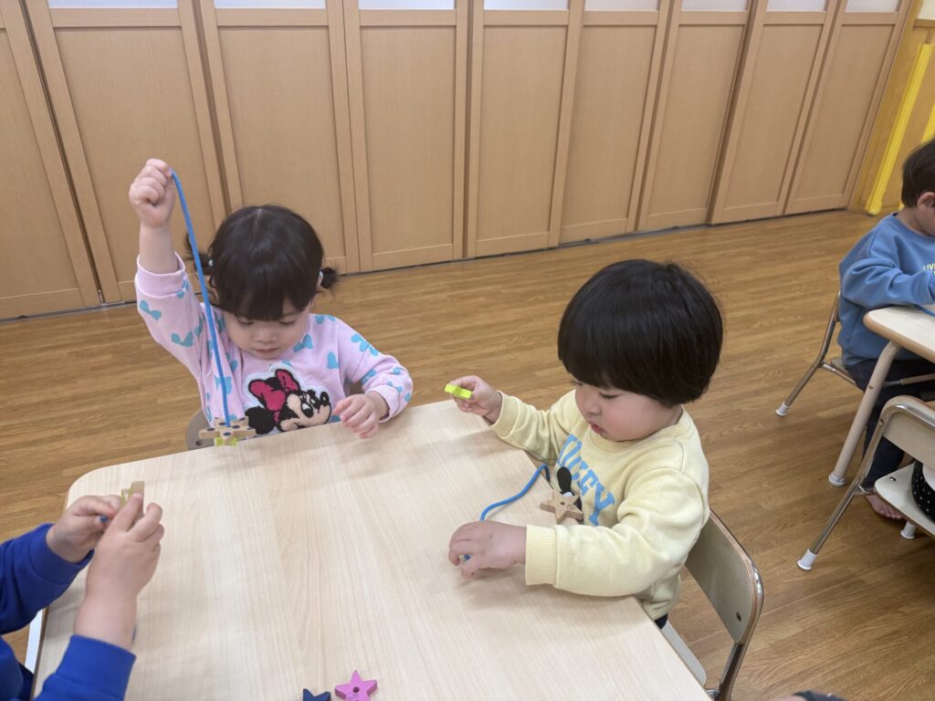 202603.10 もも組1歳児(ひも通し&園庭遊び) ●3/6(金)ひもと押し遊び すみれ組の机と椅子を使って、ひも通しをしました! 小さい穴にヒモを上手に通すことができていたお友だちでした💖 ●3/9(月)園庭遊び ポカポカ春のあたたかい日和。元気に外遊びを楽しみましたよ🎶