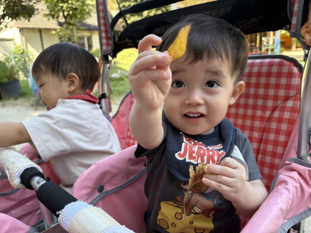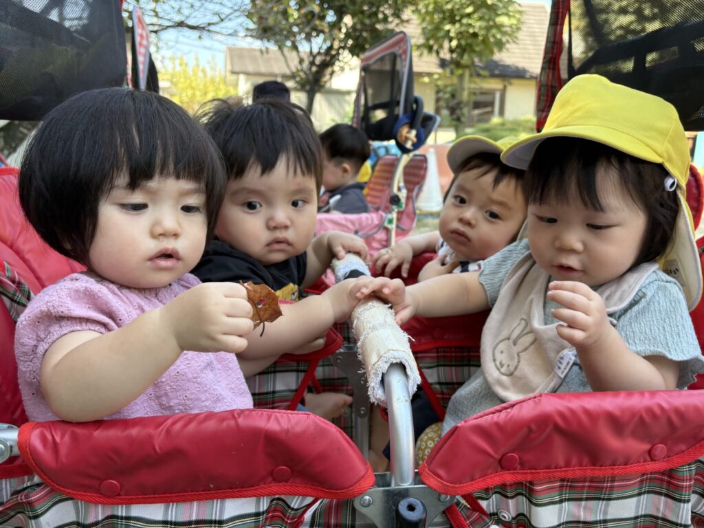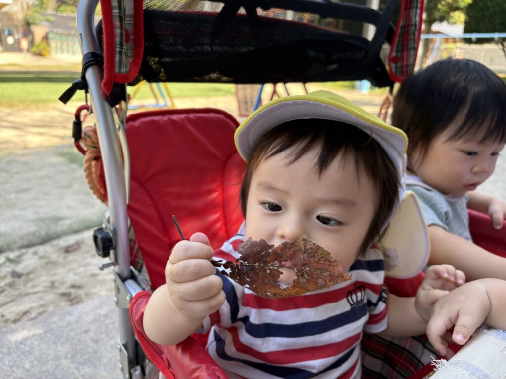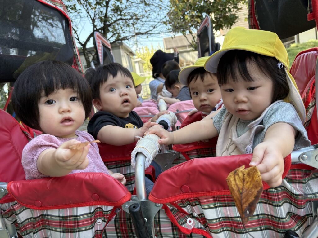 落ち葉を見つけたり、触ったりし、ニコニコな子どもたちです💖