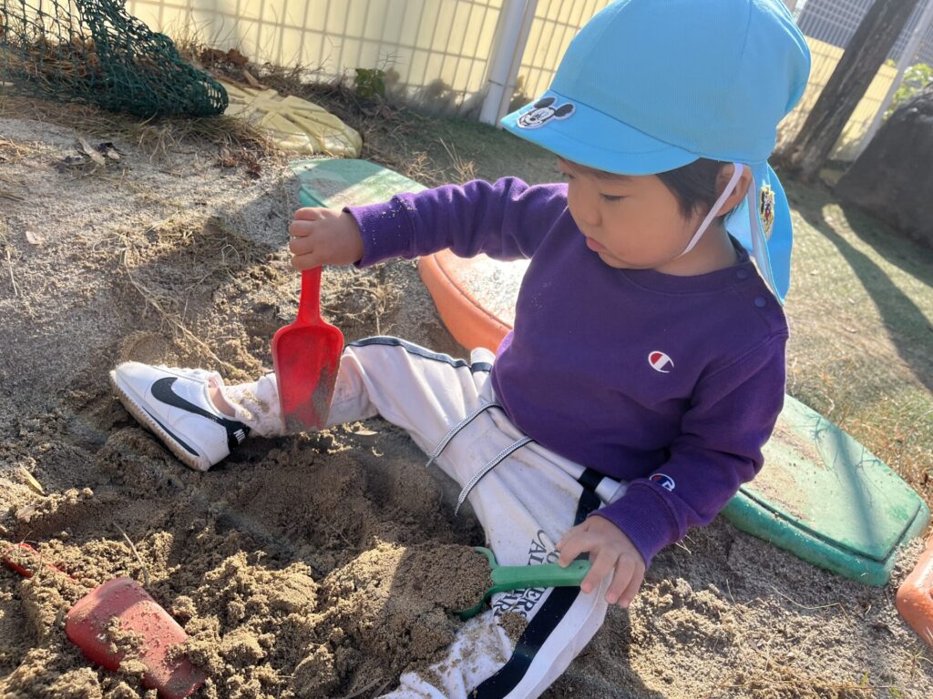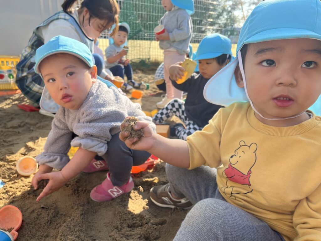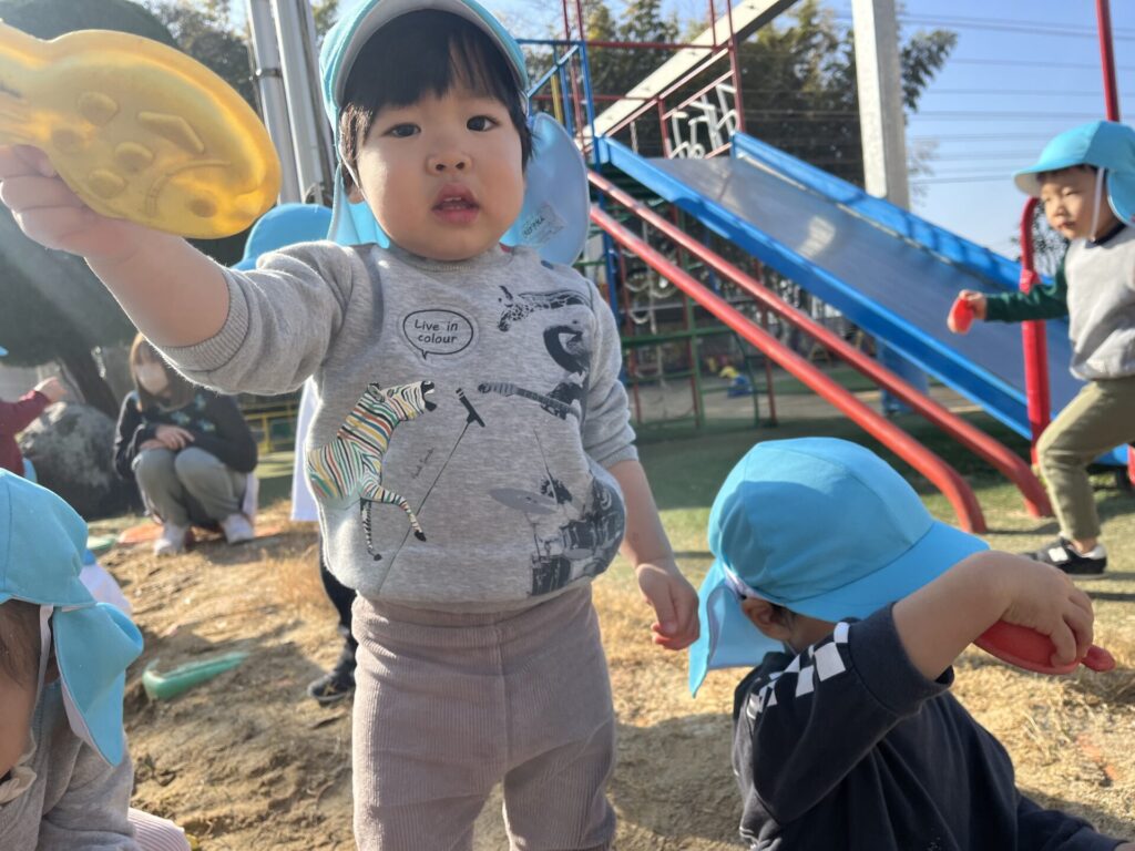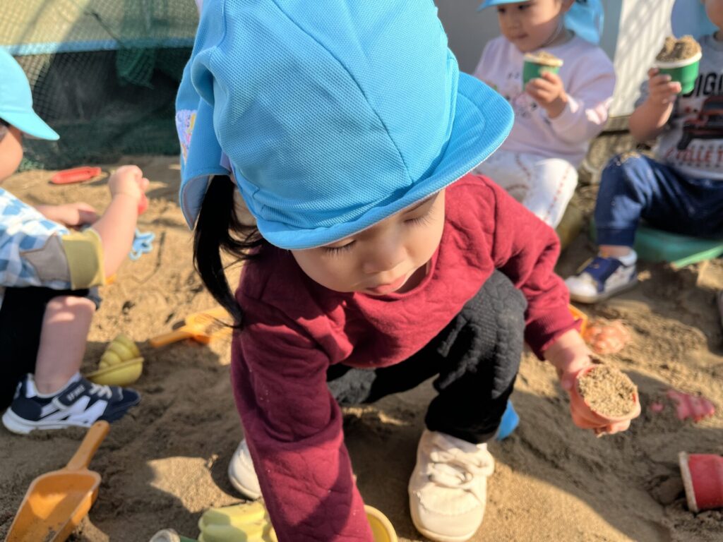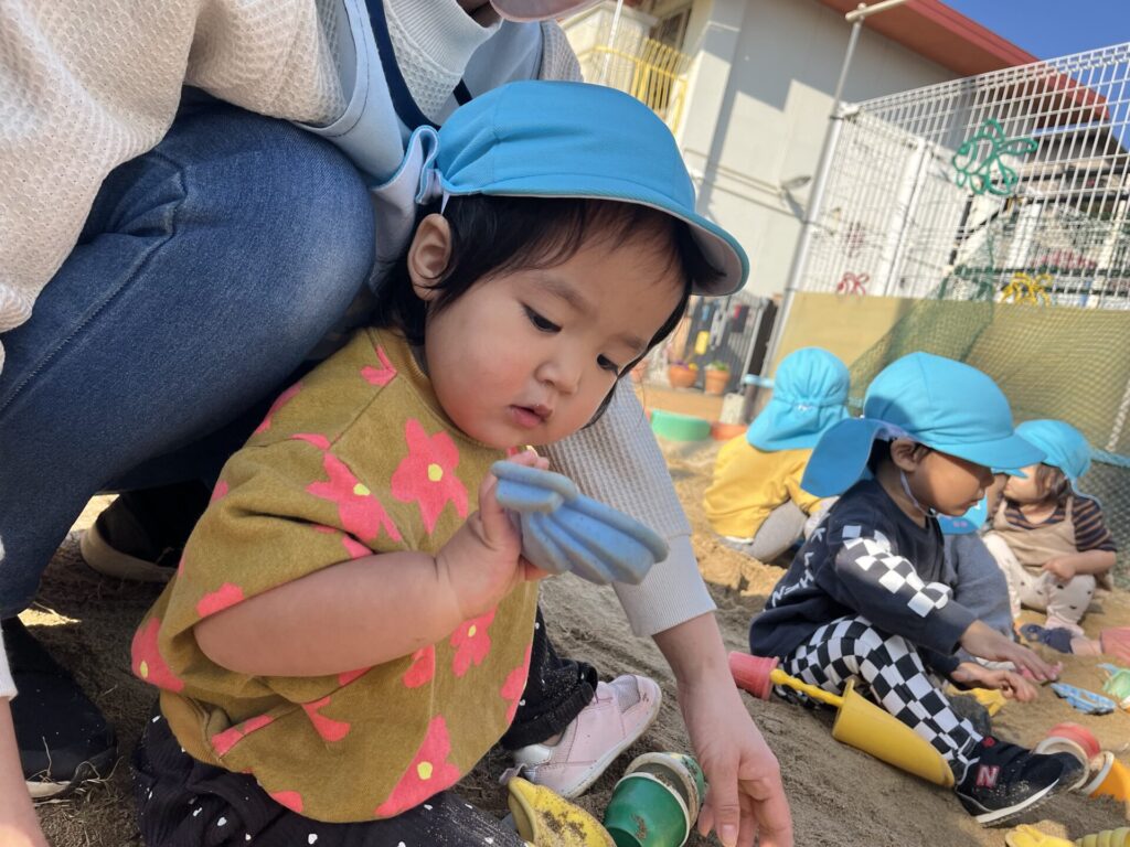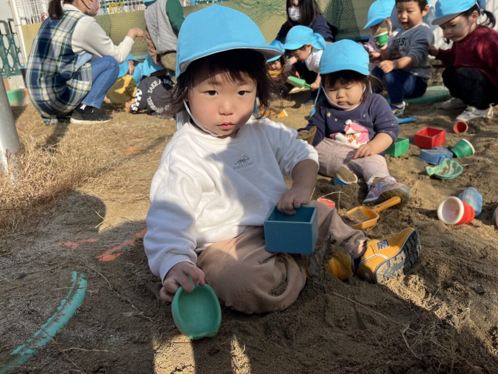 202512.19 もも1歳児(R7/12/18) 12/18(木)砂場遊びをしました! スコップで型に砂を入れるのがとても上手になってきたもも組さんです✨ 温かい日差しの中、砂の感触を楽しむことができました💖