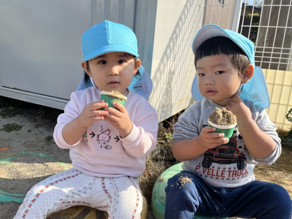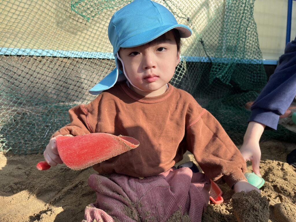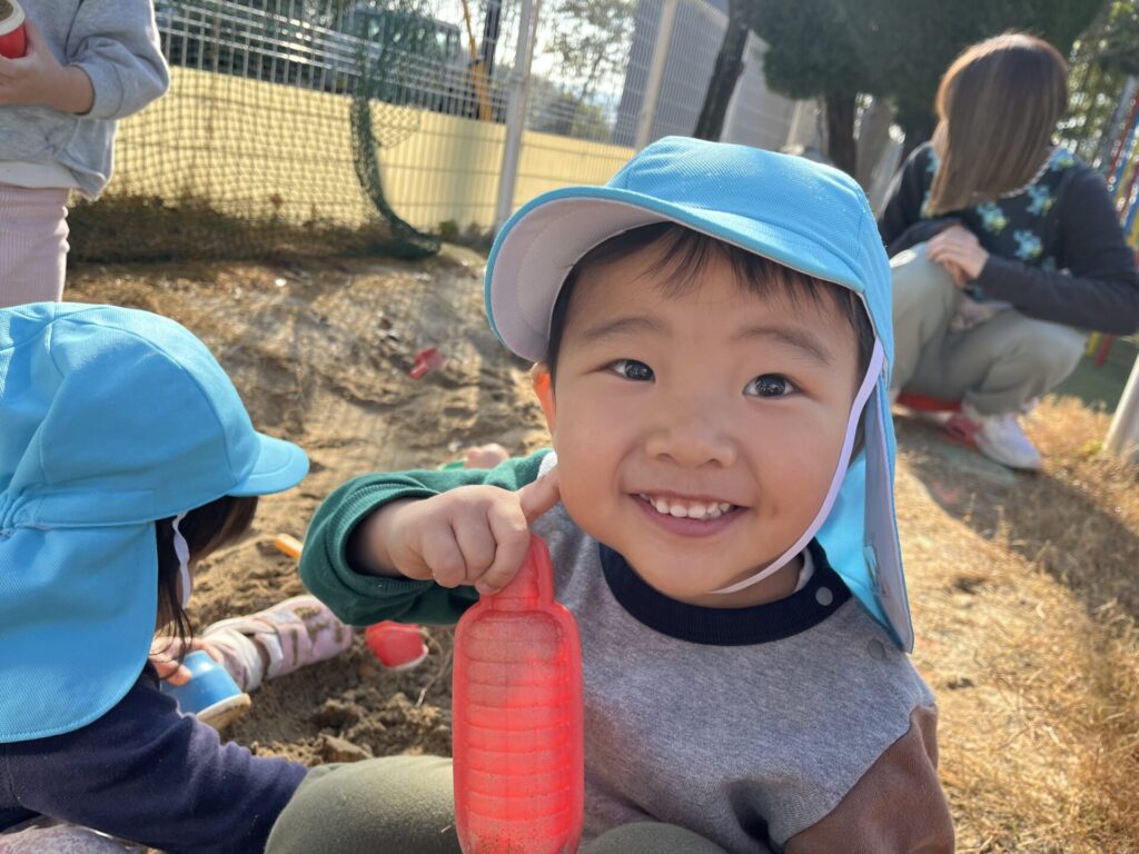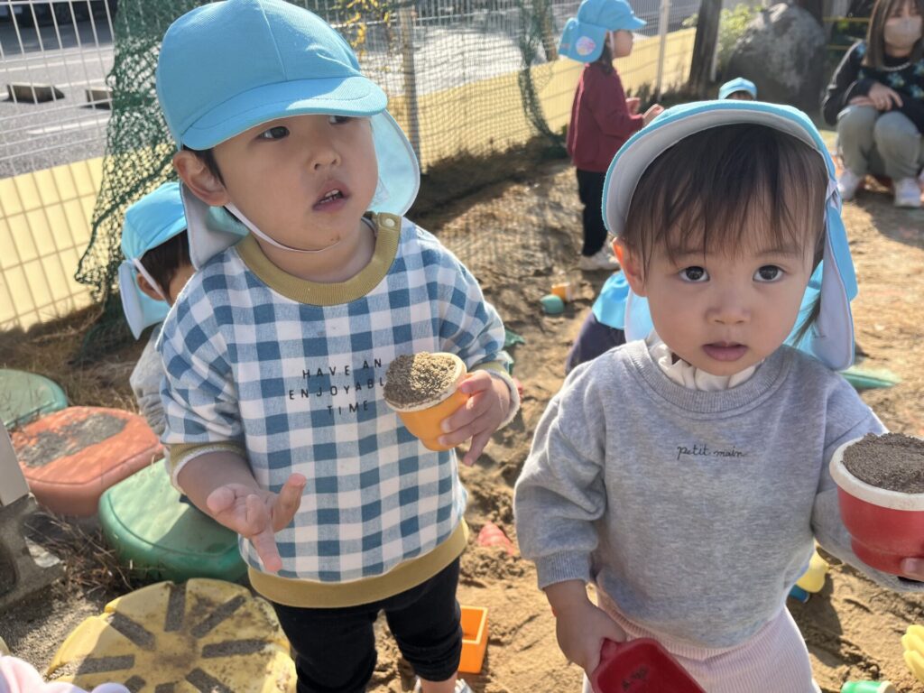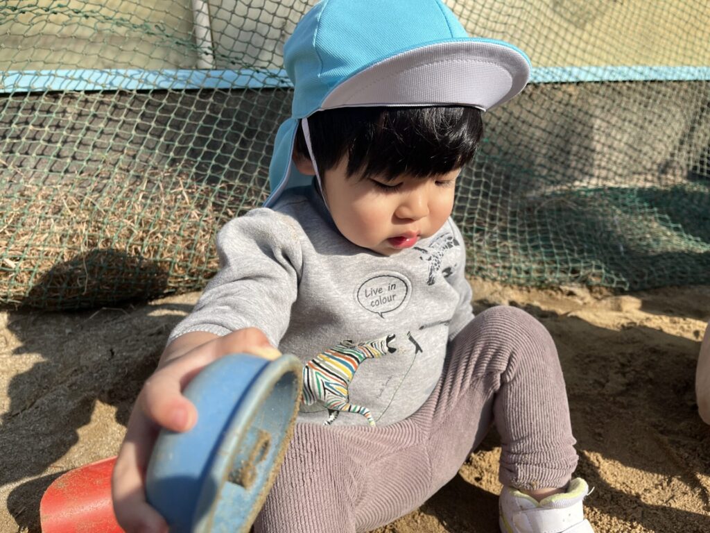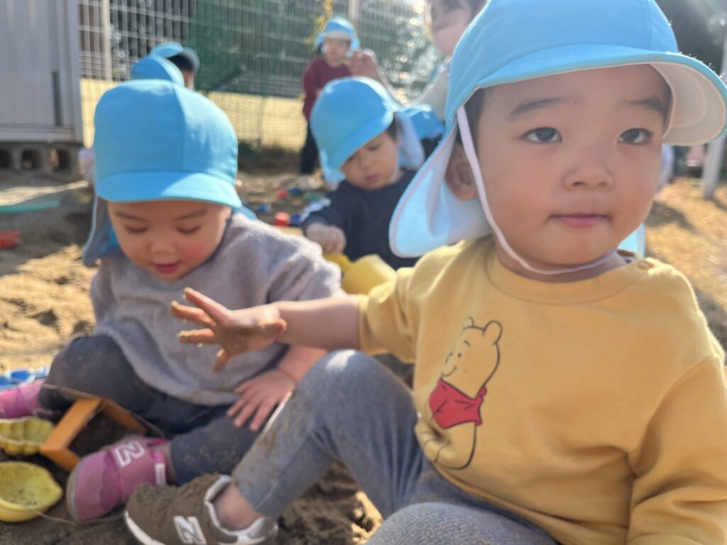 202512.19 もも1歳児(R7/12/18) 12/18(木)砂場遊びをしました! スコップで型に砂を入れるのがとても上手になってきたもも組さんです✨ 温かい日差しの中、砂の感触を楽しむことができました💖