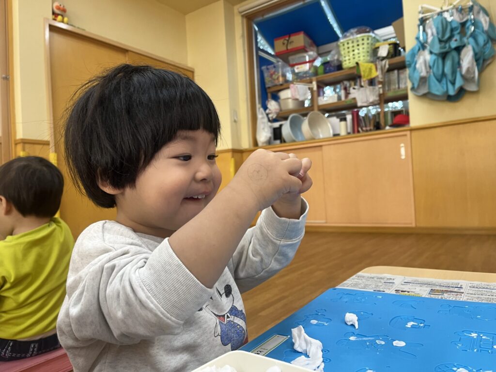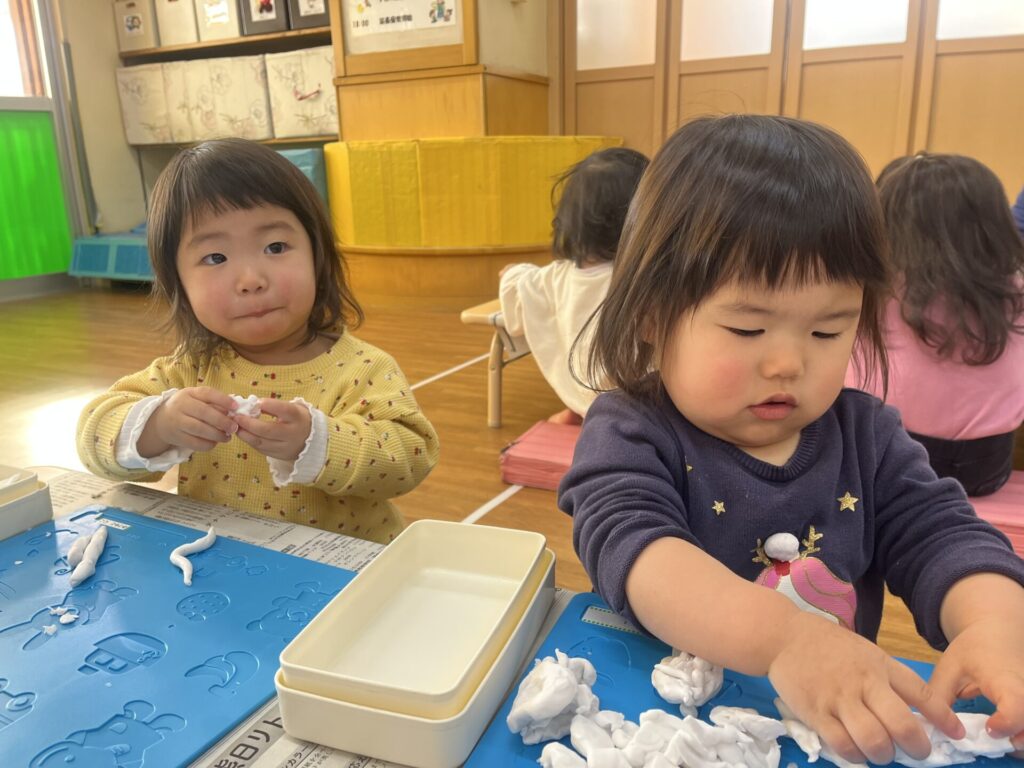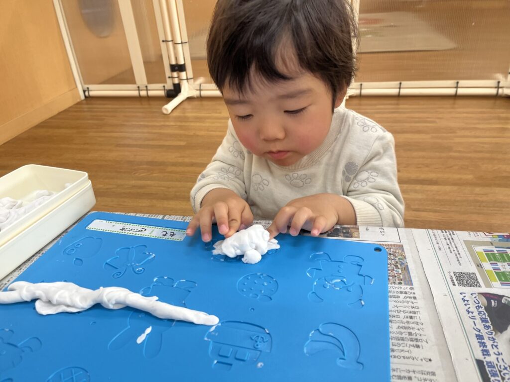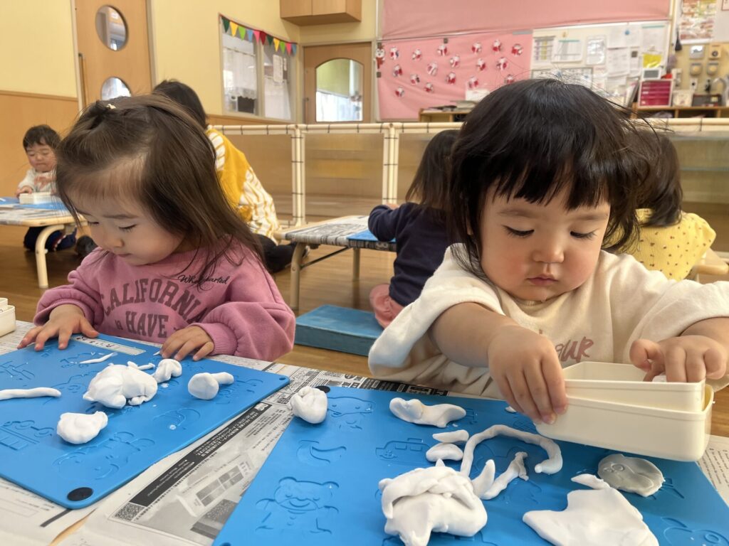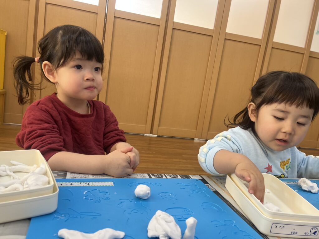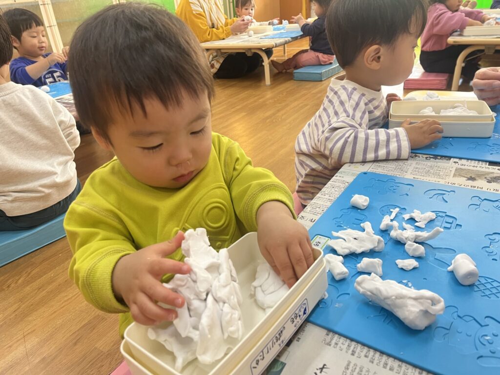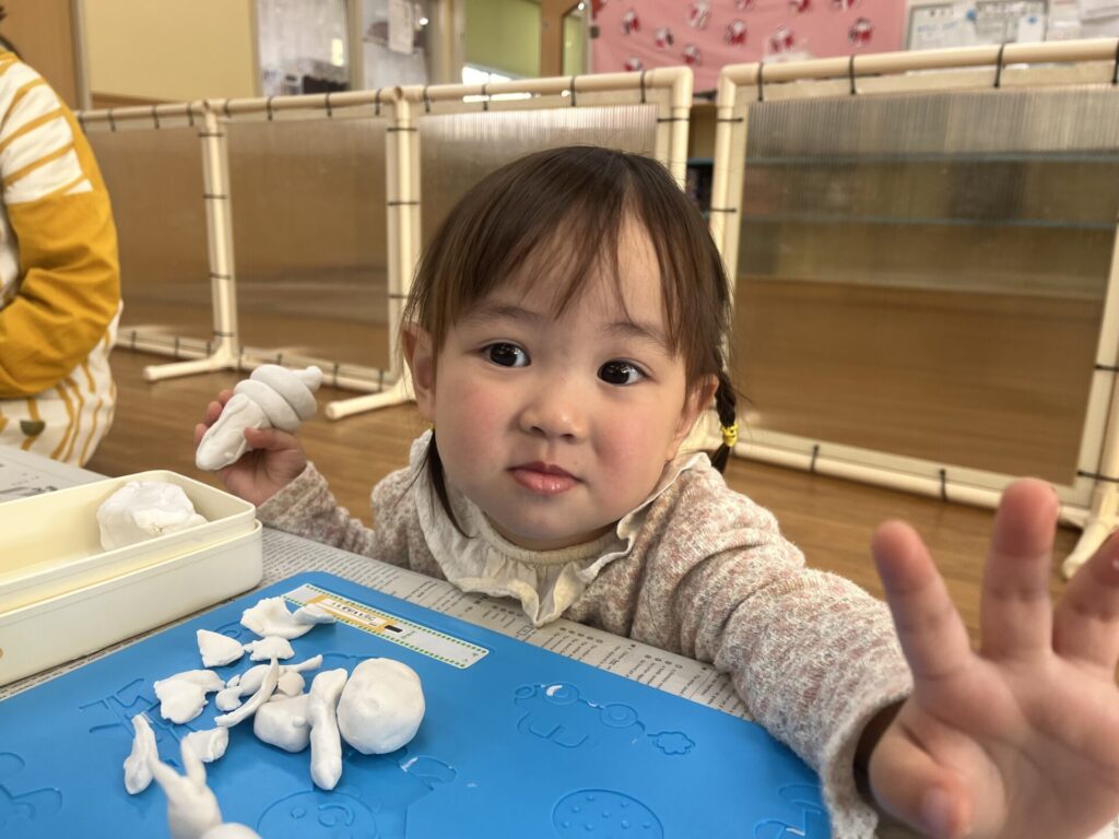 202601.23 もも1歳児(粘土遊び) 今日は、粘土遊びをしました! ヘビを作ったり、手をコロコロさせてお団子を作ったりと 好きな形を作って楽しみました✨ 担任にも「ギョーザ作って~」「ラーメン作って~」と上手にリクエストを してくれる、もも組1歳児さんです🎶