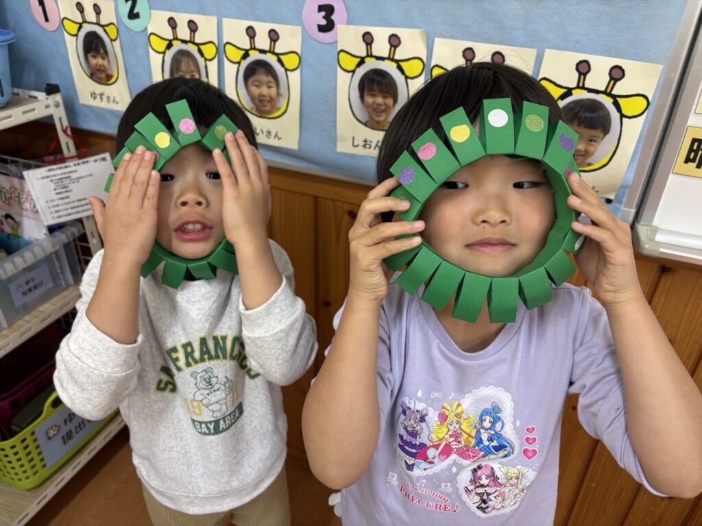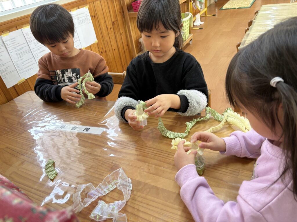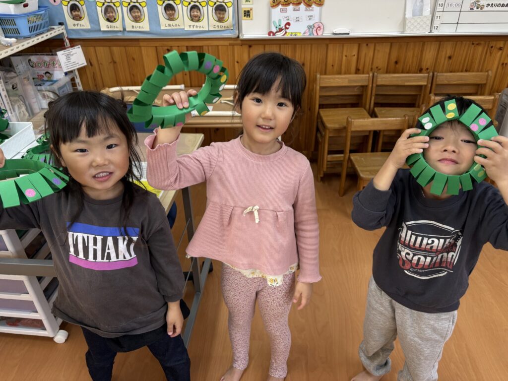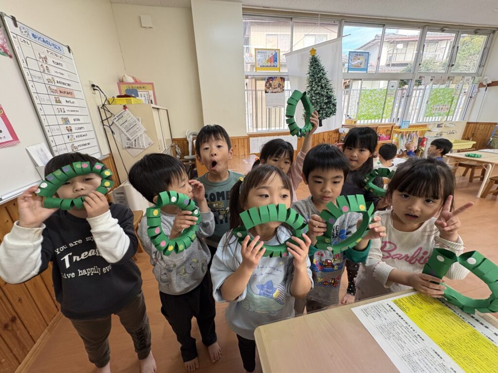 202512.02 ゆり組(クリスマス制作) クリスマス制作で、リースとツリーを作りました! リースはハサミで切り込みを入れて丸く形を整え、デコレーションしました✨ ツリーには好きなリボンを選んで巻き付け、シールも貼って仕上げましたよ。 リースはライトで光るので、ぜひお家に持ち帰ったら、光らせてみてください💖