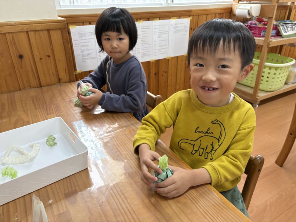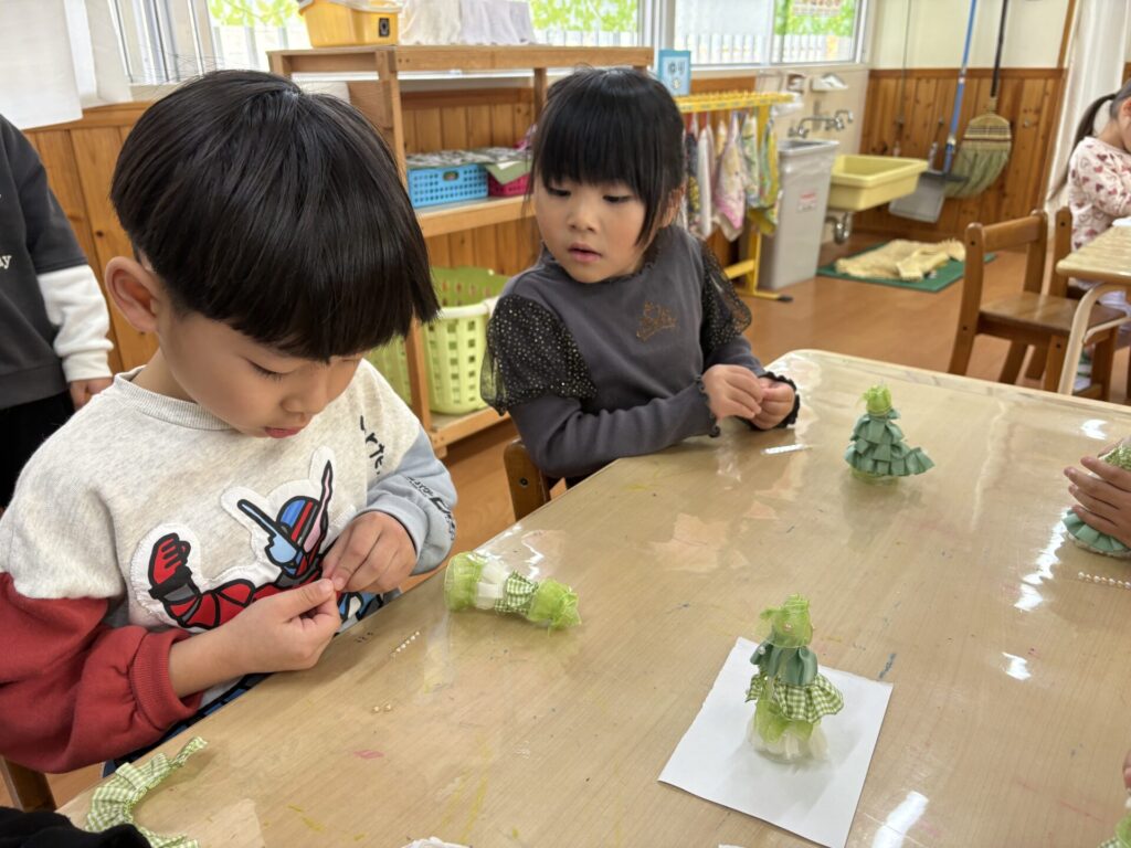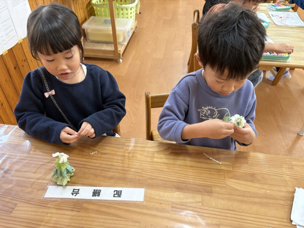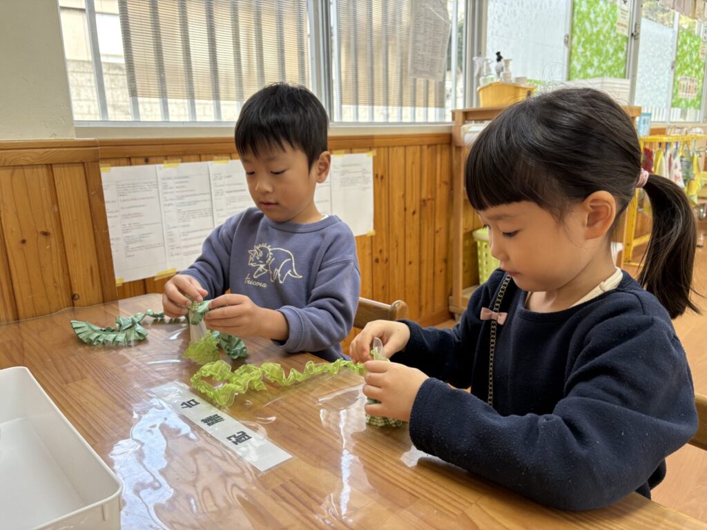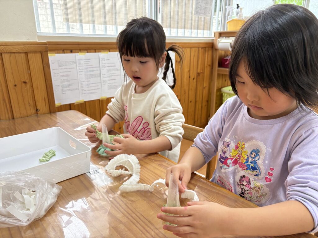 202512.02 ゆり組(クリスマス制作) クリスマス制作で、リースとツリーを作りました! リースはハサミで切り込みを入れて丸く形を整え、デコレーションしました✨ ツリーには好きなリボンを選んで巻き付け、シールも貼って仕上げましたよ。 リースはライトで光るので、ぜひお家に持ち帰ったら、光らせてみてください💖