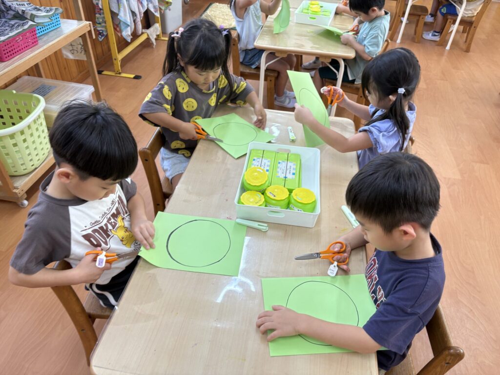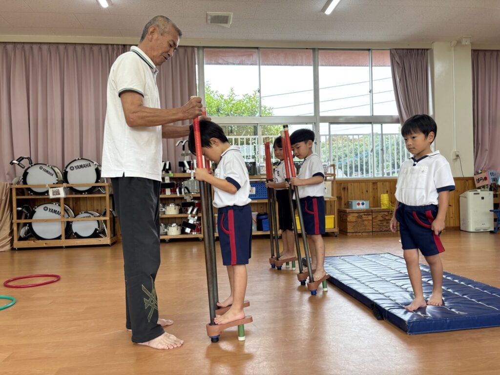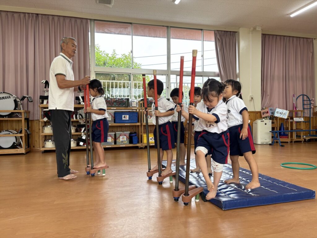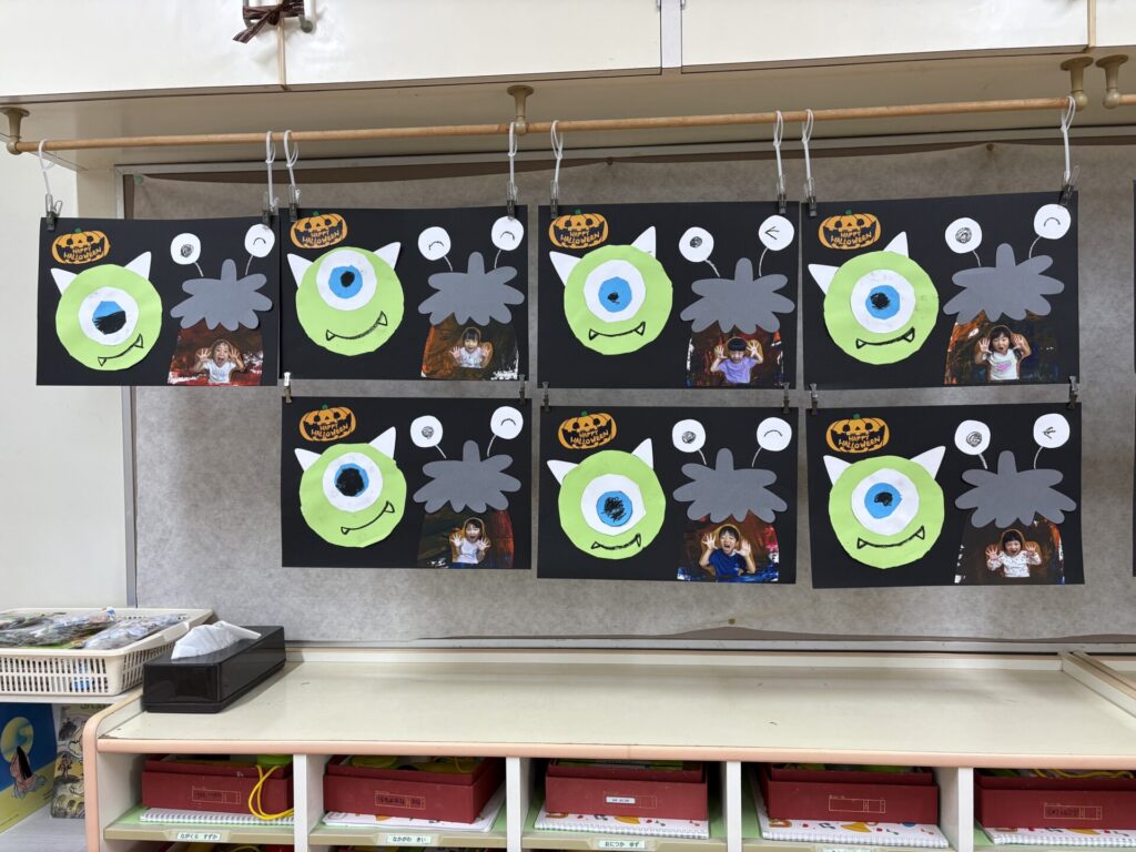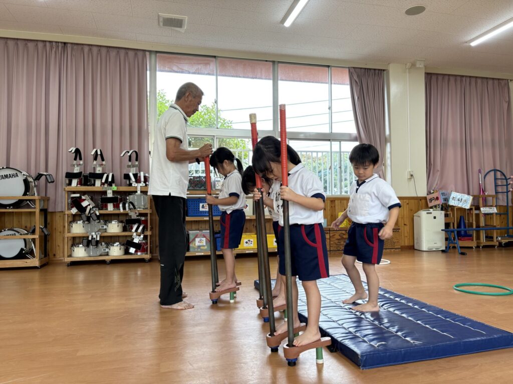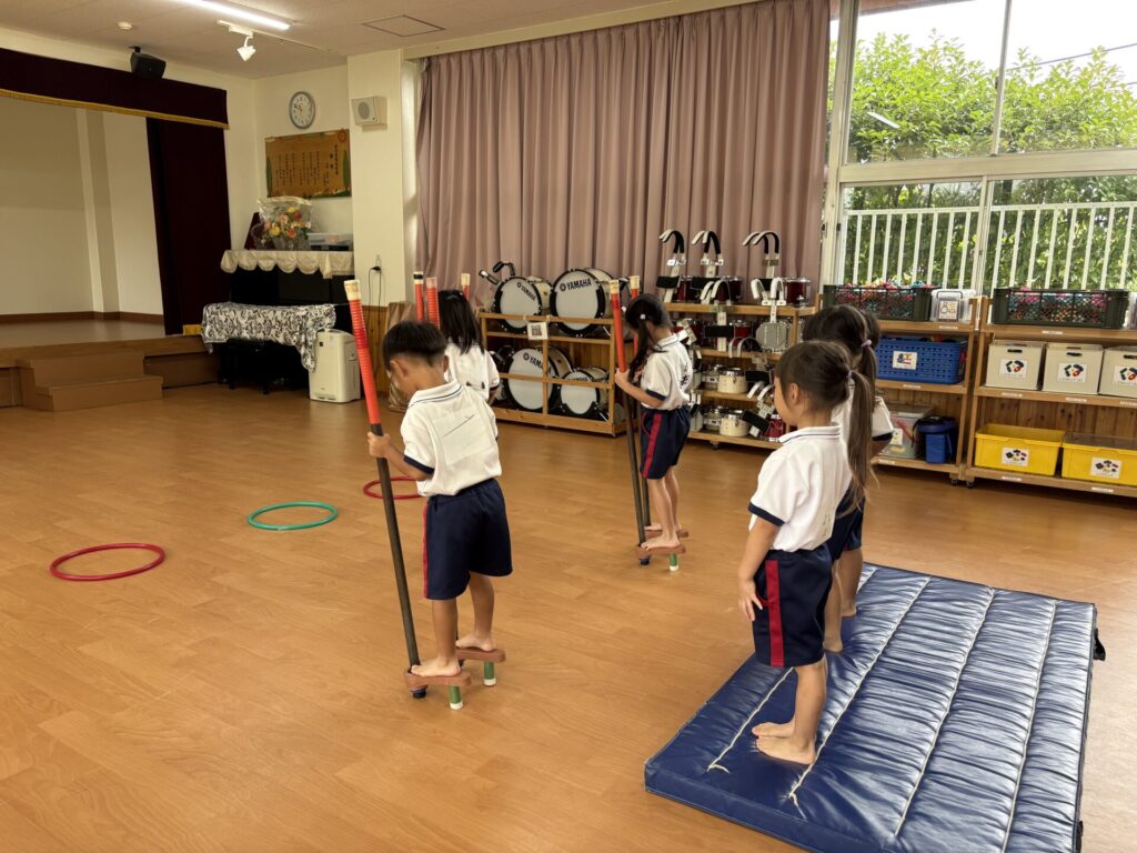 202510.03 ゆり組(R7/10/1、3) ●10/1(水)10月の壁面が完成しました! 丸くハサミで画用紙を切ったり、牛乳パックで絵具を伸ばしたりしましたよ✨ ●10/3(金)今日は、体操教室がありました! 「竹馬」に乗って、バランス感覚を鍛えましたよ💪