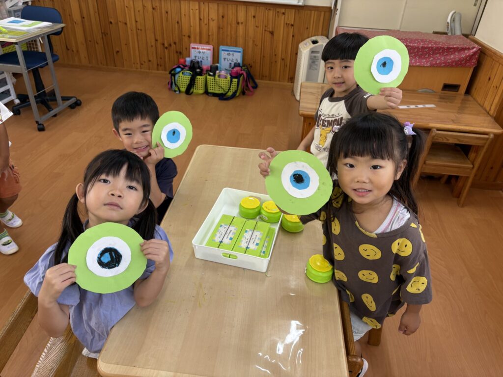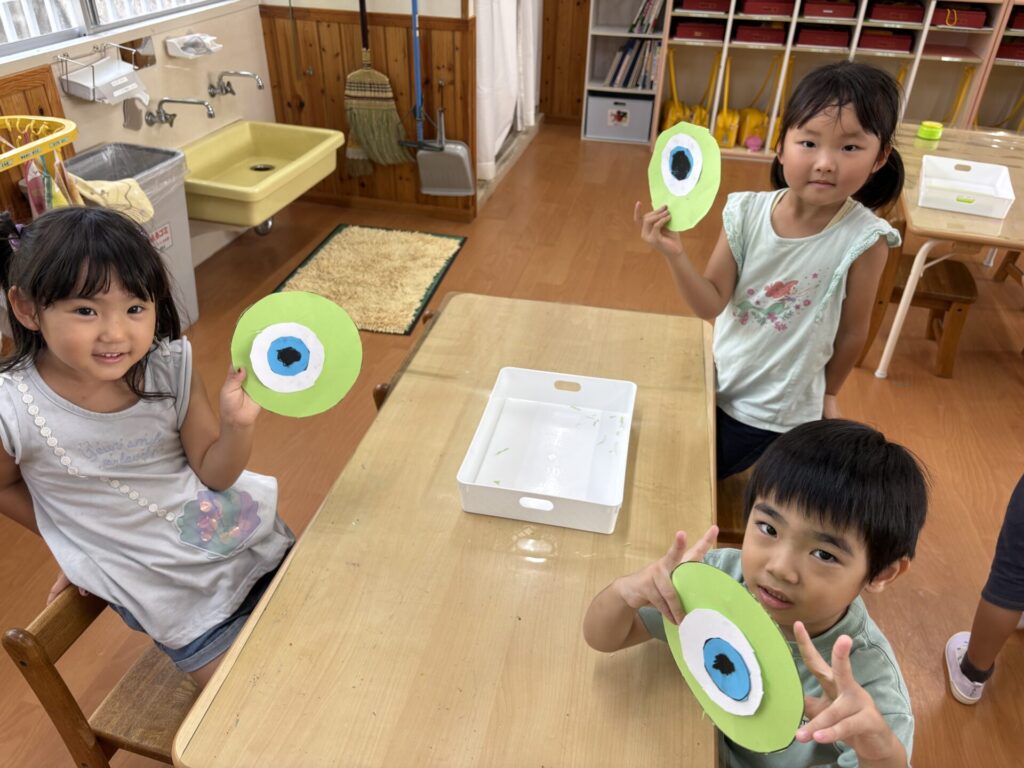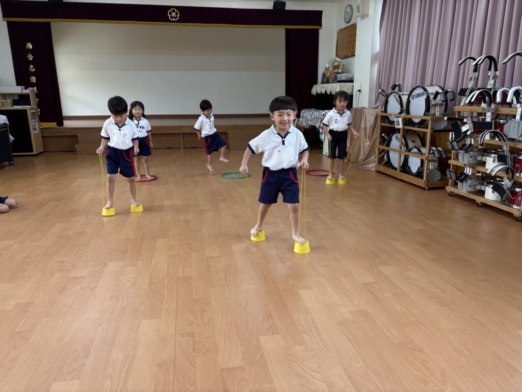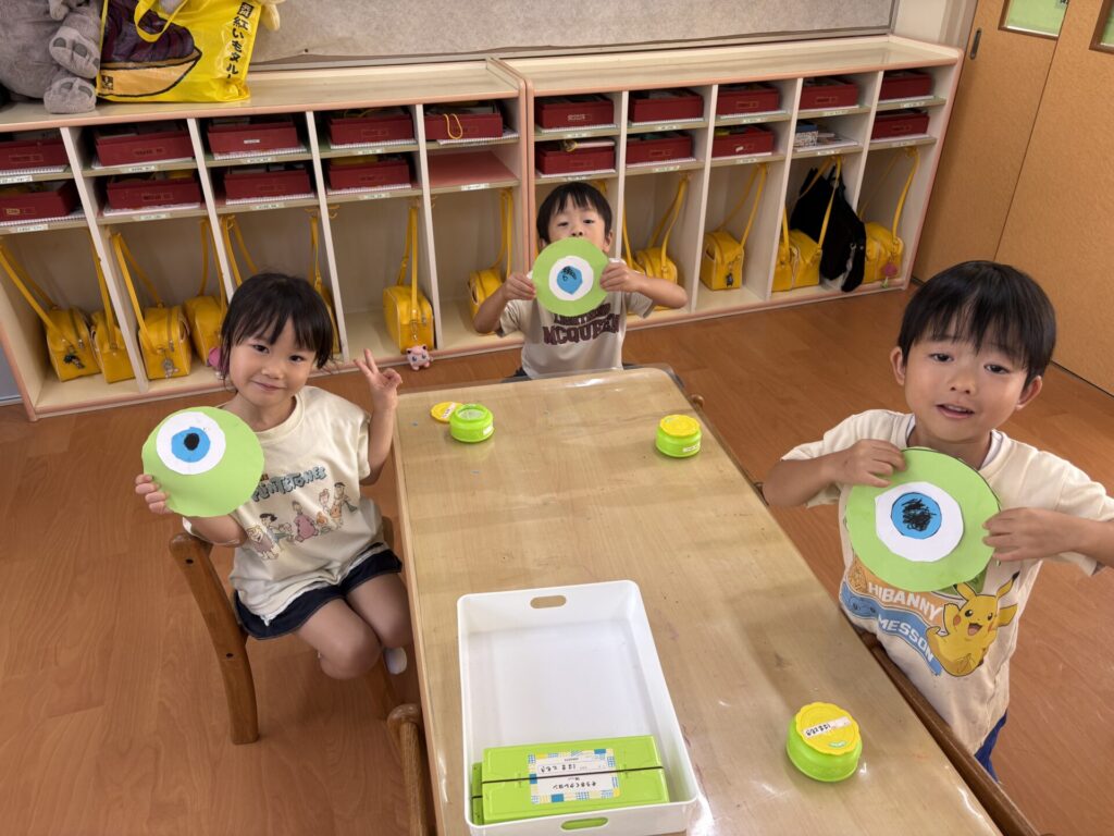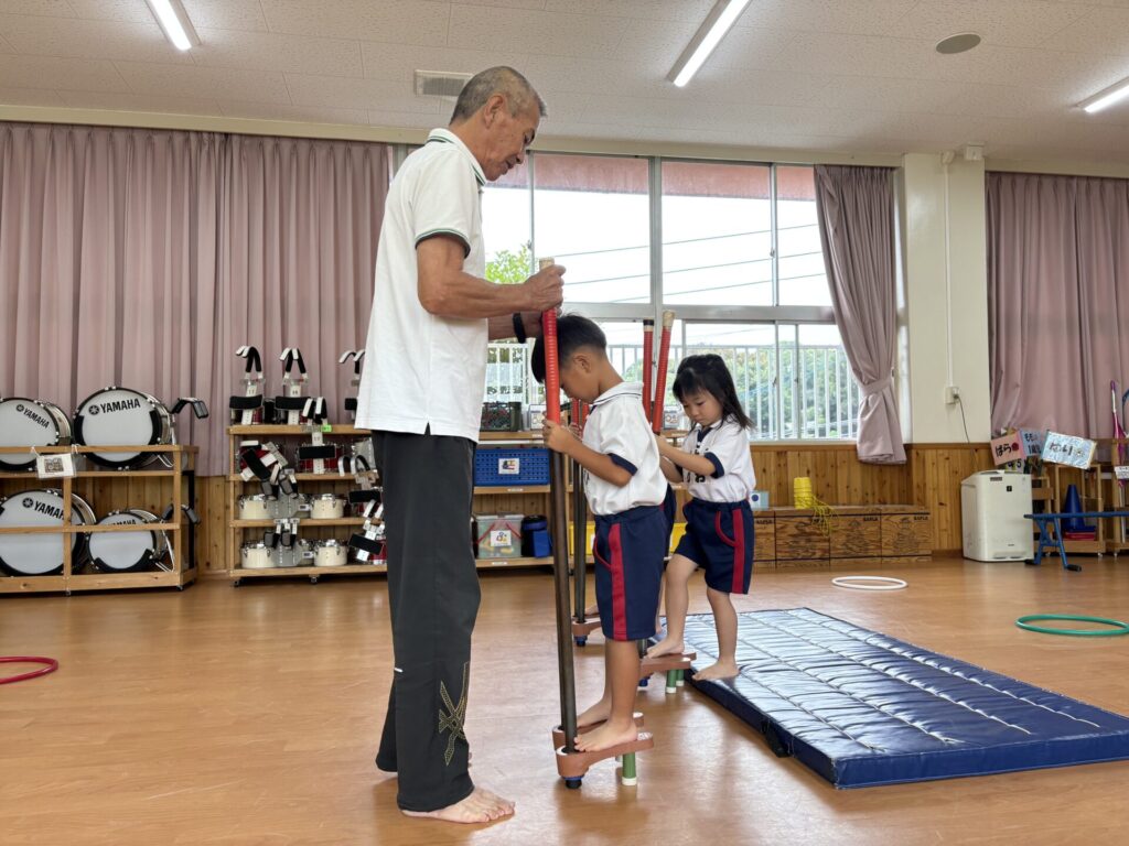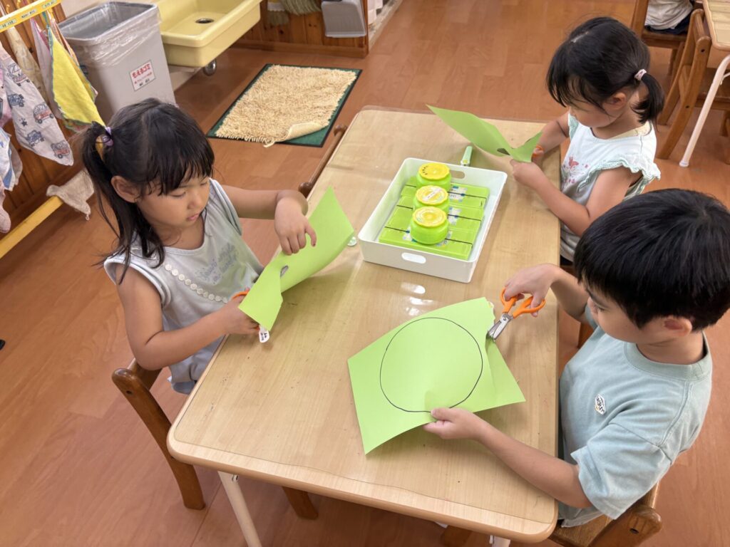 202510.03 ゆり組(R7/10/1、3) ●10/1(水)10月の壁面が完成しました! 丸くハサミで画用紙を切ったり、牛乳パックで絵具を伸ばしたりしましたよ✨ ●10/3(金)今日は、体操教室がありました! 「竹馬」に乗って、バランス感覚を鍛えましたよ💪