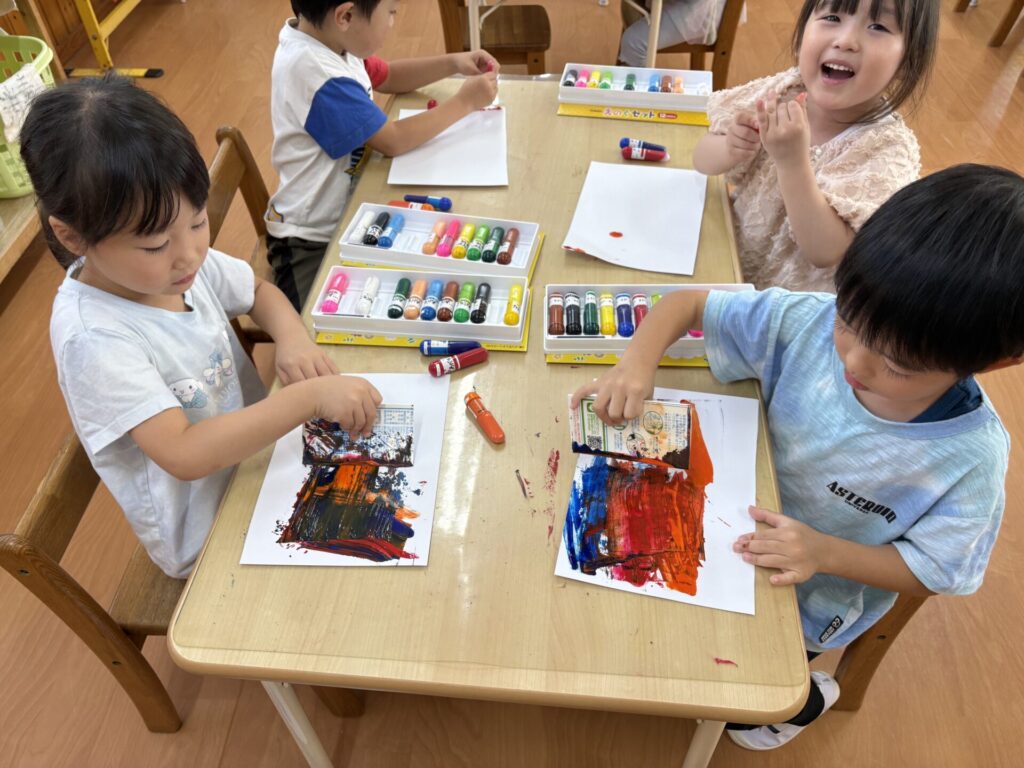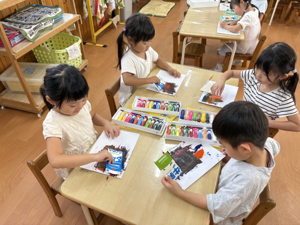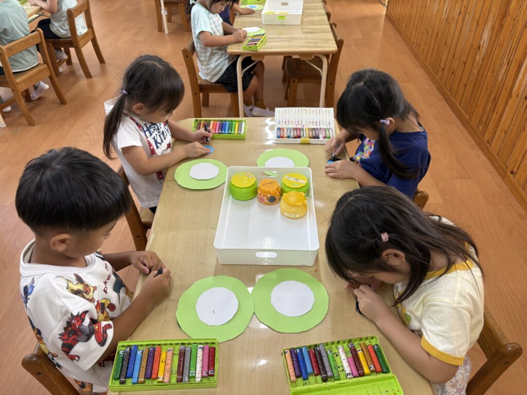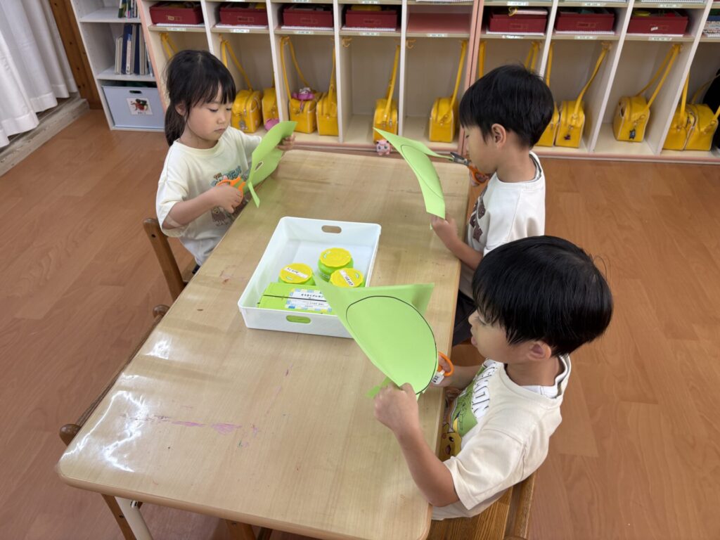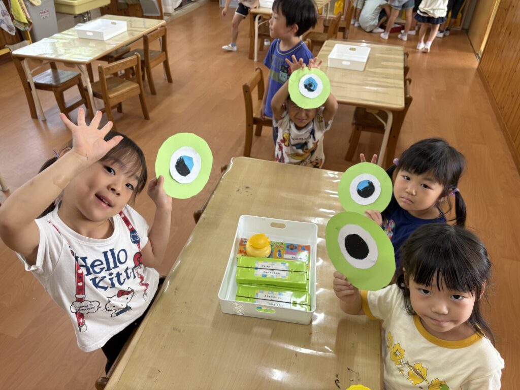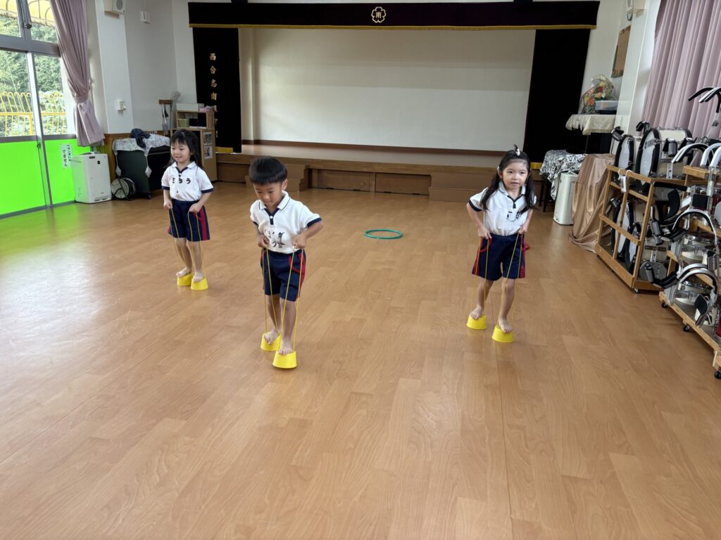 202510.03 ゆり組(R7/10/1、3) ●10/1(水)10月の壁面が完成しました! 丸くハサミで画用紙を切ったり、牛乳パックで絵具を伸ばしたりしましたよ✨ ●10/3(金)今日は、体操教室がありました! 「竹馬」に乗って、バランス感覚を鍛えましたよ💪