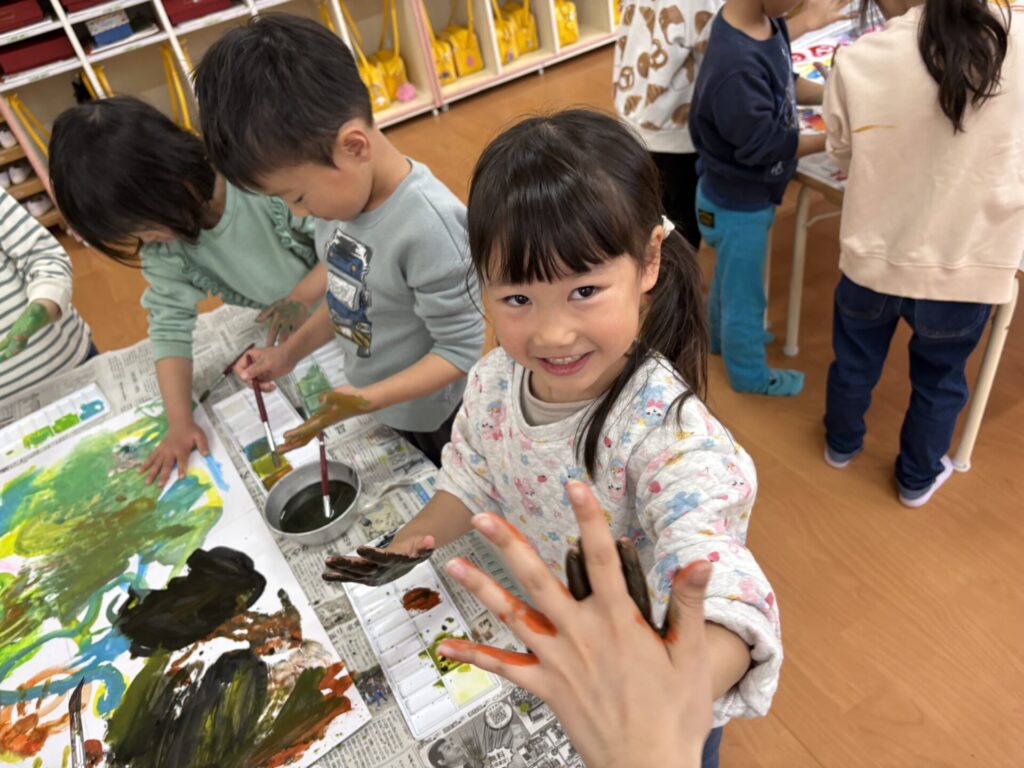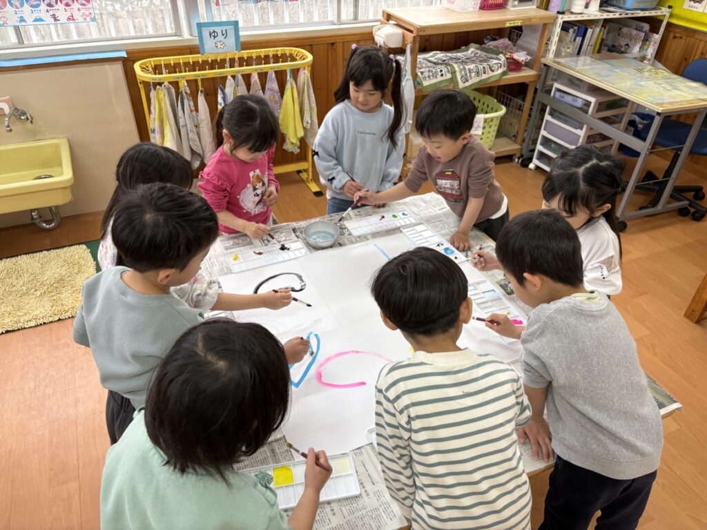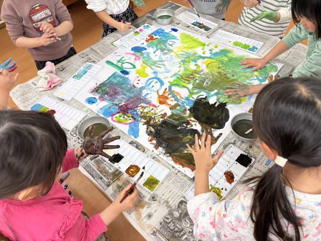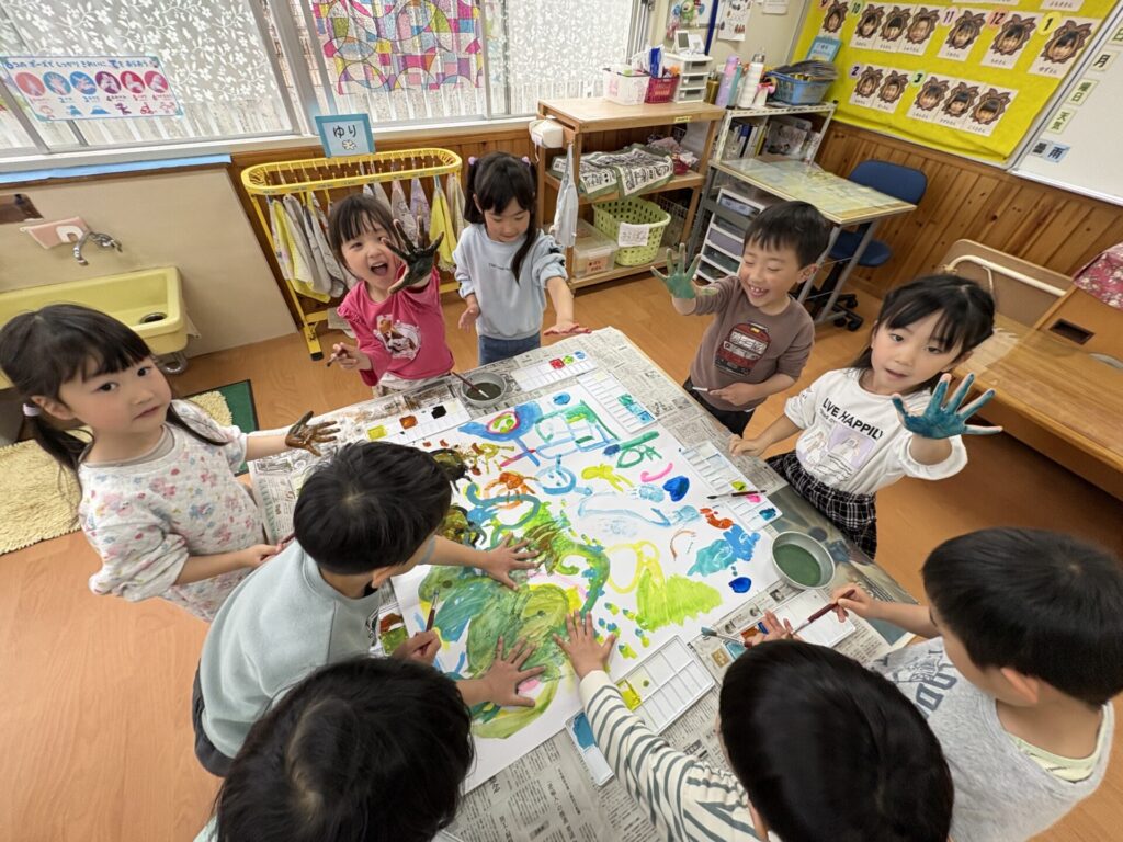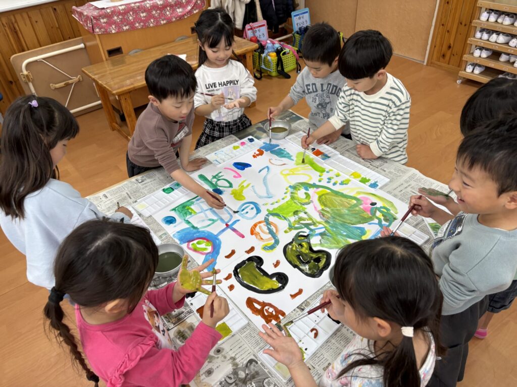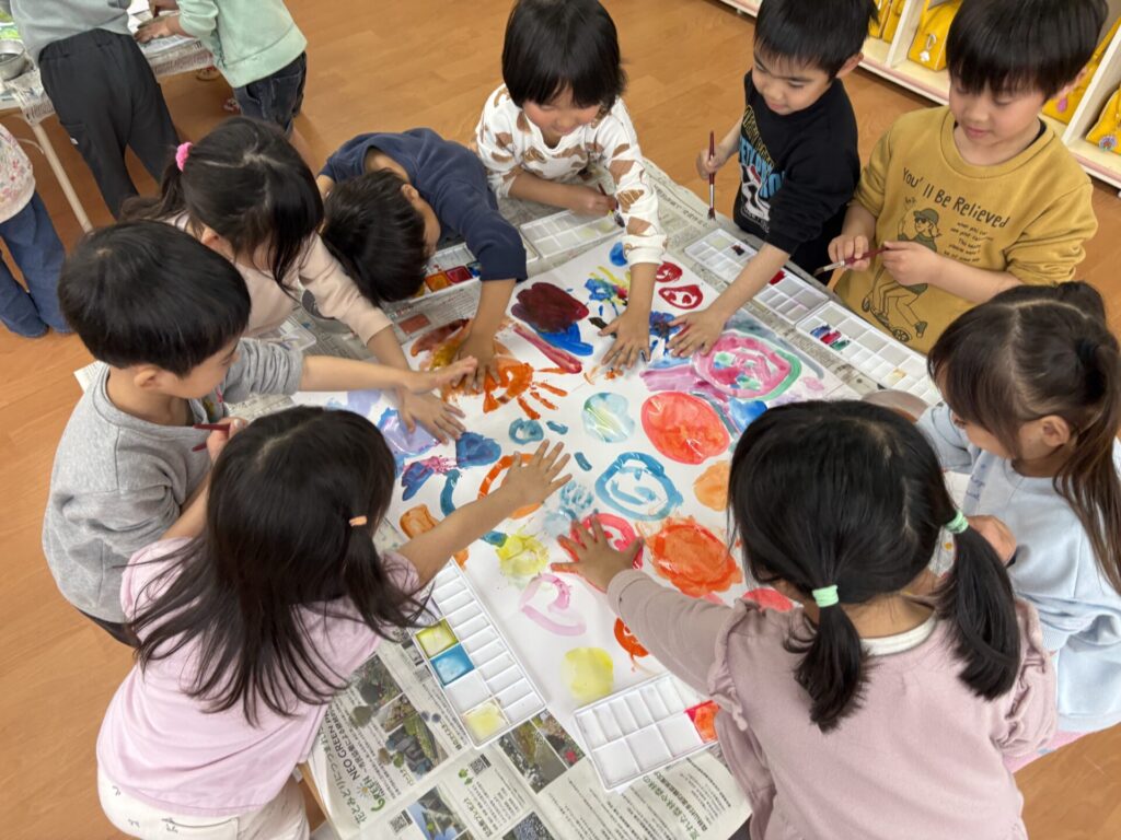 202603.02 ゆり組(絵の具遊び) 先日の発表会、一生懸命頑張った子ども達😁 そんな子どもたちのリクエストに応えて、今日は、絵の具でお絵描きを楽しみました! 大きな画用紙にみんなで色んな絵を描いて、とても楽しんでいましたよ✨😆