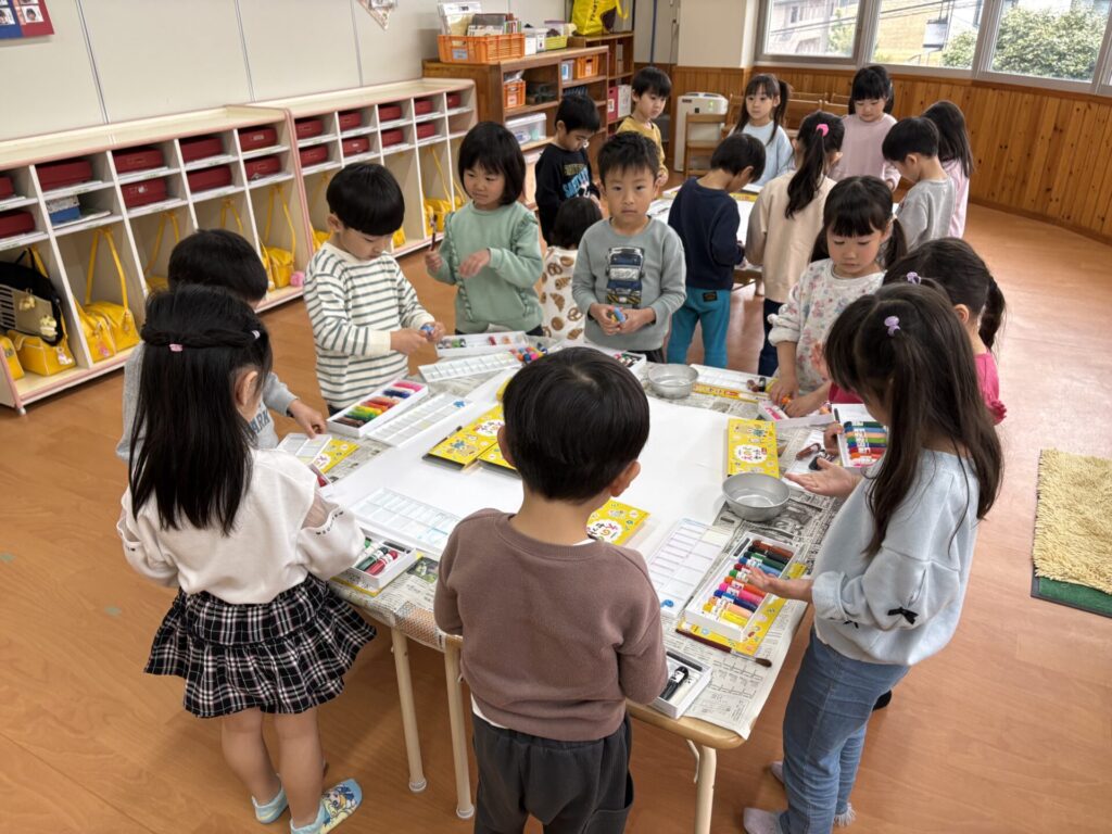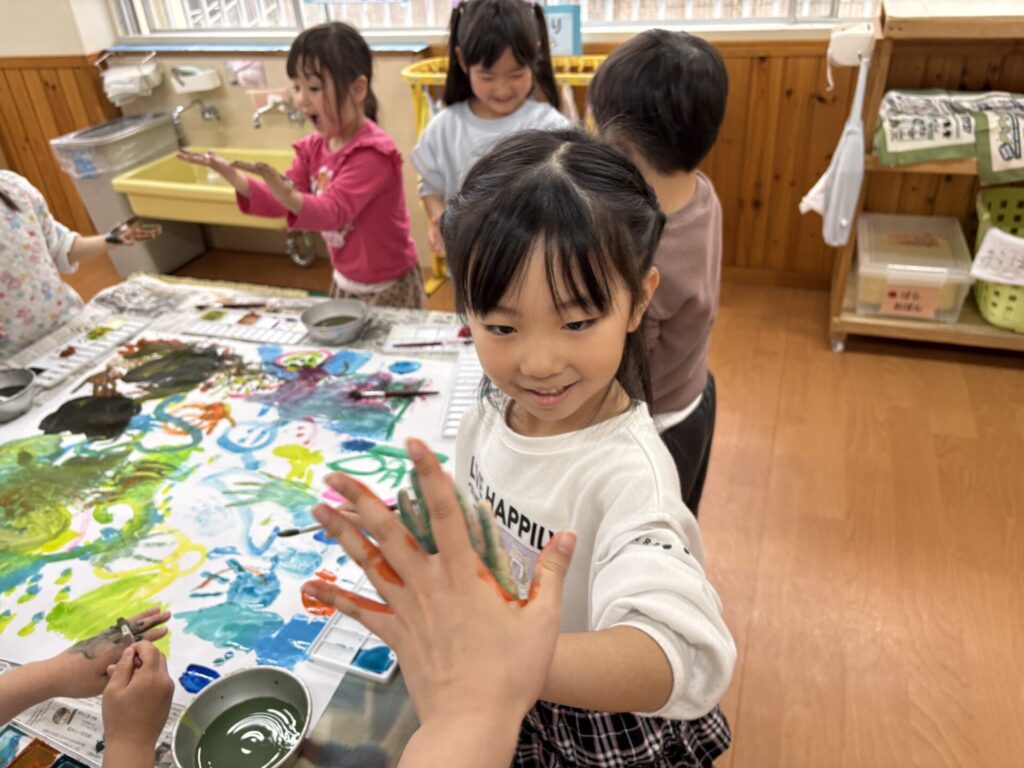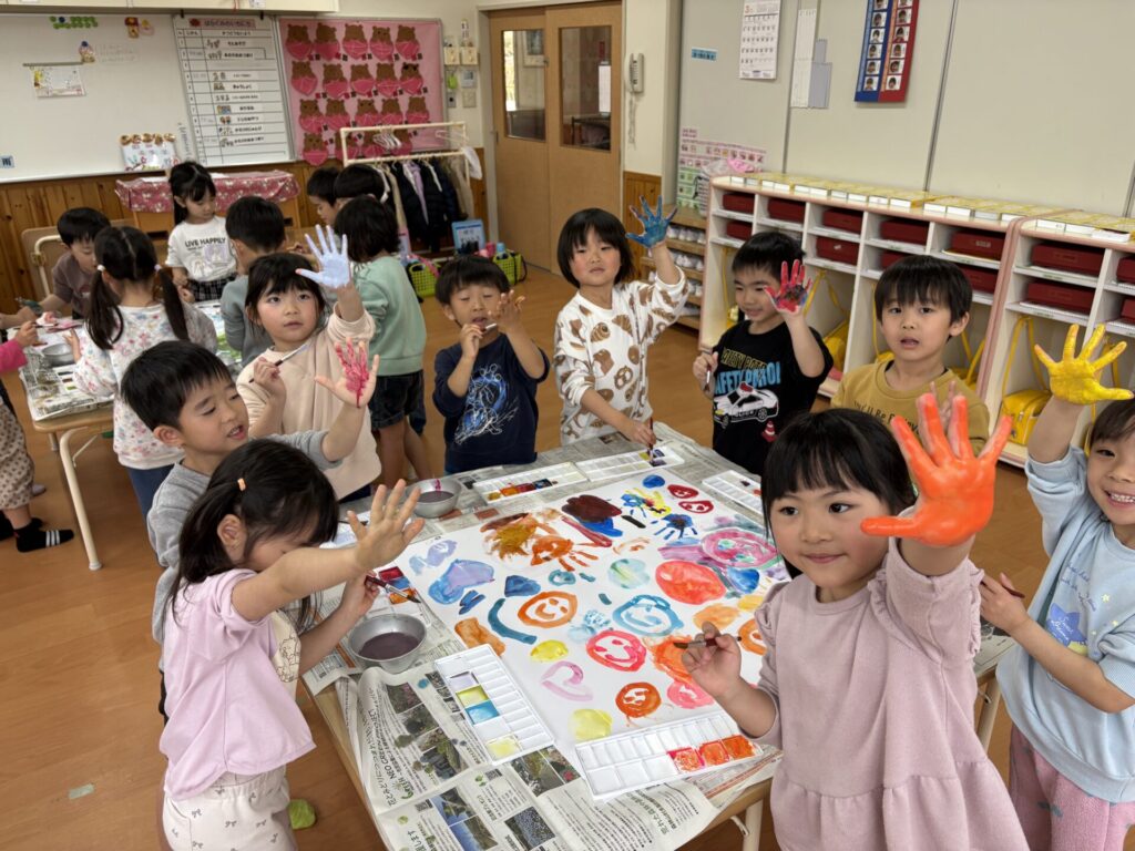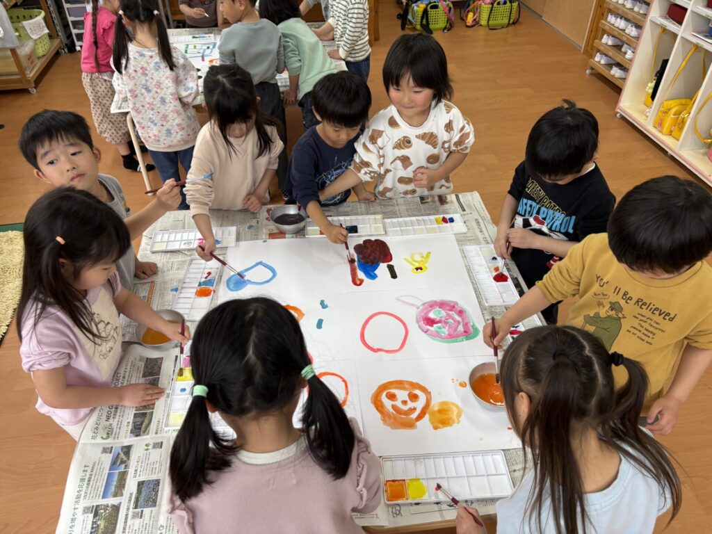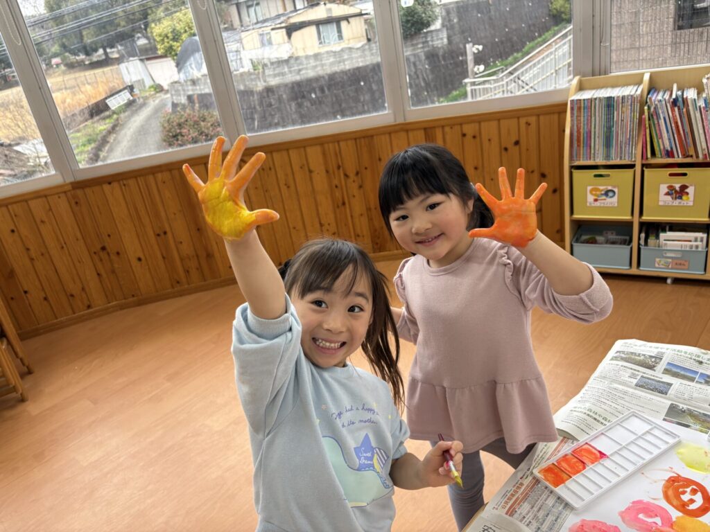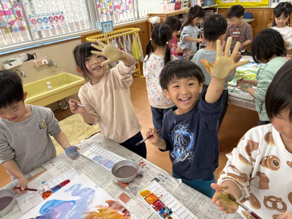 202603.02 ゆり組(絵の具遊び) 先日の発表会、一生懸命頑張った子ども達😁 そんな子どもたちのリクエストに応えて、今日は、絵の具でお絵描きを楽しみました! 大きな画用紙にみんなで色んな絵を描いて、とても楽しんでいましたよ✨😆