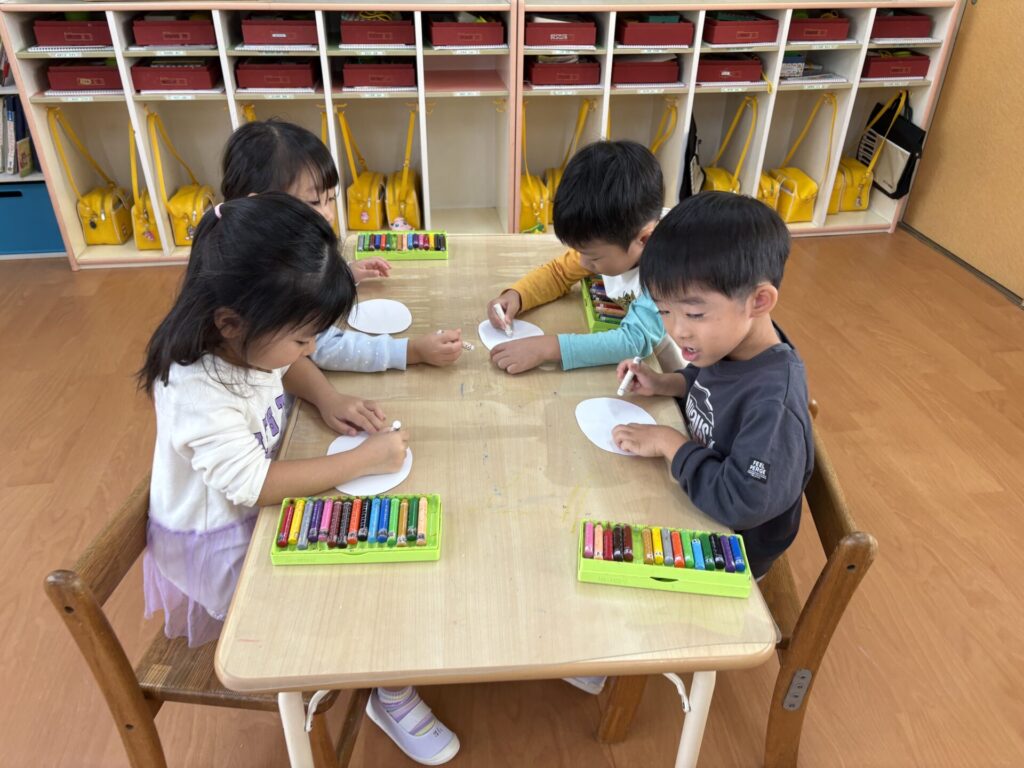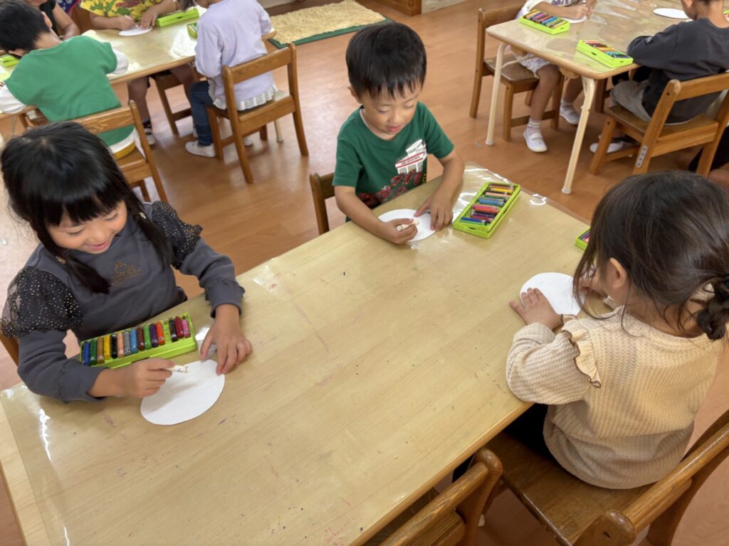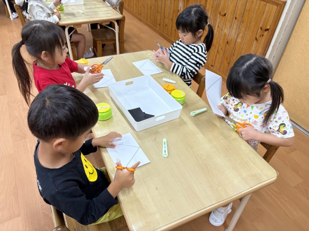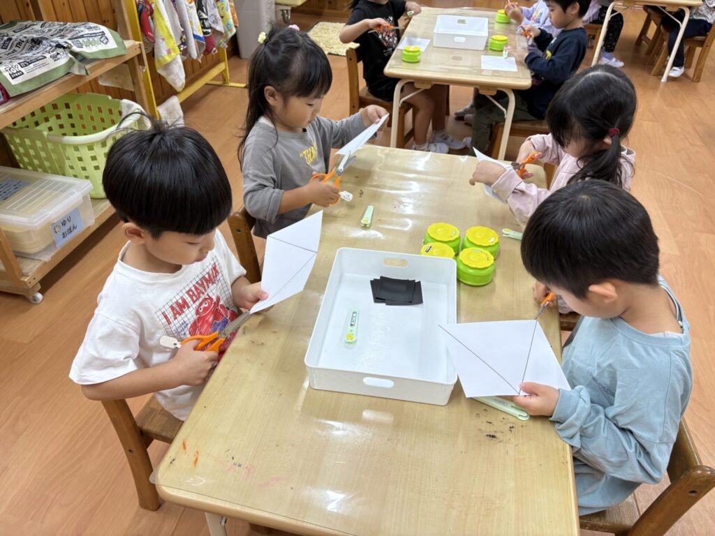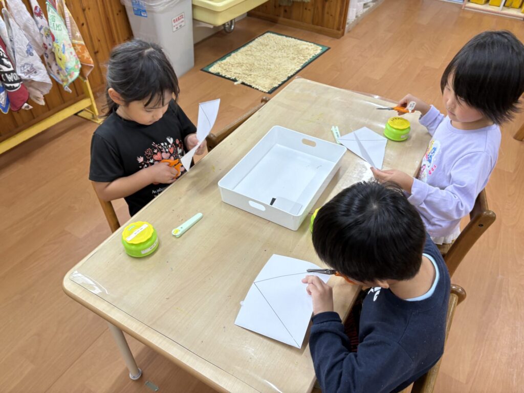 三角形を作るため、ハサミで切ったり、絵の具ではじき絵をしましたよ✨