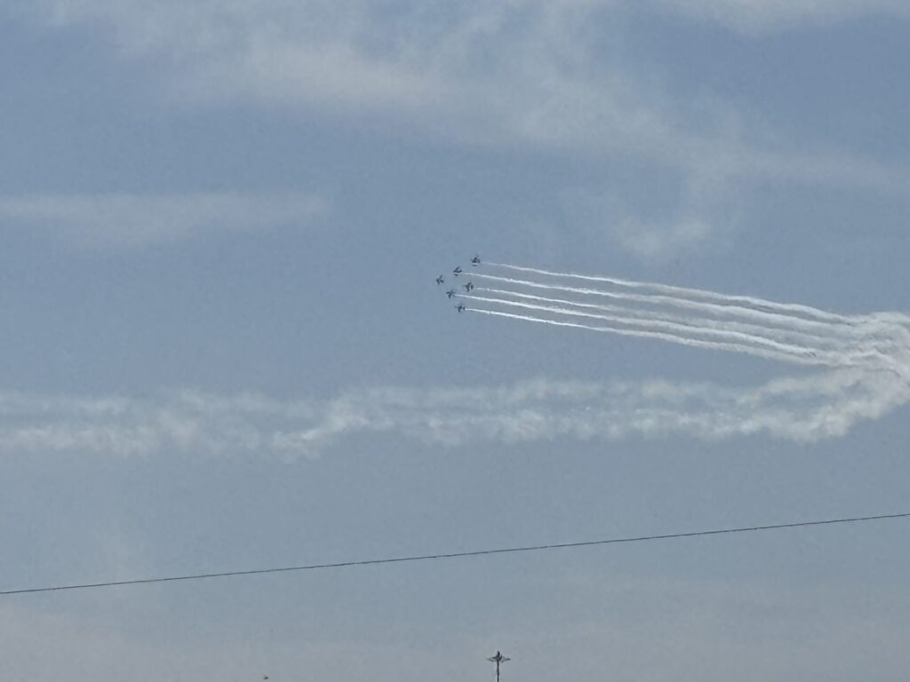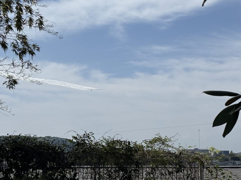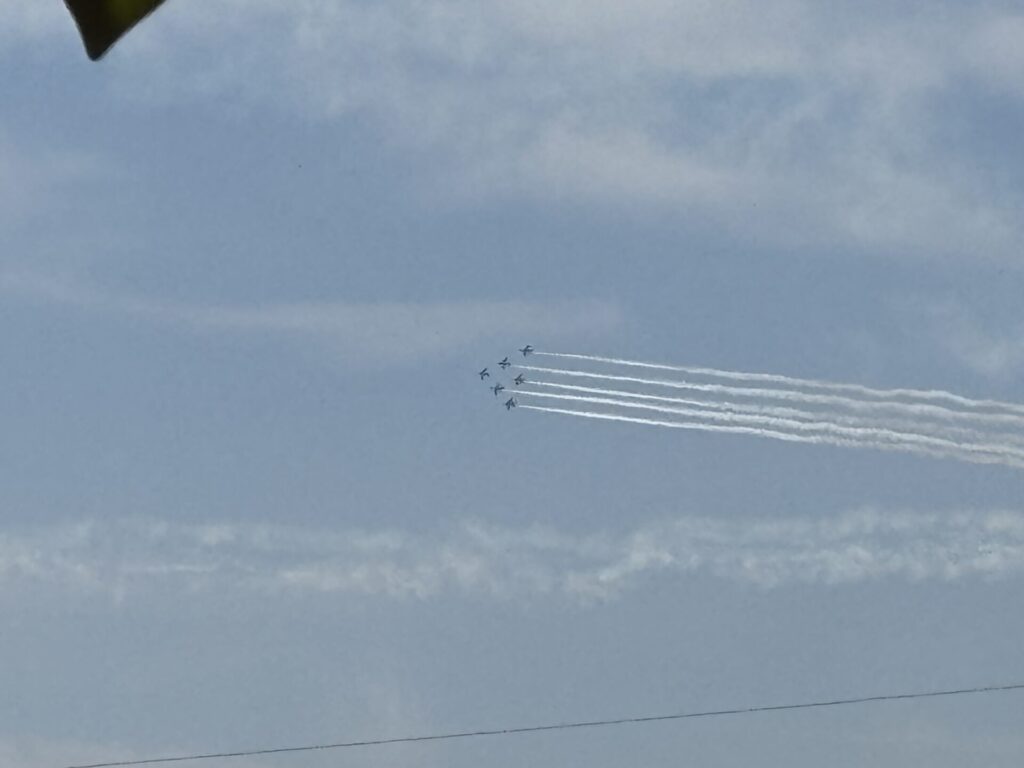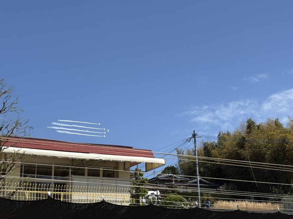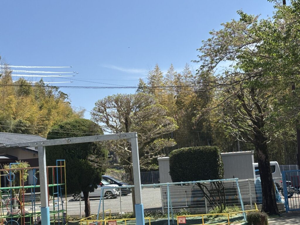 202604.11 ブルーインパルスが見えました! 今日は、ブルーインパルスが熊本に来るということで、11時頃園庭で待っていました。 遠くから音が聞こえてきて、園からもブルーインパルスが見えましたよ✨ 大興奮の子ども達でした😆