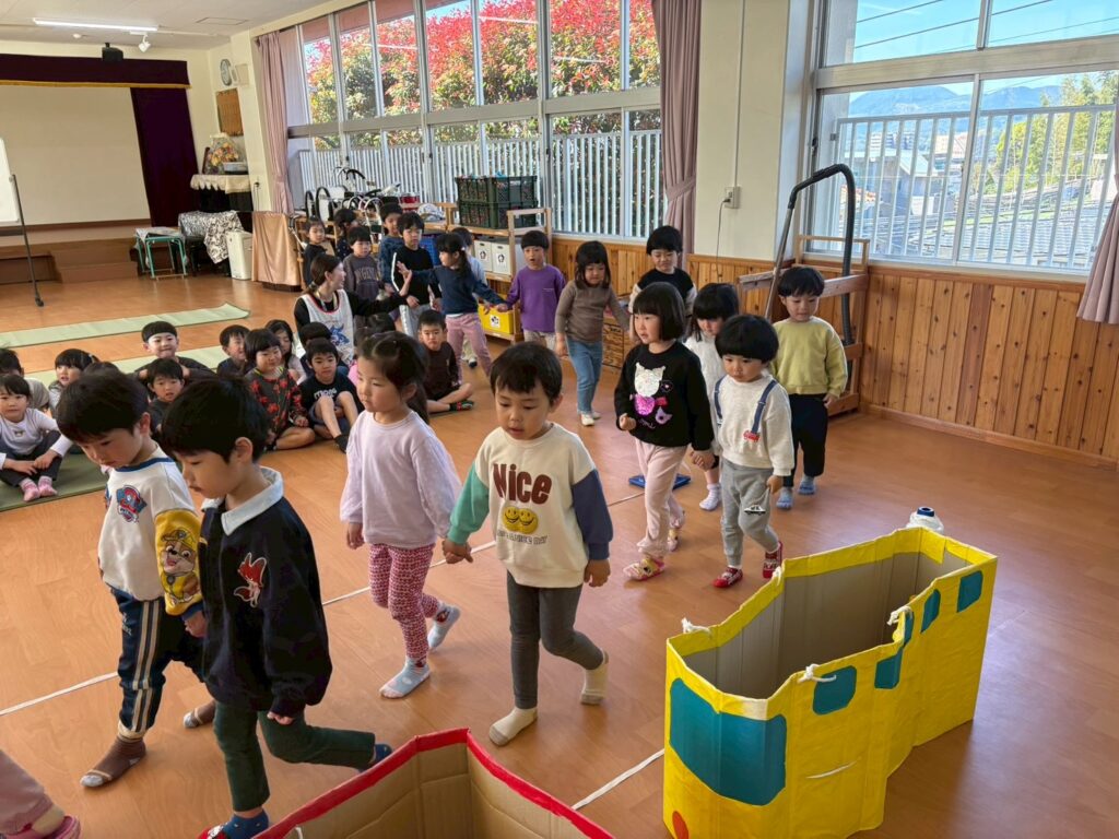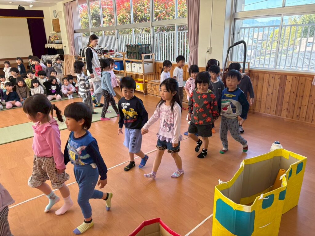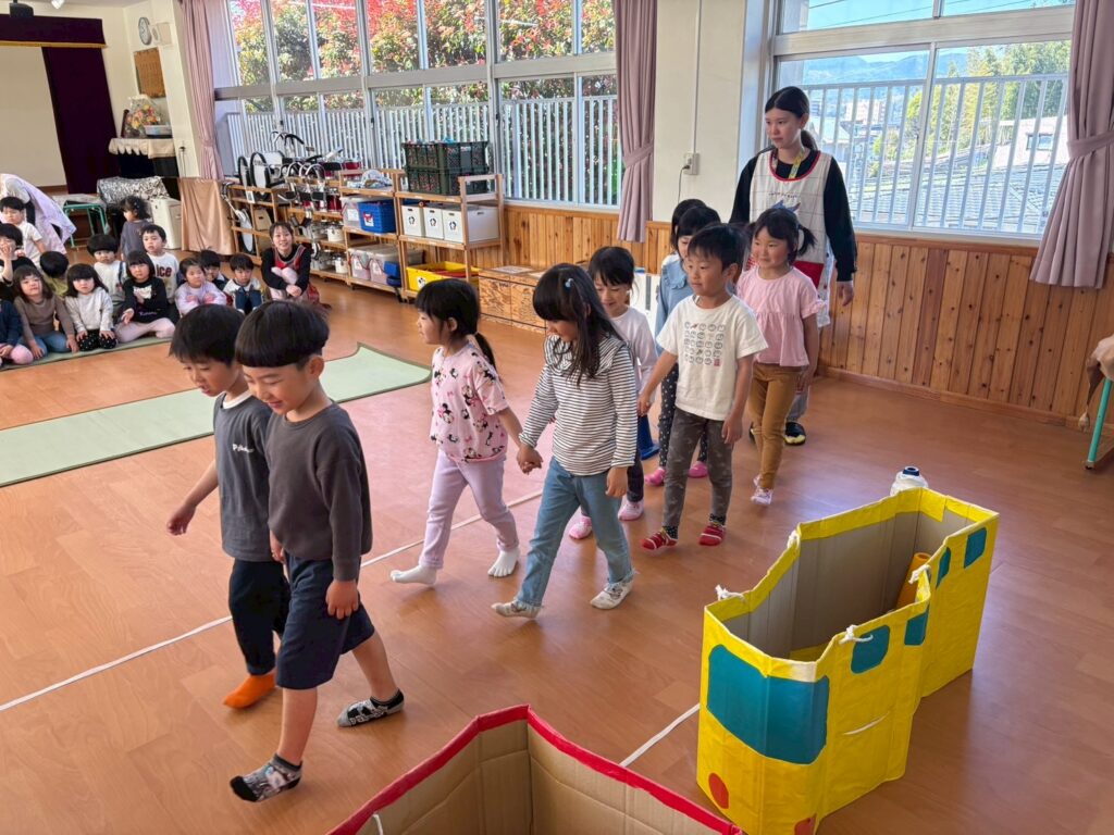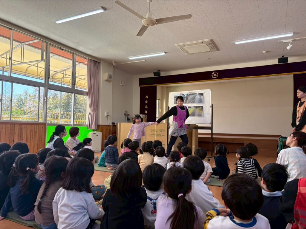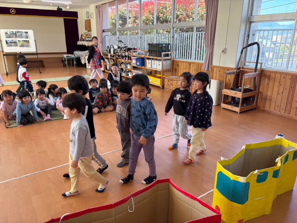 ホールで、道路の安全な歩き方のお話を聞きき、模擬練習をしましたよ💪
