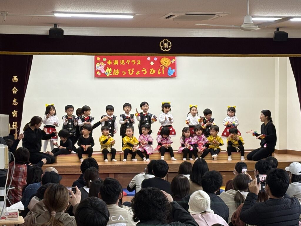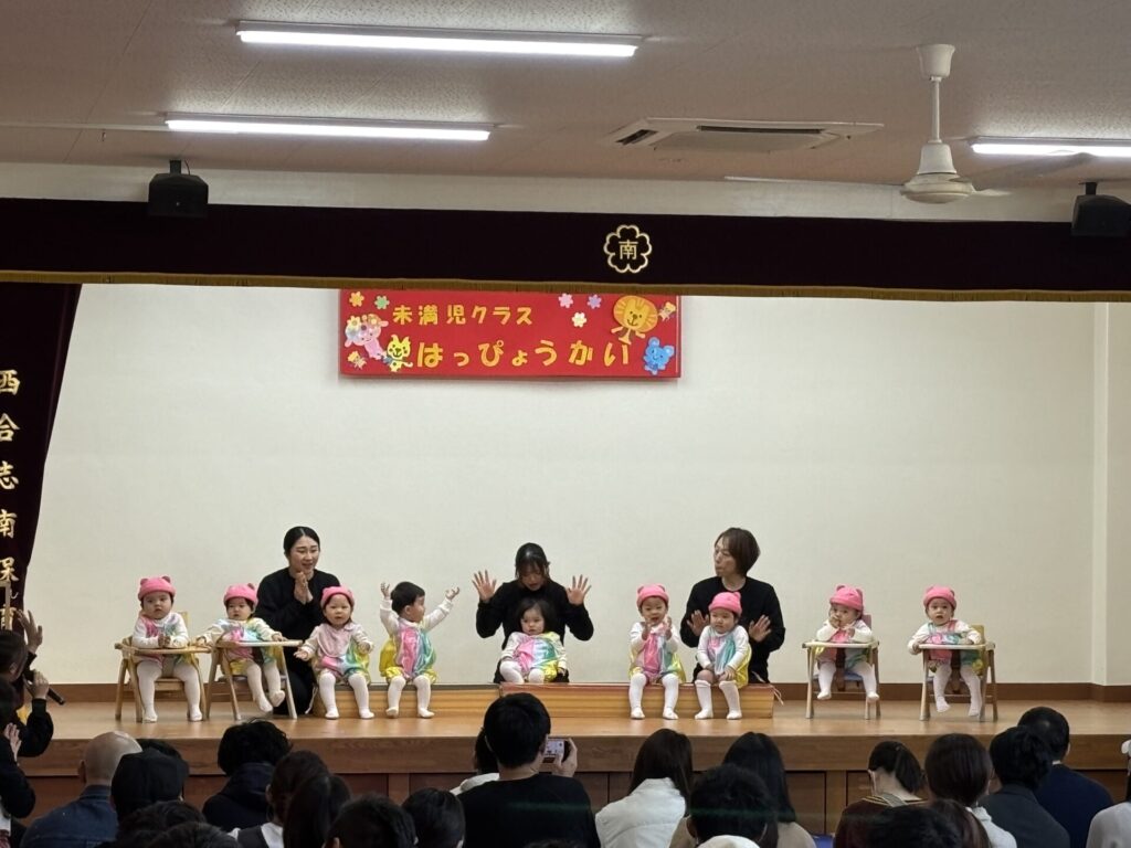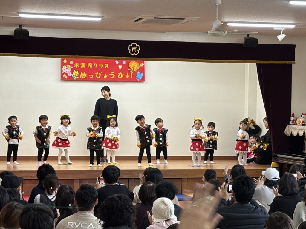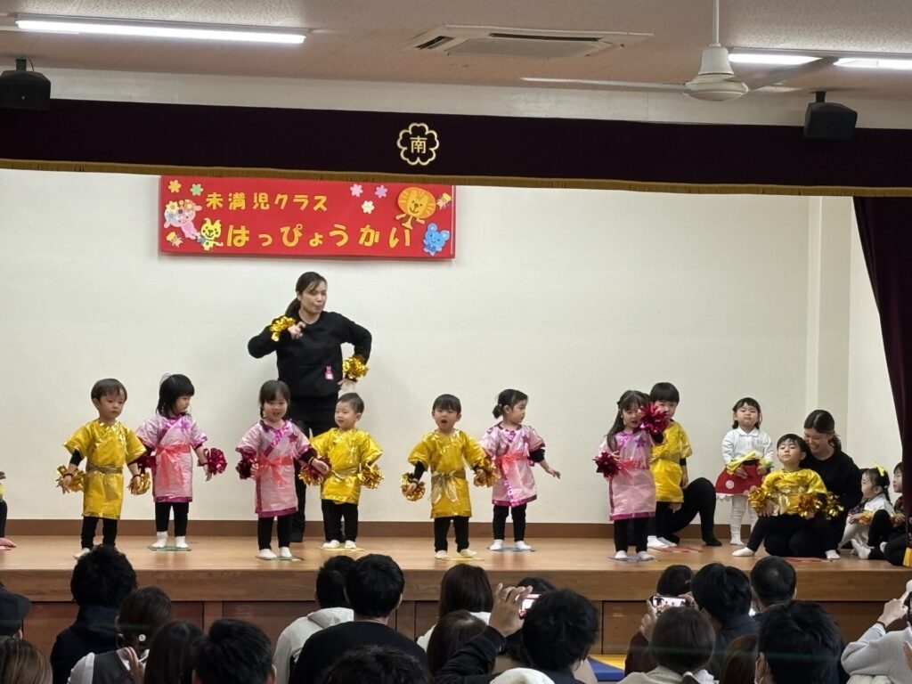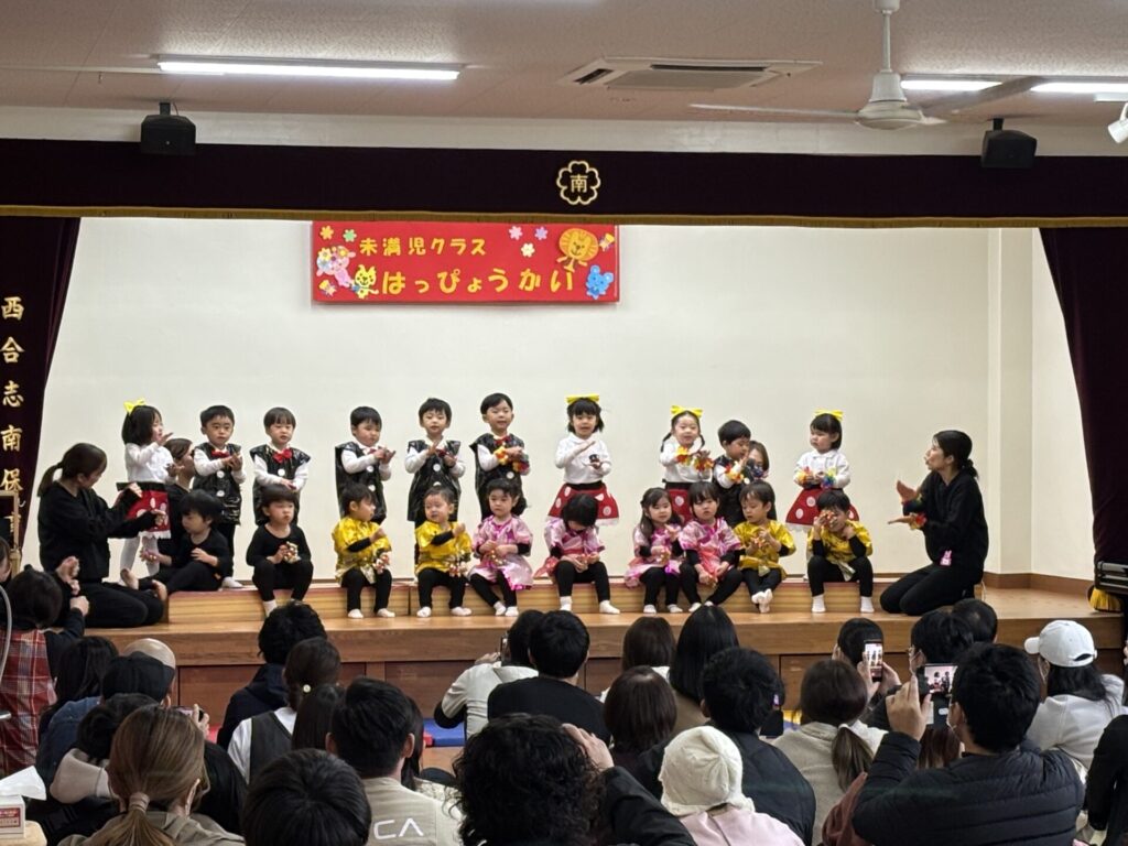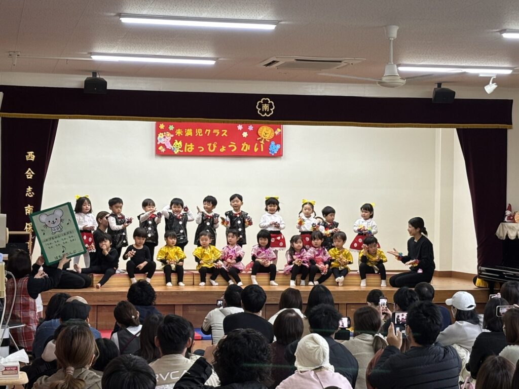 202512.13 未満児クラス発表会 本日は、未満児クラスの発表会でした✨ たくさんの保護者の方に見守られて、いつもとは違う雰囲気に泣き出してしまう子どももいましたが、 踊りやリズム遊びなど一生懸命に表現する姿がとても微笑ましく、 成長を感じられたのではないでしょうか💪 また、すみれ組保護者の皆様、進級説明会&懇談会にもご参加いただき、ありがとうございました。 ●もも0歳児 ●もも1歳児 ●すみれ組 ●すみれ組進級説明会&懇談会