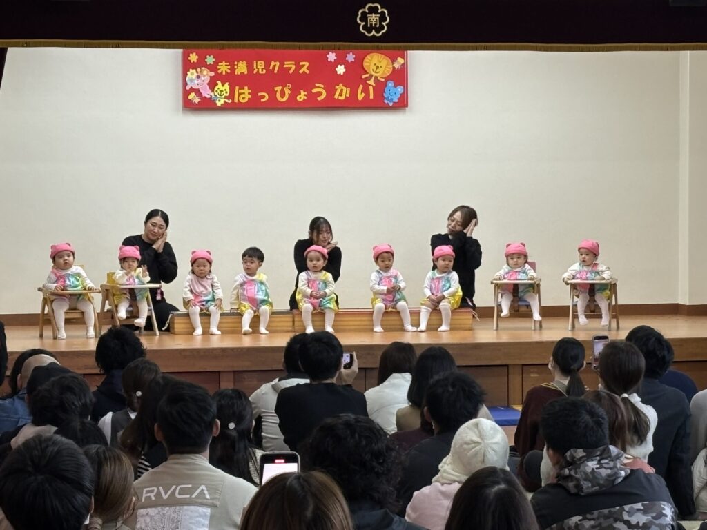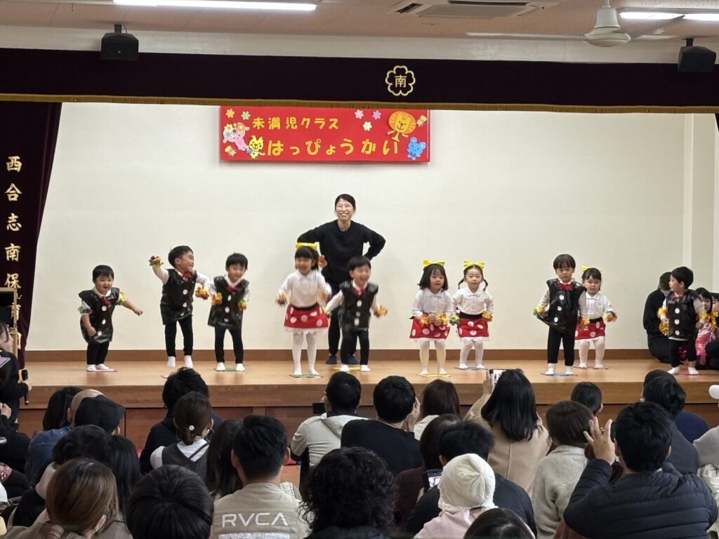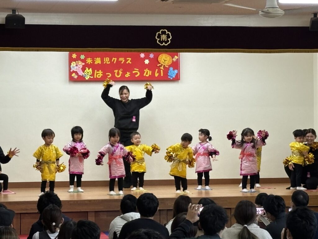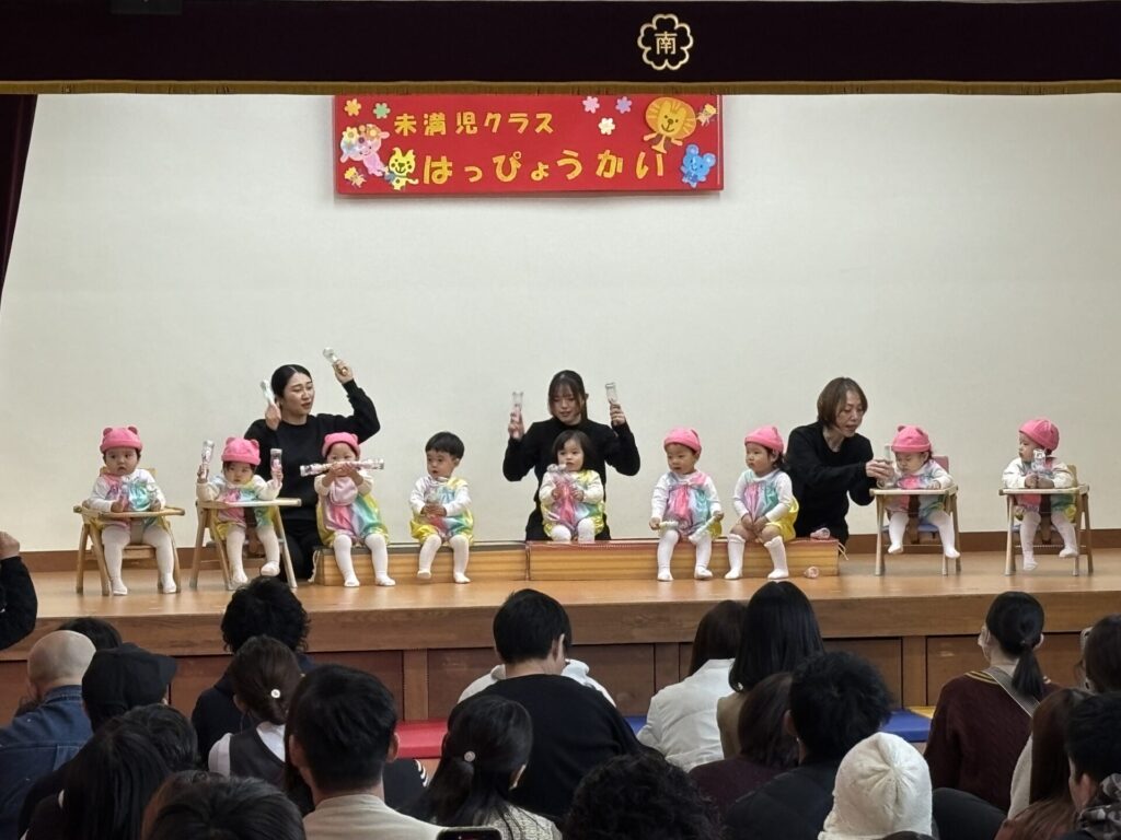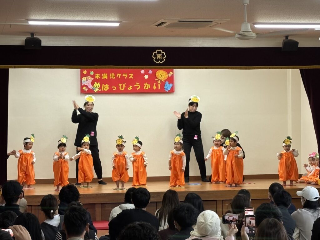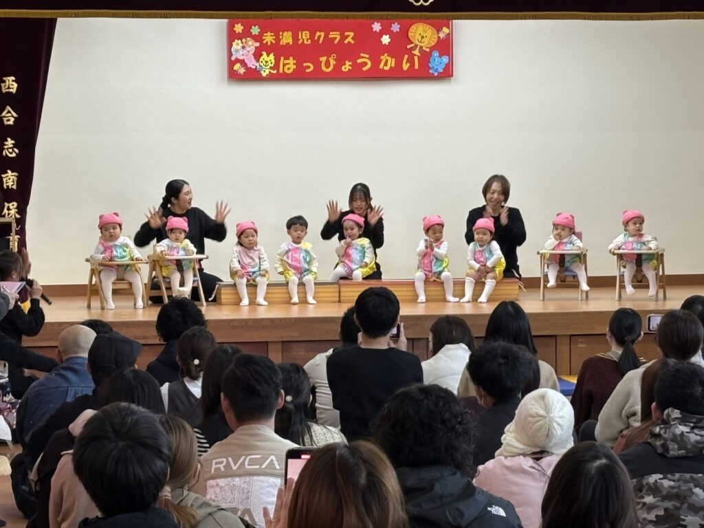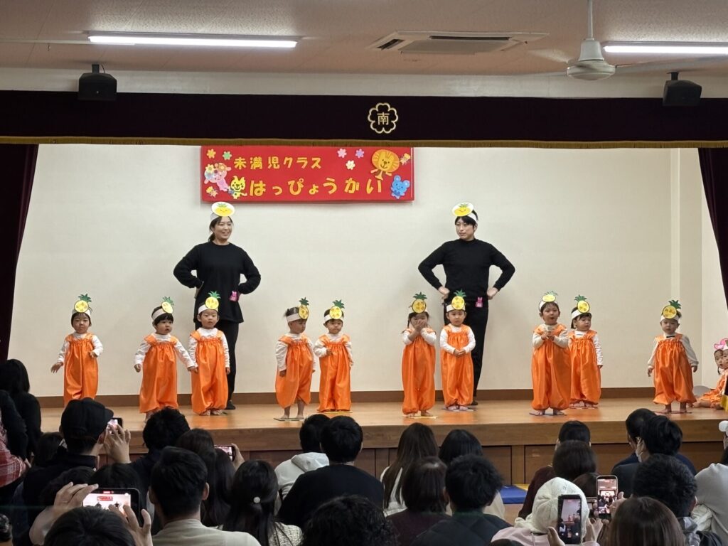 202512.13 未満児クラス発表会 本日は、未満児クラスの発表会でした✨ たくさんの保護者の方に見守られて、いつもとは違う雰囲気に泣き出してしまう子どももいましたが、 踊りやリズム遊びなど一生懸命に表現する姿がとても微笑ましく、 成長を感じられたのではないでしょうか💪 また、すみれ組保護者の皆様、進級説明会&懇談会にもご参加いただき、ありがとうございました。 ●もも0歳児 ●もも1歳児 ●すみれ組 ●すみれ組進級説明会&懇談会