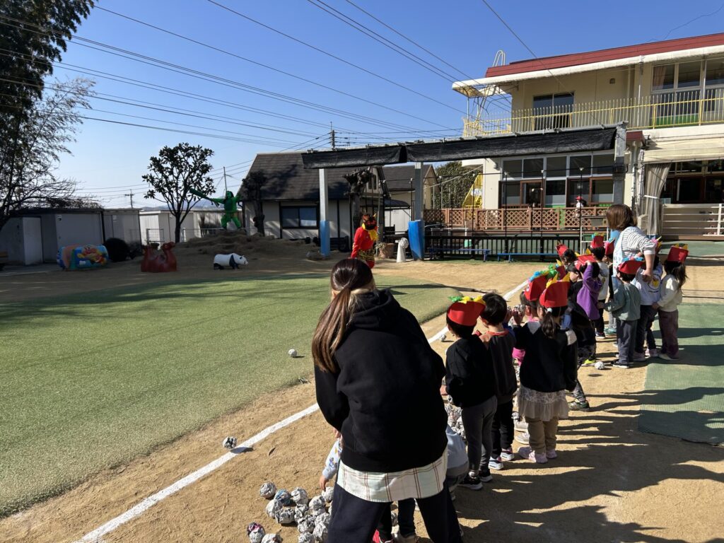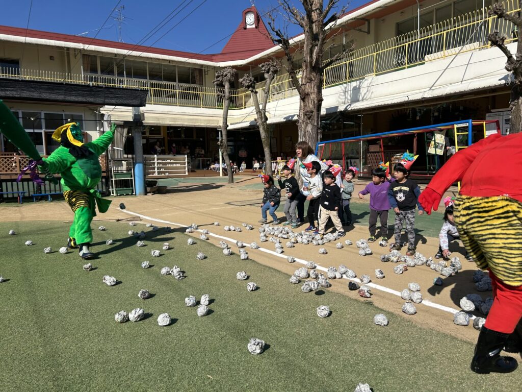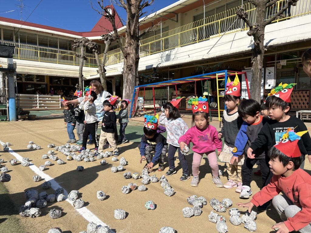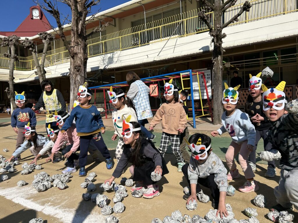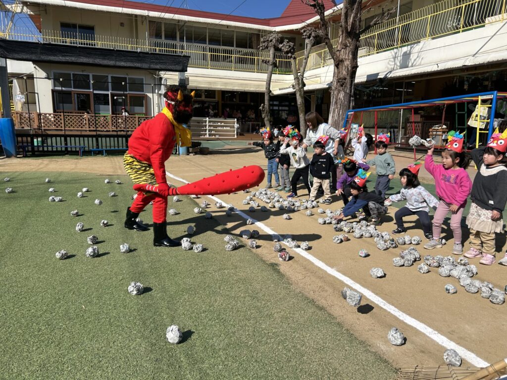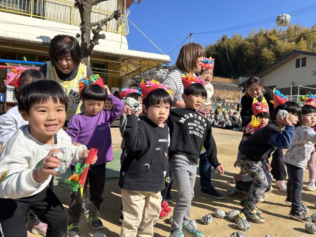 202602.03 豆まき会(以上児)① 今日は、豆まき会でした!ホールで豆まきの由来のお話を聞き、 豆まきの歌を歌ったり、『心の中の鬼』を発表し、どんな鬼をやっつけたいか考えました✨ その後、園庭に鬼が登場!「鬼は外、福は内!」とみんなで力を合わせて鬼をやっつけましたよ😁 ●ホールでのお話 ●園庭の豆まき(さくら組) ●ゆり組