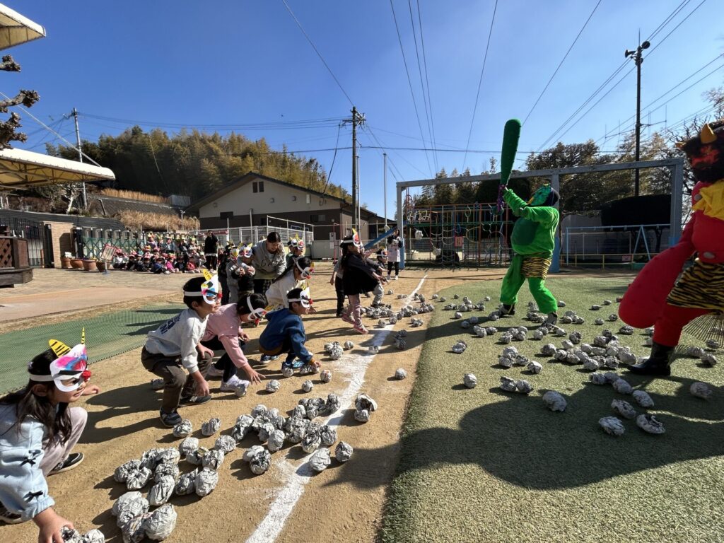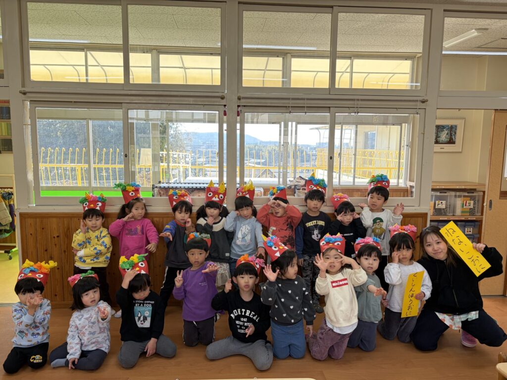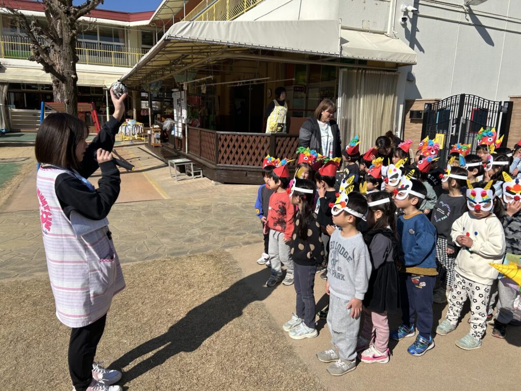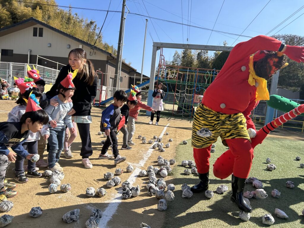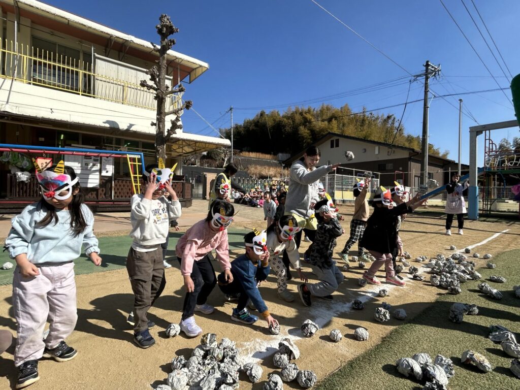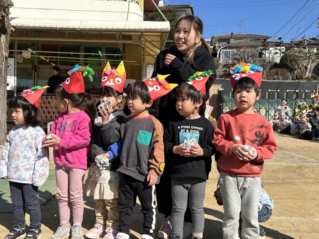 202602.03 豆まき会(以上児)① 今日は、豆まき会でした!ホールで豆まきの由来のお話を聞き、 豆まきの歌を歌ったり、『心の中の鬼』を発表し、どんな鬼をやっつけたいか考えました✨ その後、園庭に鬼が登場!「鬼は外、福は内!」とみんなで力を合わせて鬼をやっつけましたよ😁 ●ホールでのお話 ●園庭の豆まき(さくら組) ●ゆり組