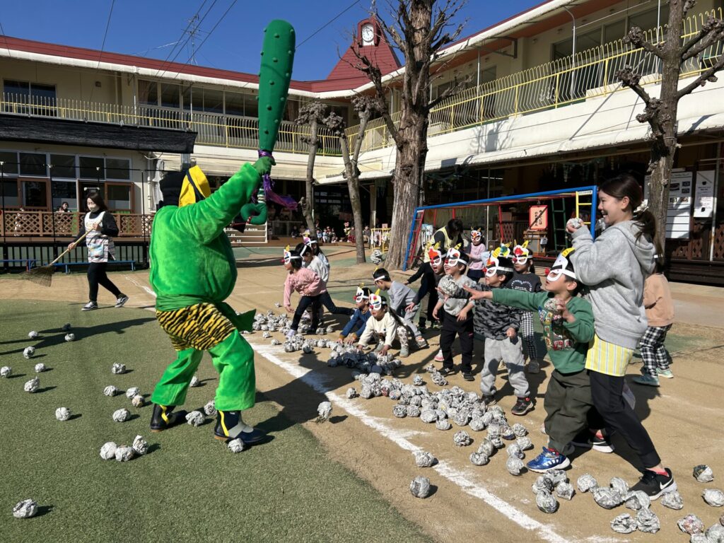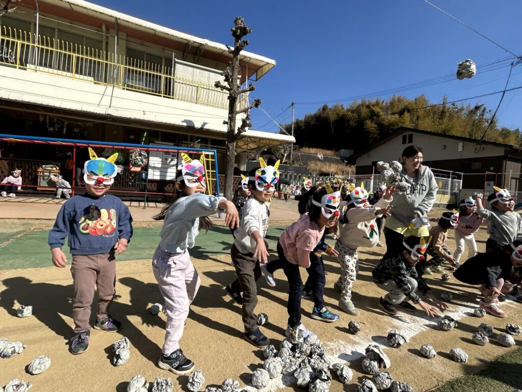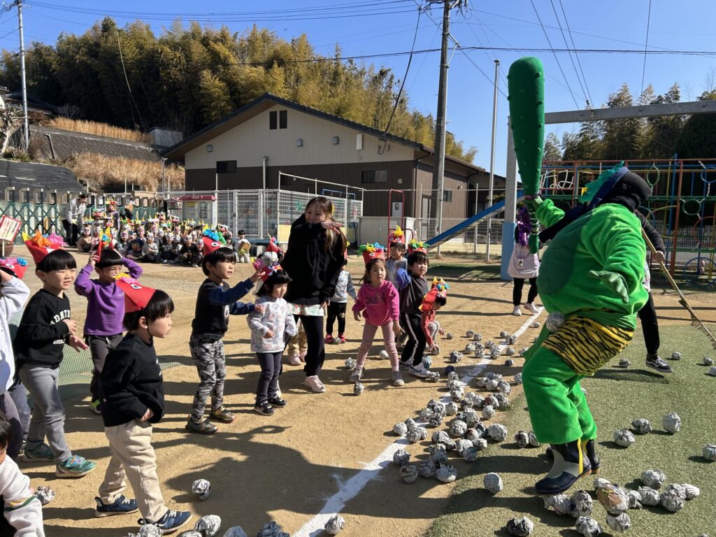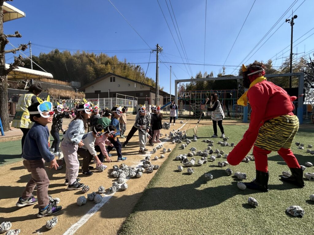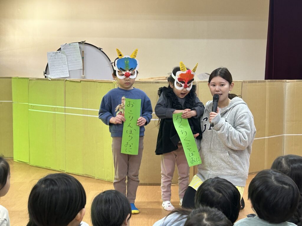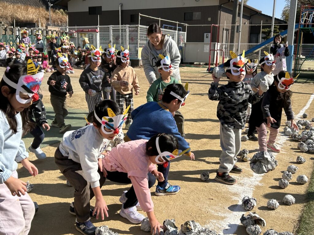 202602.03 豆まき会(以上児)① 今日は、豆まき会でした!ホールで豆まきの由来のお話を聞き、 豆まきの歌を歌ったり、『心の中の鬼』を発表し、どんな鬼をやっつけたいか考えました✨ その後、園庭に鬼が登場!「鬼は外、福は内!」とみんなで力を合わせて鬼をやっつけましたよ😁 ●ホールでのお話 ●園庭の豆まき(さくら組) ●ゆり組